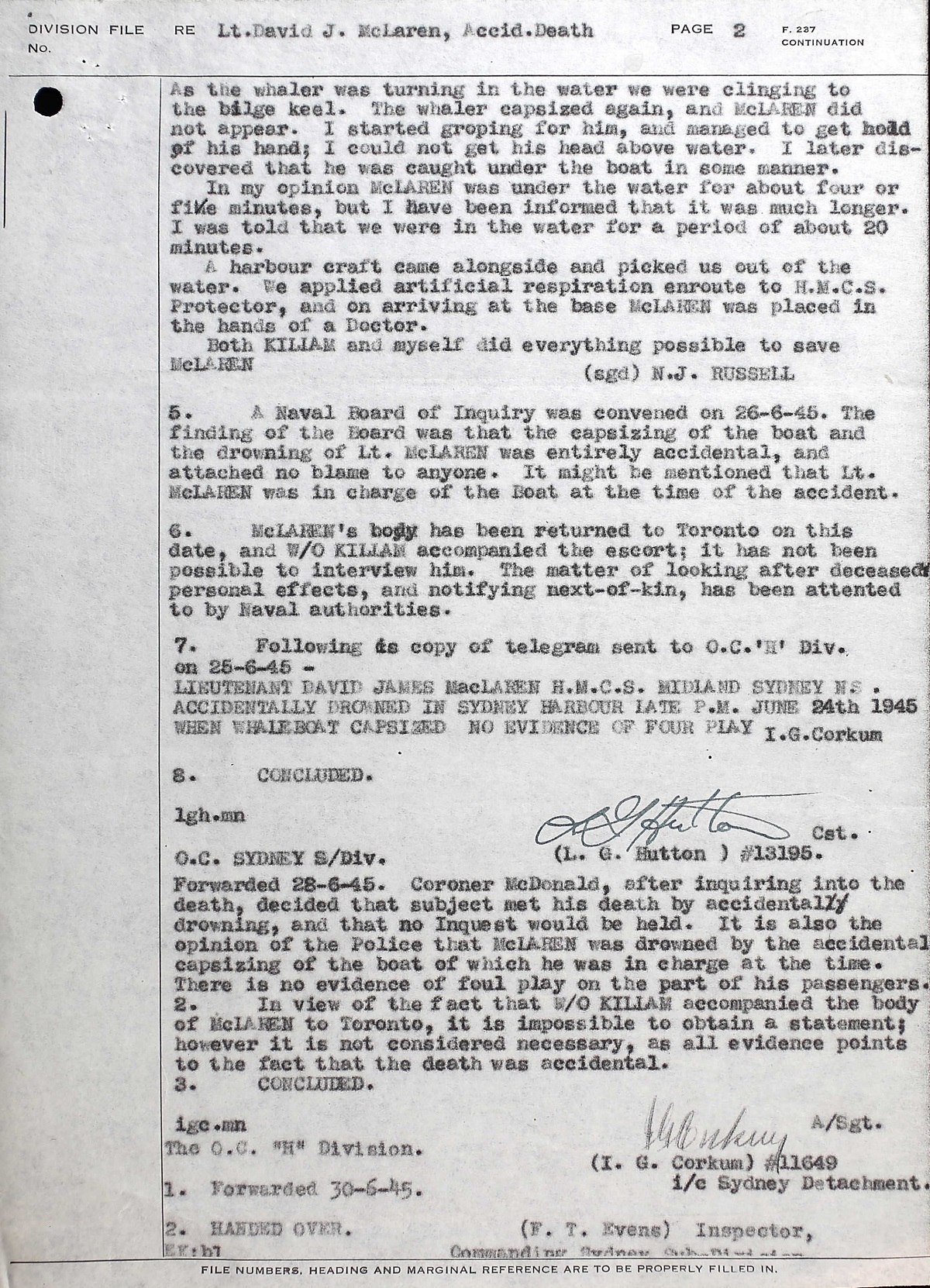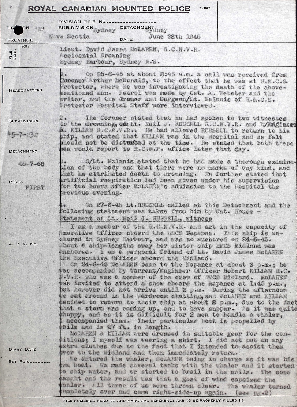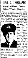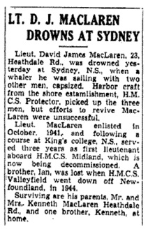 Lieut. David James MacLaren, 23, Heathdale Rd., was drowned yesterday at Sydney, N.S., when a whaler he was sailing with two other men capsized. Harbor craft from the shore establishment, H.M.C.S. Protector, picked up the three men, but efforts to revive MacLaren were unsuccessful. Lieut. MacLaren enlisted in October 1941, and following a course at King's College, N.S. served three years as first lieutenant aboard HMCS MIDLAND, which is now being decommissioned. A brother, Ian, was lost when HMCS VALLEYFIELD went down off Newfoundland in 1944. Surviving are his parents, Mr. and Mrs. Kenneth MacLaren, Heathdale Rd. and one brother, Kenneth, at home.