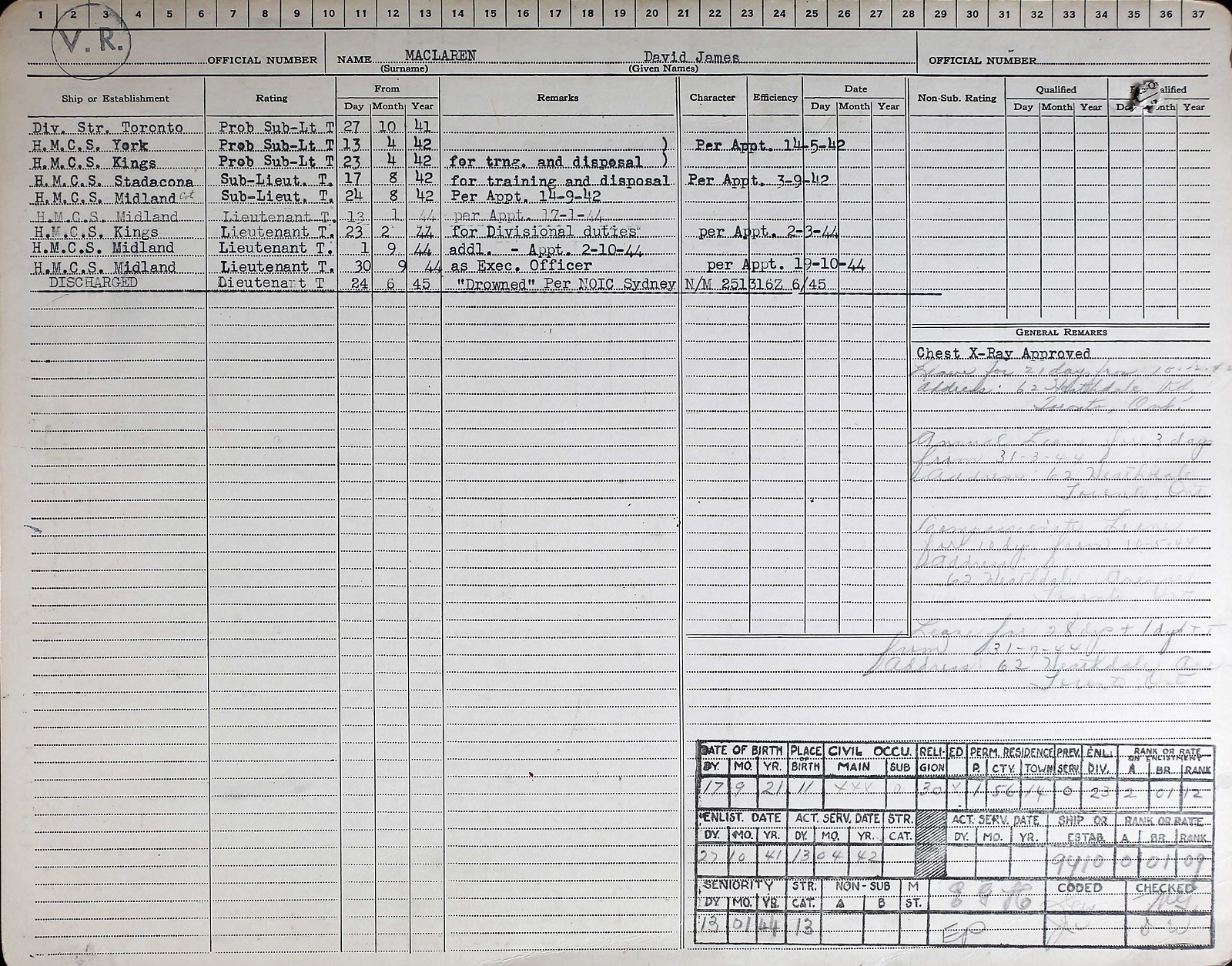 Ships served in: RCNVR DIVISION TORONTO - Enlisted 27 Oct 1941 as a Prob SLt, RCNVR HMCS YORK - Served in YORK 13 Apr 1942 - 22 Apr 1942 as a Prob SLt, RCNVR HMCS KINGS - Served in KINGS - 23 Apr 1942 - 16 Aug 1942 as a Prob SLt, RCNVR HMCS STADACONA - Served in STADACONA - 17 Aug 1942 - 23 Aug 1942 as a SLt, RCNVR HMCS MIDLAND - Served in MIDLAND 24 Aug 1942 - 22 Feb 1944 as a SLt and Lt, RCNVR. Appointed to Lt 13 Jan 1944 HMCS KINGS - Served in KINGS 23 Feb 1944 - 31 Aug 1944 For Divisional Duties as a Lt, RCNVR HMCS MIDLAND - Appointed to Midland 01 Sep 1944 as a Lt, RCNVR, Additional. Appointed XO 30 Sep 1944