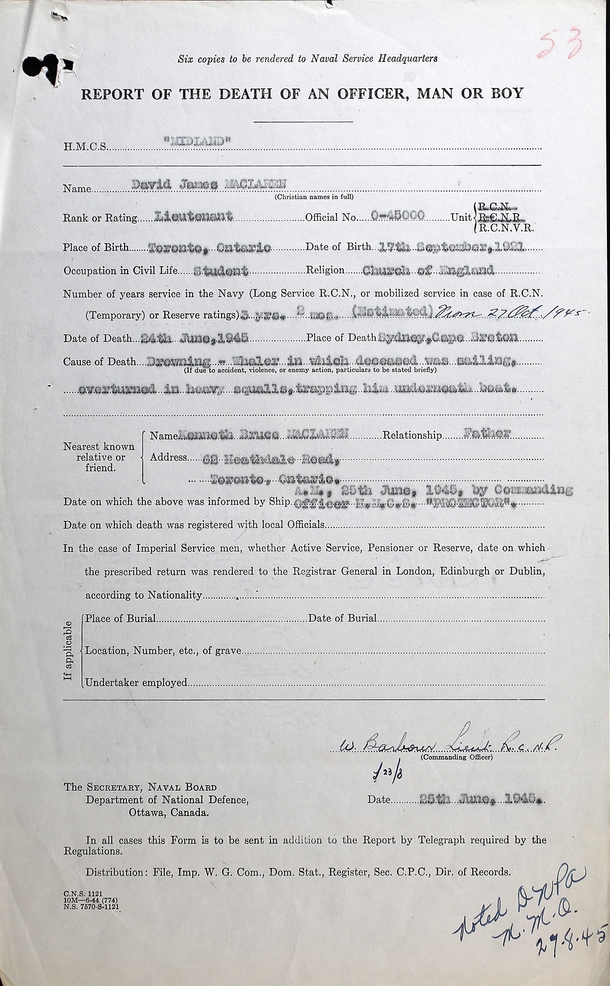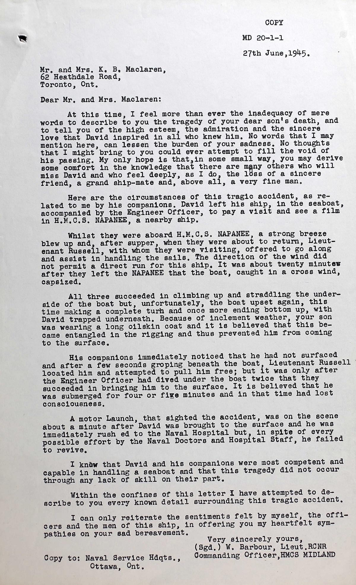 (DM06) Report of Death (DM07) Letter to Lt MacLaren's parents from Lt W. Barbour, CO of HMCS MIDLAND, on their son's death (DM08-DM09) Newspaper articles from the Toronto Star 1945 on the death of Lt MacLaren
