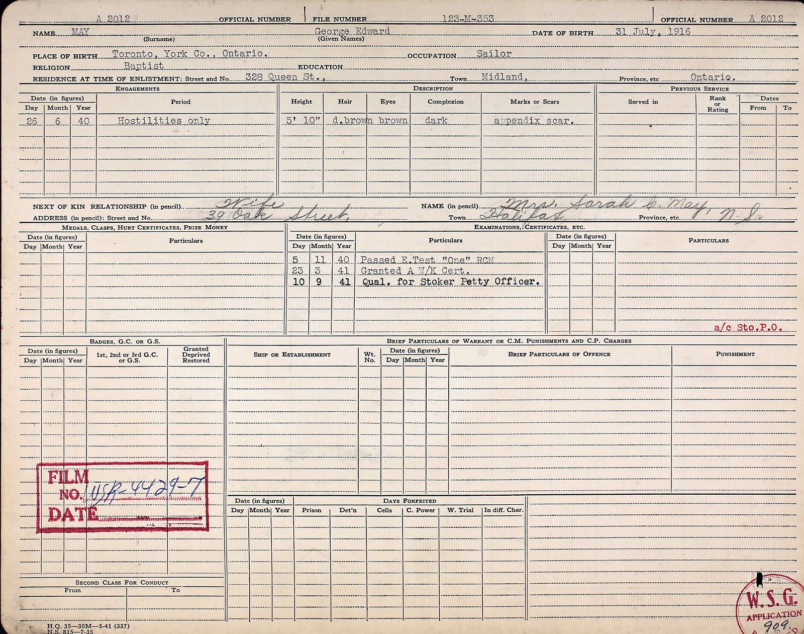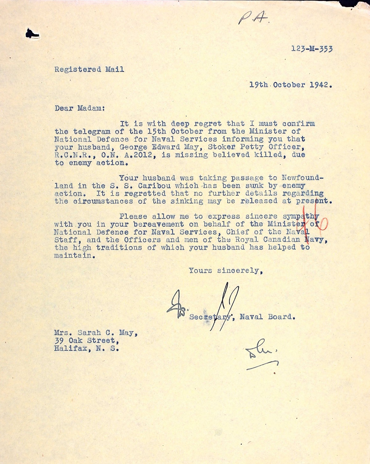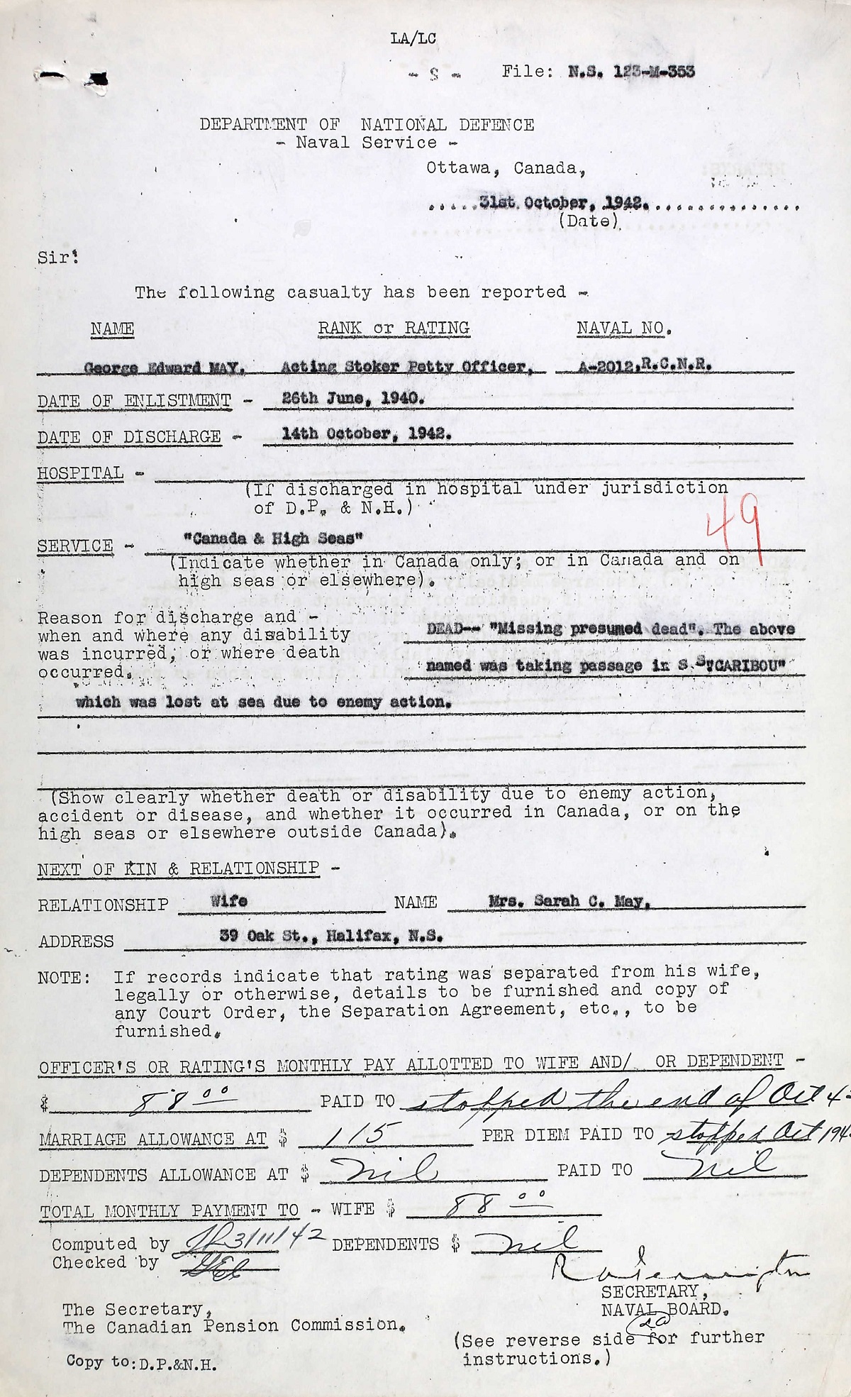 Stoker Petty Officer G. E. May was killed when the ferry SS CARIBOU was sunk on October 14, 1942. He was a passage and was heading back to his ship HMCS MORDEN after shore leave.