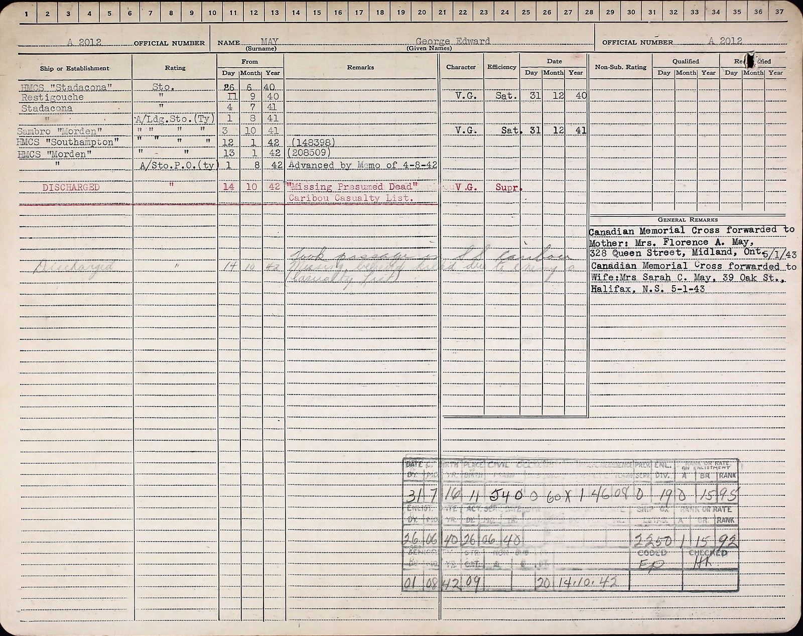 MAY, George Edward, Stoker Petty Officer, RCNR, MPK - 14 Oct 1942, SS CARIBOU / HMCS MORDEN - Son of Sgt. G. H. and Florence Ada May, Midland, ON; husband of Catherine May, Halifax, NS.