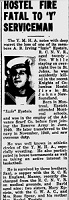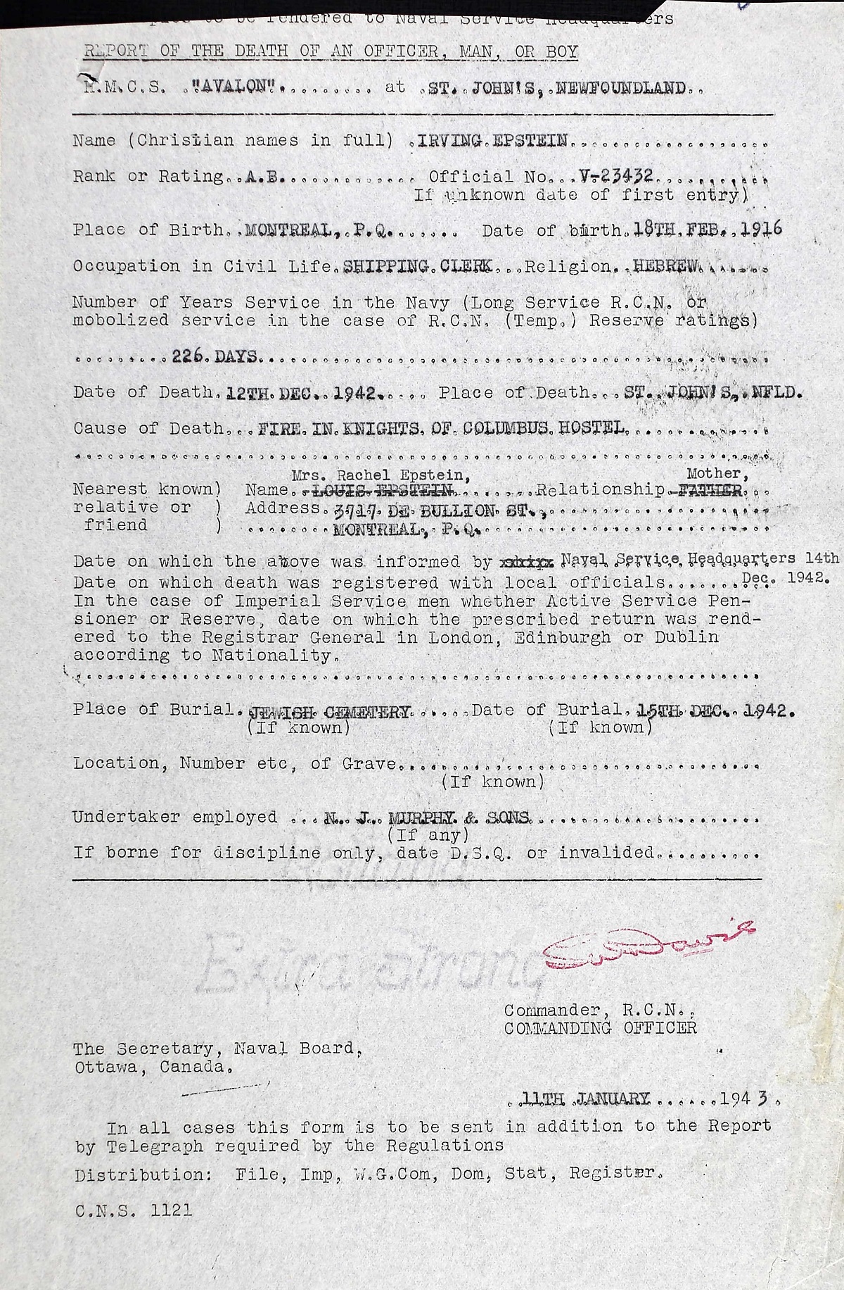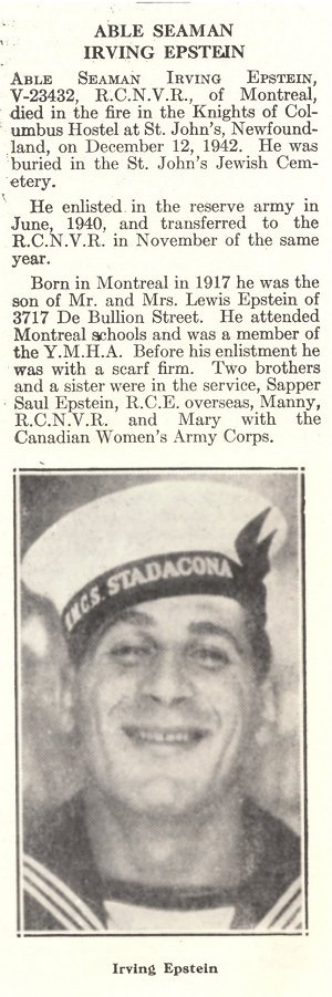 AB Irving Epstein of Montréal, died in the fire in the Knights of Columbus Hostel at St. John's, Newfoundland, on December 12, 1942. He was buried in the Jewish Cemetery, St. John's, Newfoundland