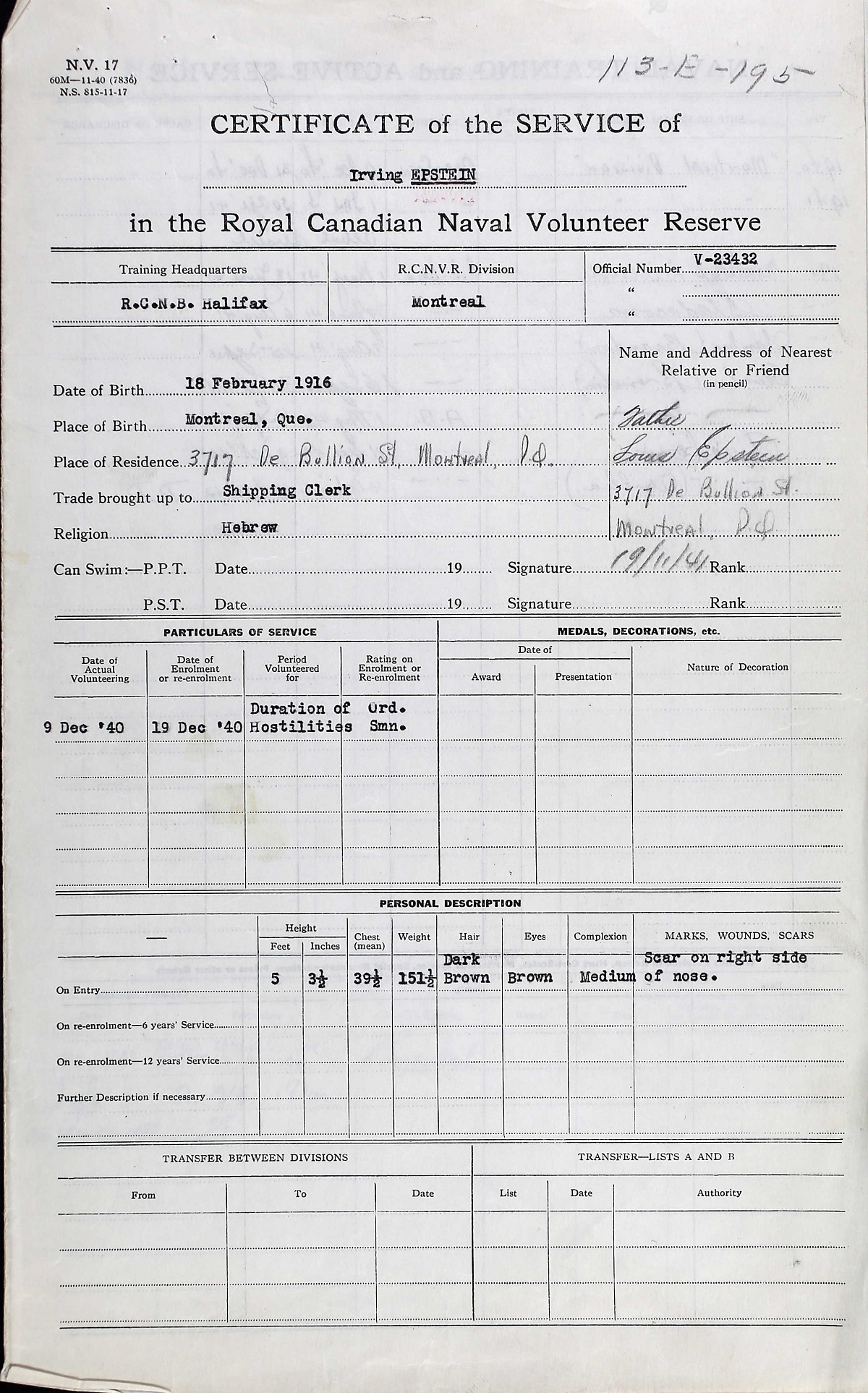 EPSTEIN, Irving, AB, V23432, RCNVR, Killed - 12 Dec 1942, HMCS ORILLIA - Son of Louis and Rachel Epstein, of Montreal, QC.