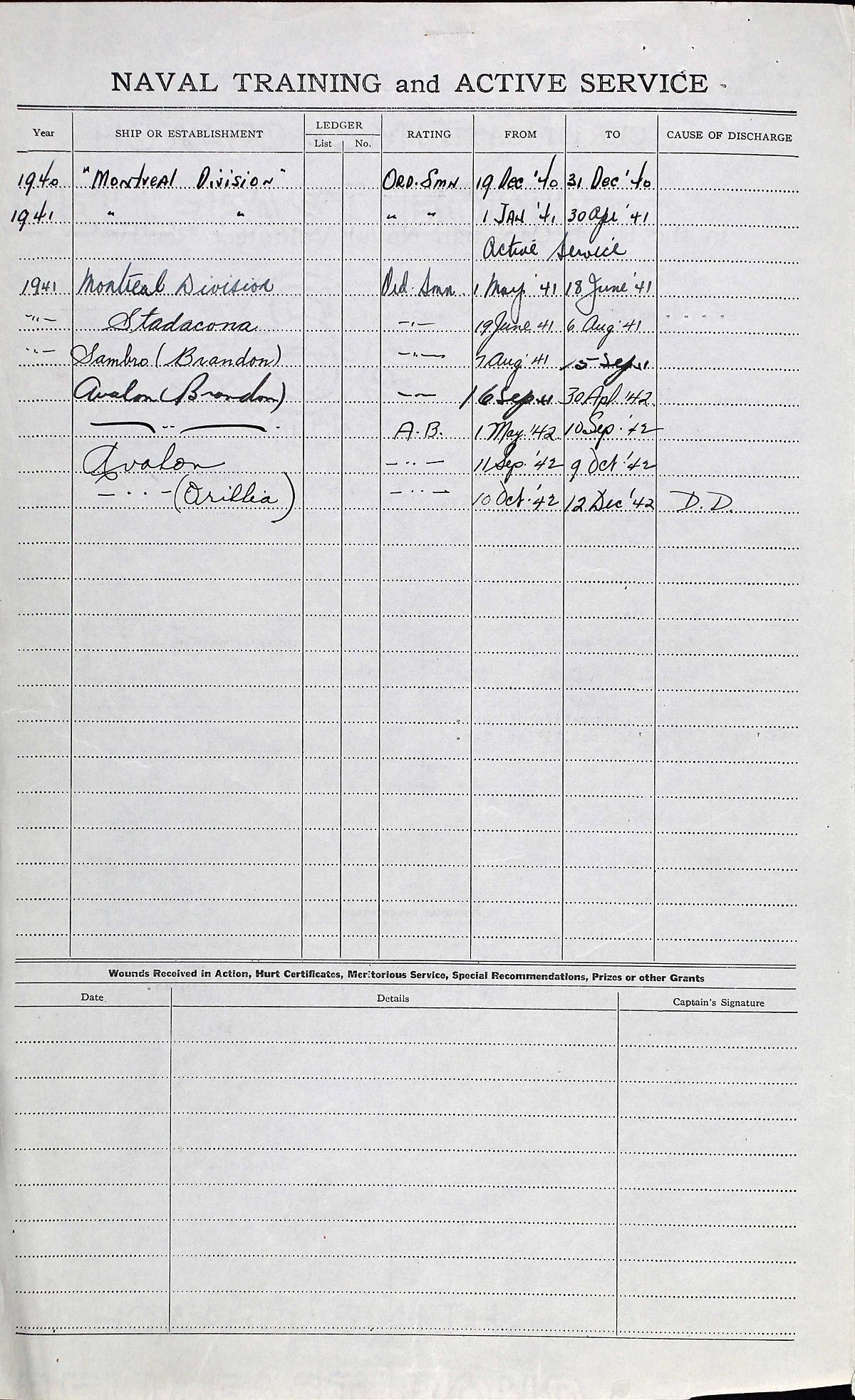 Ships served in: MONTREAL DIVISION RCNVR - Enlisted 19 Dec 1940. Commenced Active Service 01 May 1941 HMCS BRANDON - Served in BRANDON 07 Aug 1941 - 10 Sep 1942 as an OS and AB, RCNVR. Rated B 01 May 1942 HMCS ORILLIA - Drafted to ORILLIA 10 Oct 1942 as an AB, RCNVR