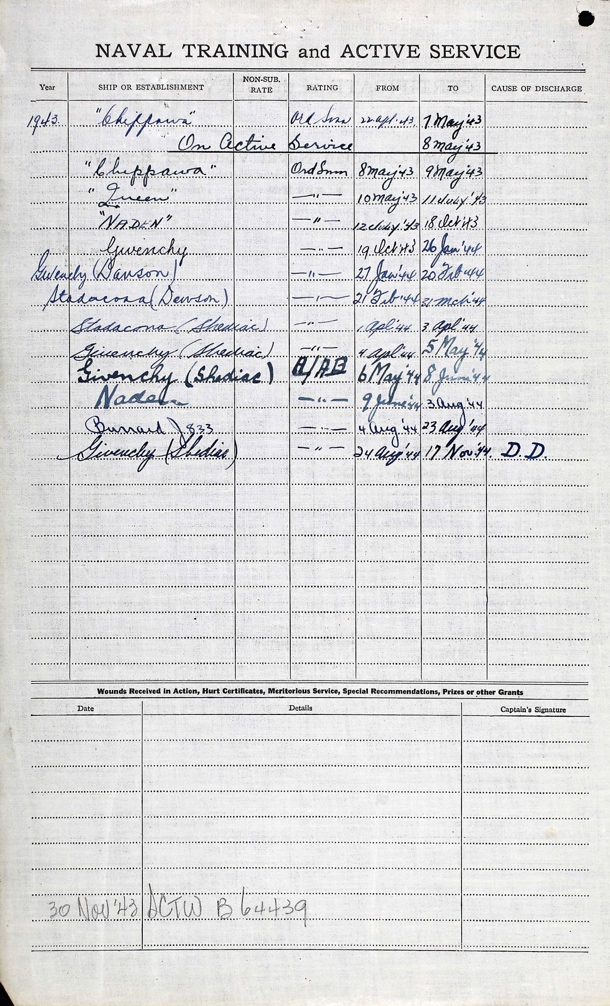 Ships served in: HMCS CHIPPAWA - Enlisted 22 Apr 1943. Commenced Active Service 08 May 1943 HMCS QUEEN - Served in QUEEN 10 May 1943 - 11 Jul 1943 HMCS GIVENCHY - Served in GIVENCHY 19 Oct 1943 - 26 Jan 1944 as an OS, RCNVR HMCS DAWSON - 27 Jan 1944 - 31 Mar 1944 HMCS SHEDIAC - Served in SHEDIAC 01 Apr 1944 - 08 Jun 1944 as an OS and A/AB, RCNVR. Rated A/AB 06 May 1944 HMCS BURRARD - Served in BURRARD 04 Aug 1944 - 23 Aug 1944 as an A/AB, RCNVR HMCS SHEDIAC - Drafted to SHEDIAC 24 Aug 1944 as an A/AB, RCNVR