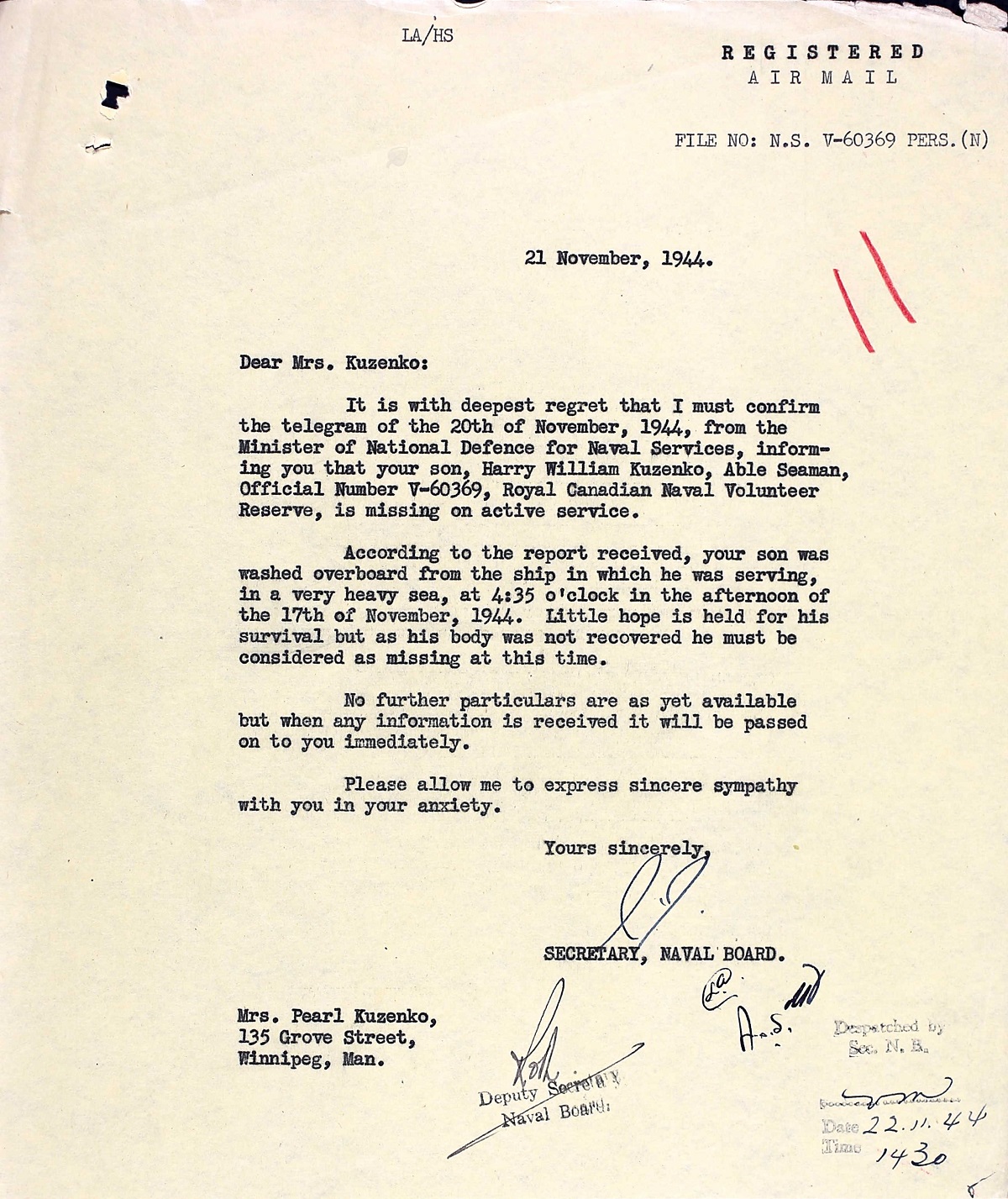 KUZENKO, Harry William, AB, V60369, RCNVR, MPK - 17 Nov 1944, HMCS SHEDIAC - Son of John and Pear Kuzenko, of Winnipeg, MB.