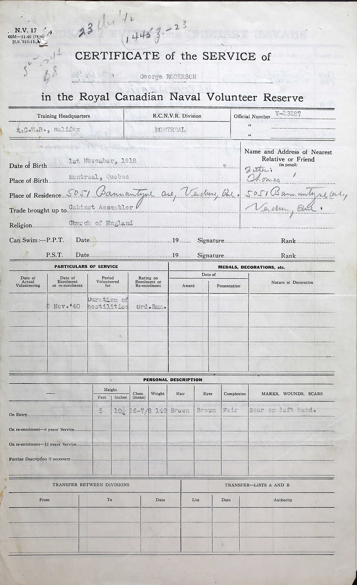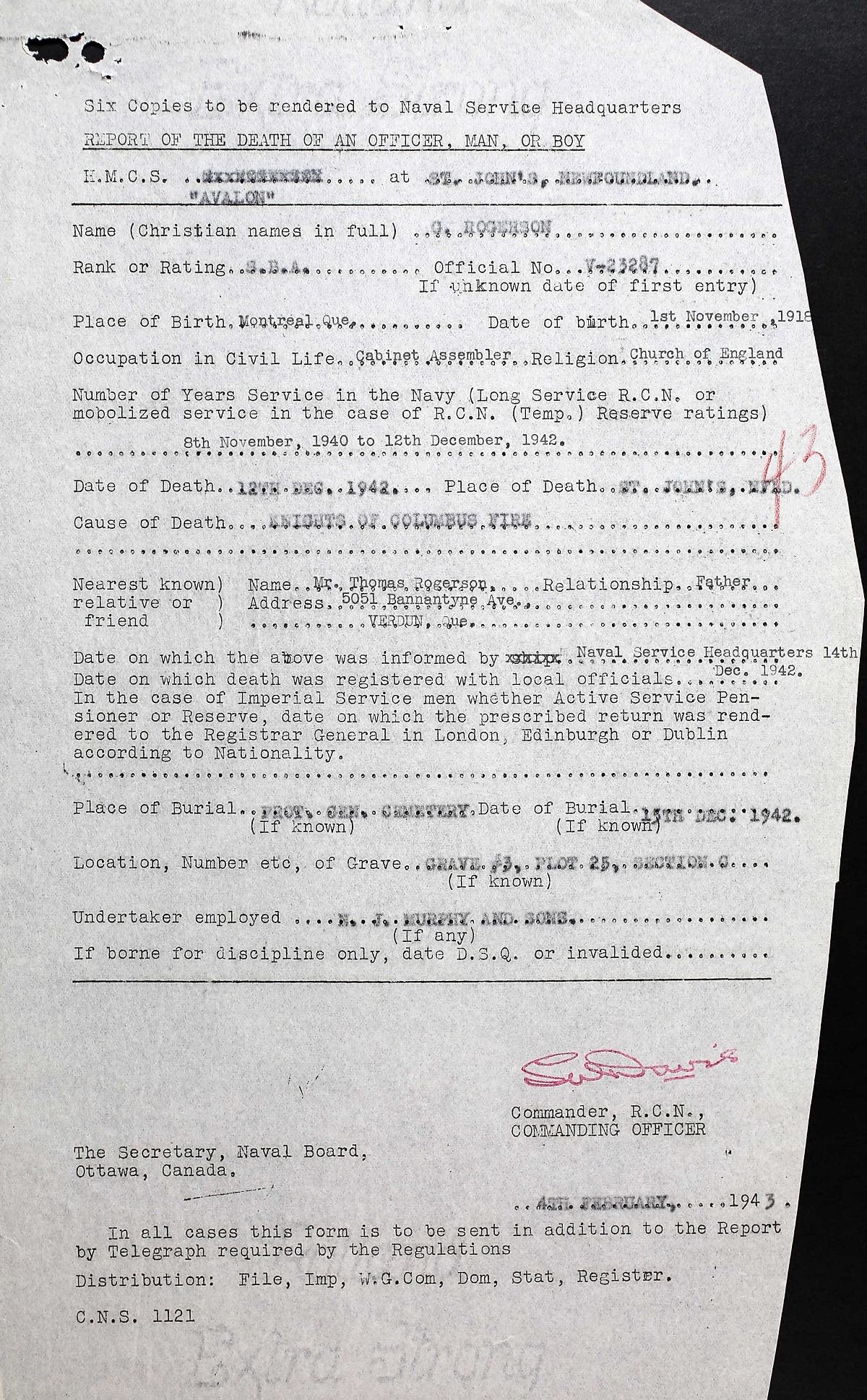 ROGERSON, George Stanley, SBA, V23287, RCNVR, Died - 12 Dec 1942, HMCS TRAIL - Son of Thomas and Nellie Rogerson, of Verdun, QC.