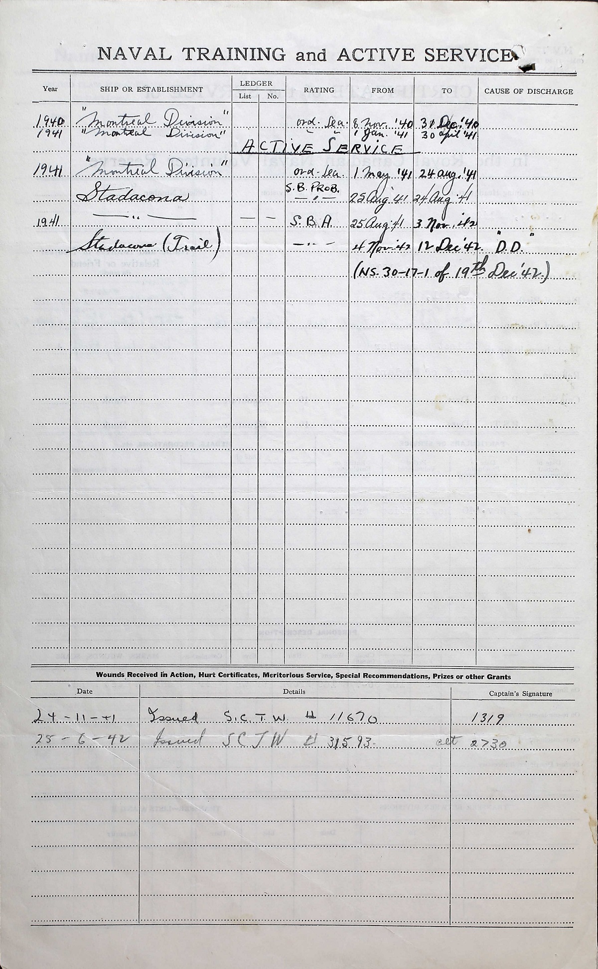 Ships served in: MONTREAL DIVISION RCNVR - Enlisted 08 Nov 1940. Commenced Active Service 01 May 1941 HMCS TRAIL - Drafted to Trailer 04 Nov 1942 as an SBA, RCNVR