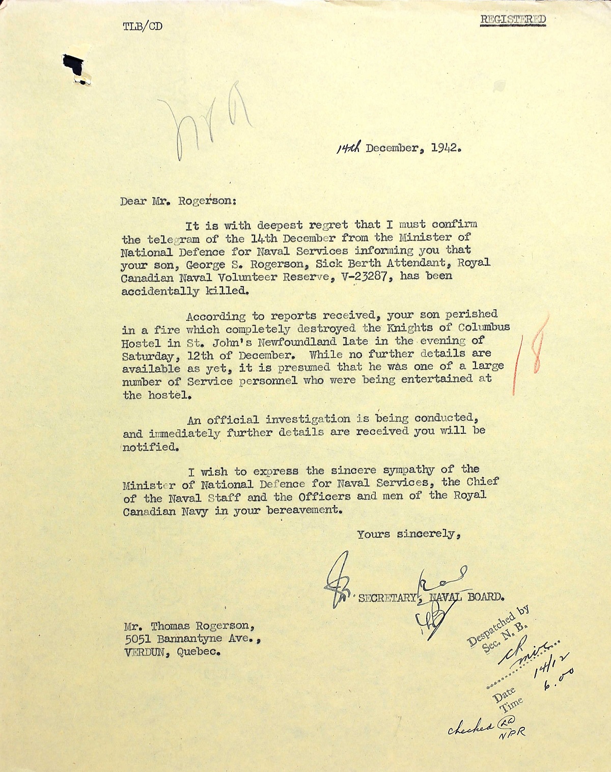 George died on 12 Dec 1942 in the fire at the Knights of Columbus Service Hostel in St. John's, NFLD. He is buried in the Mount Pleasant Cemetery, St. John's, Newfoundland.