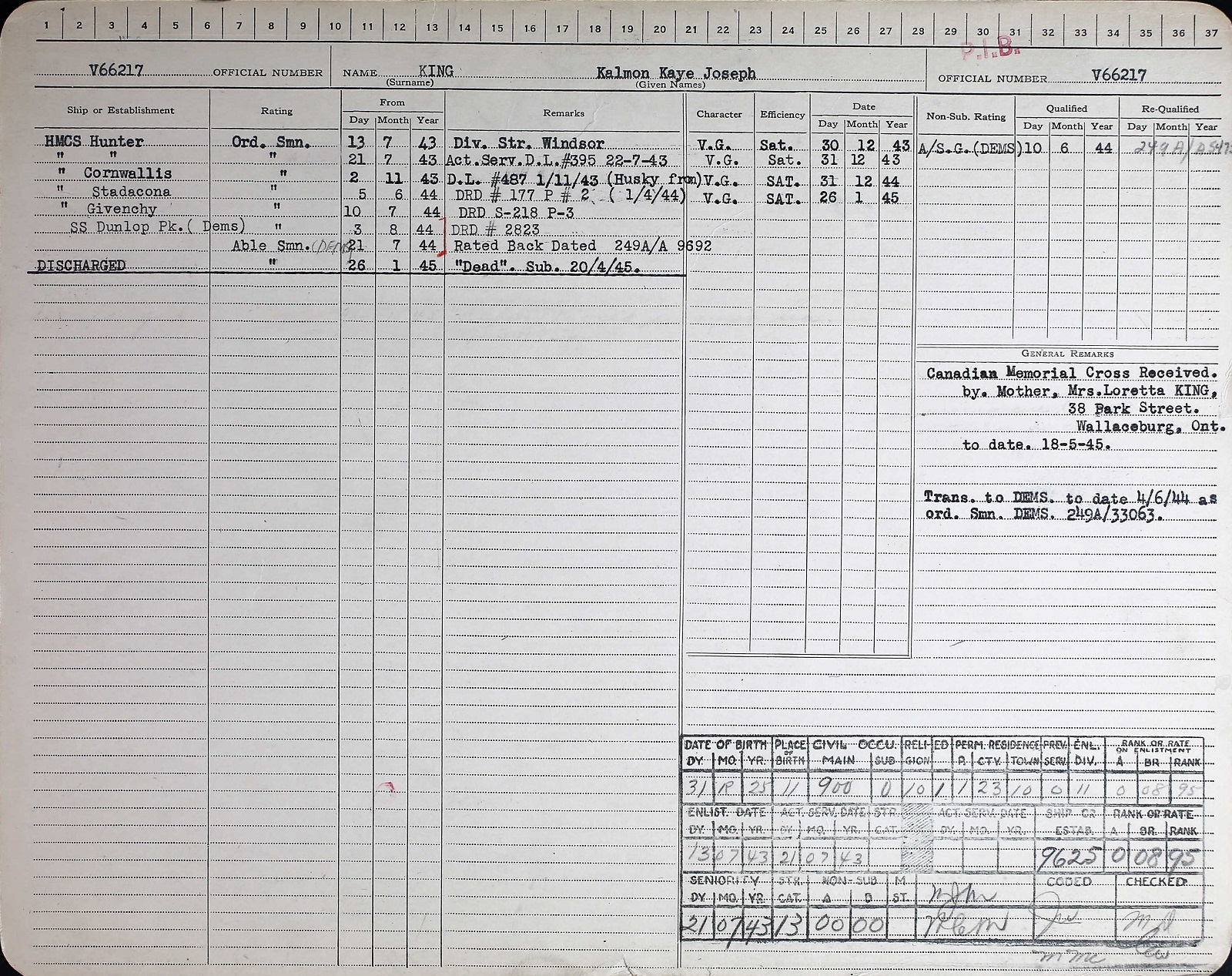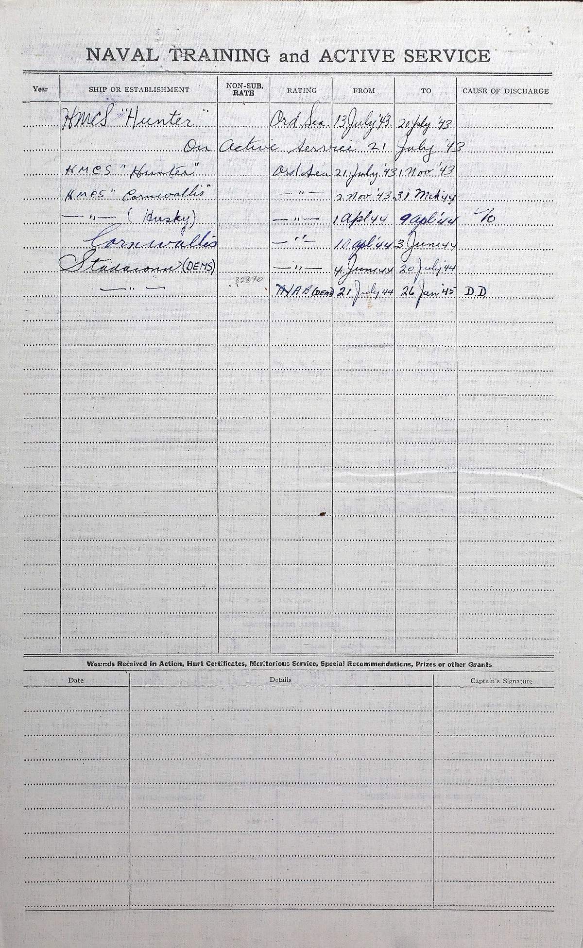 Ships served in: HMCS HUNTER - Enlisted 13 Jul 1943. Commenced Active Service 21 Jul 1943 HMCS HUSKY - Served in HUSKY 01 Apr 1944 - 09 Apr 1944 while in training at HMCS CORNWALLIS HMCS GIVENCHY - Served in GIVENCHY 10 Jul 1944 - 02 Aug 1944 S.S. DUNLOP PARK - Drafted to DUNLOP PARK 03 Aug 1944 as an OS, RCNVR. Rated AB 21 Jul 1944.