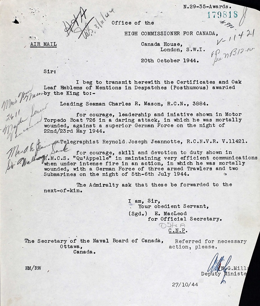 M.I.D. citation: MASON, Charles R., Leading Seaman, 3884, Posthumous, Mention in Despatches, RCN - Awarded as per Canada Gazette of 20 January 1945 and London Gazette of 3 October 1944. "For undaunted courage, resolution and skill during a series of actions against enemy forces while serving in Light Coastal Craft."