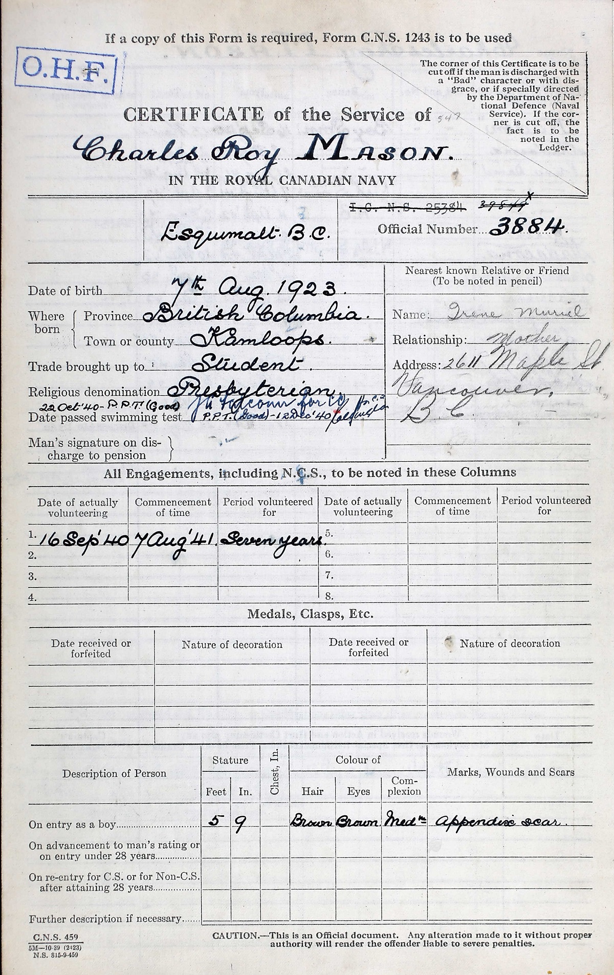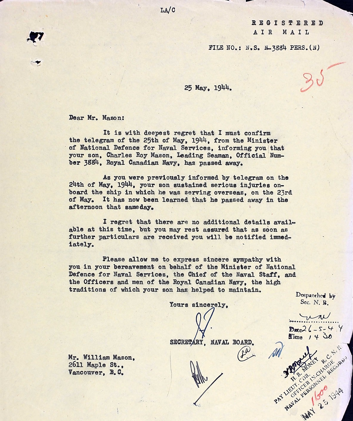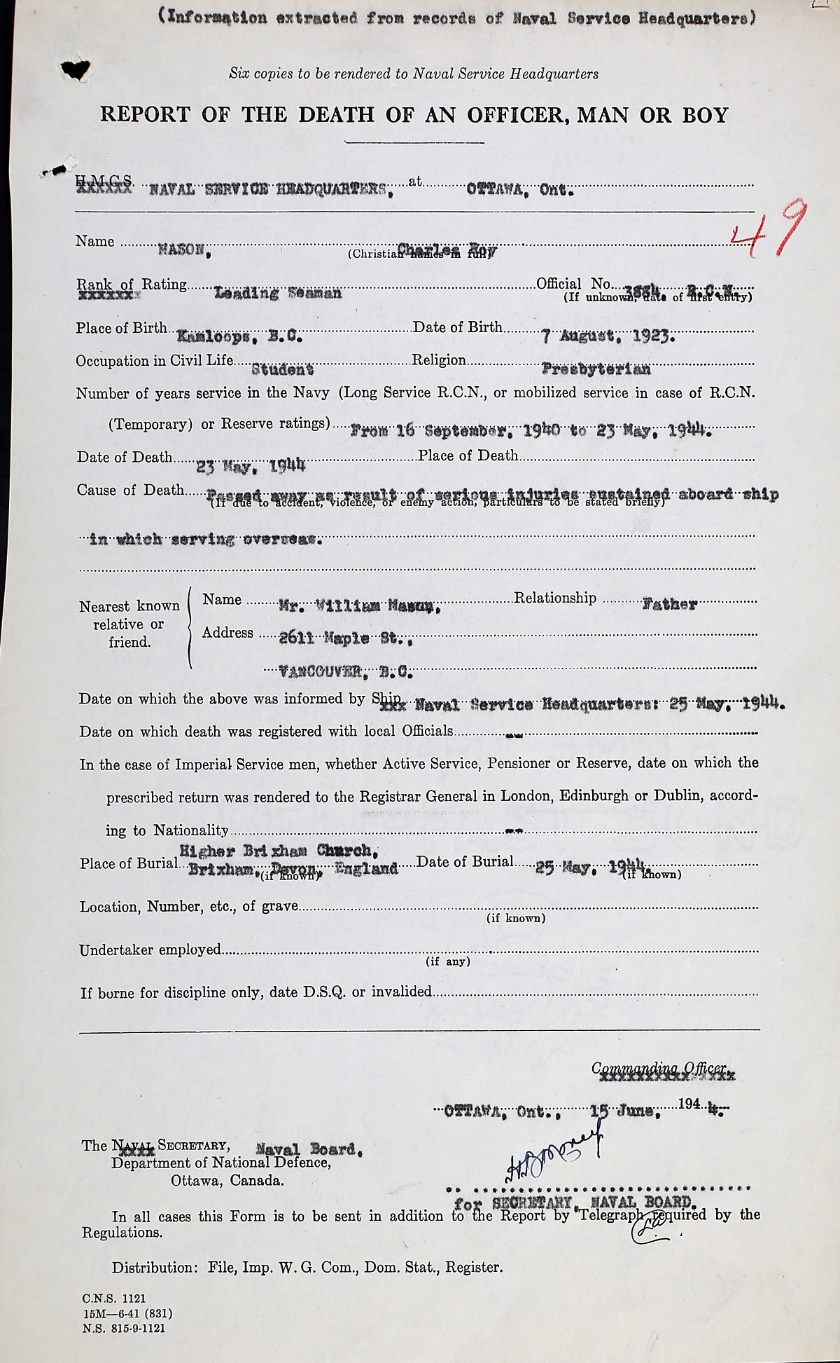Leading Seaman Charles Roy Mason, age 20, son of Capt. and Mrs. William Mason, of 2811 Maple, has been posthumously mentioned in dispatches for good service against enemy coastal forces off the coast of France. Leading Seaman Mason who was to have received his Petty Officer rank in June, died of serious injuries received on active service with a motor torpedo boat May 23, 1944. He was buried with full naval and military honours at Brixham, England. Born in Kamloops and educated there and at Lord Tweedsmier High at Cloverdale, he enlisted in the navy four years ago going over seas in December 1943. A brother Sgt. J. R. Mason, is serving with an armor unit in Italy.