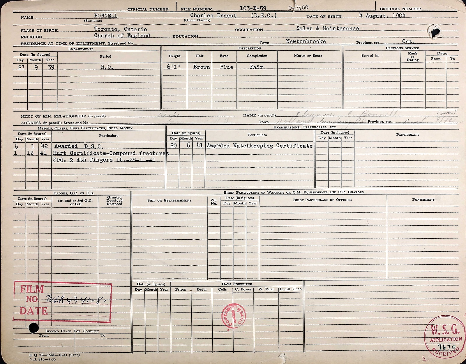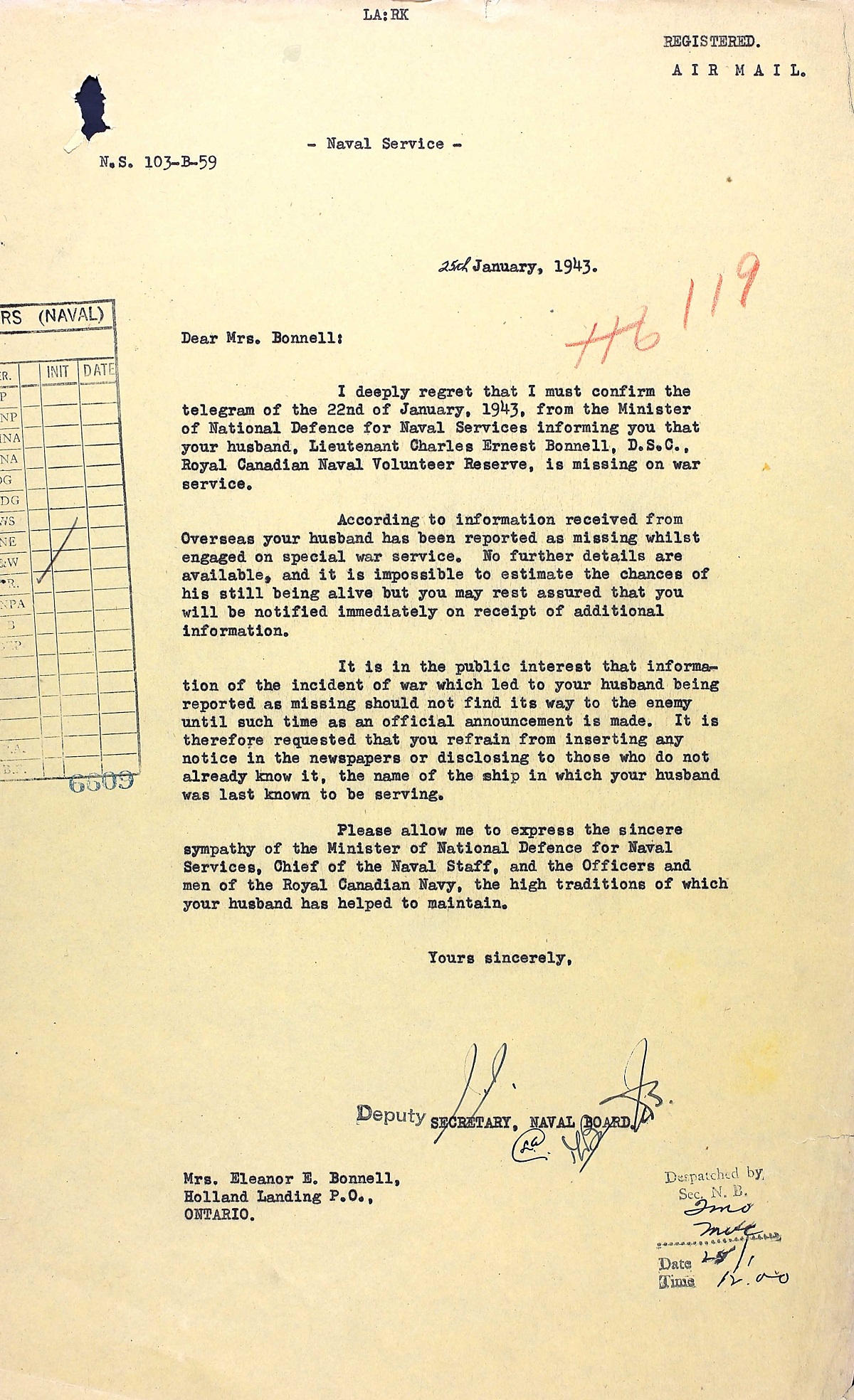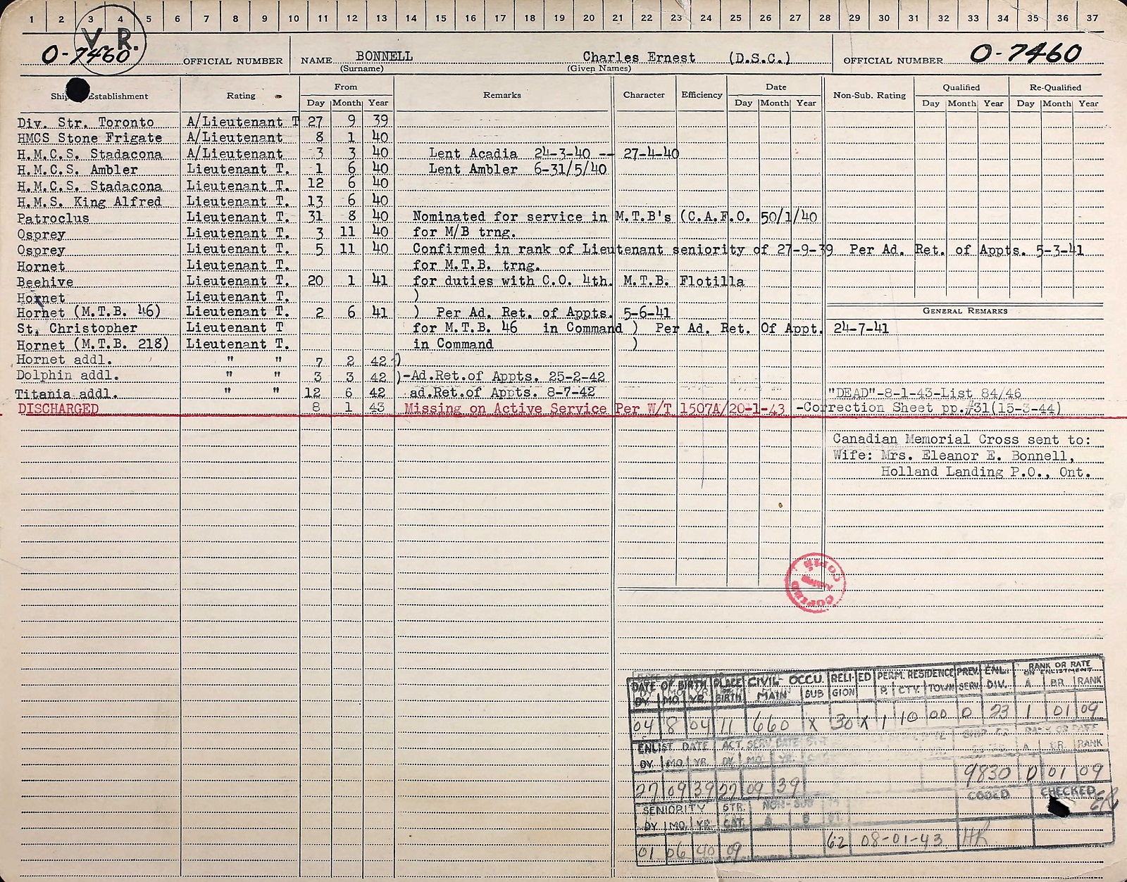 Lt Charles Bonnell is listed on the Halifax Memorial, Nova Scotia, Canada, Panel 9. Commemorated on Lakefield College School Memorial, XIIth Submarine Flotilla Memorial Cairn, GarbhEilan, Kylesku, Sutherland & East Gwillimbury Roll of Honour.