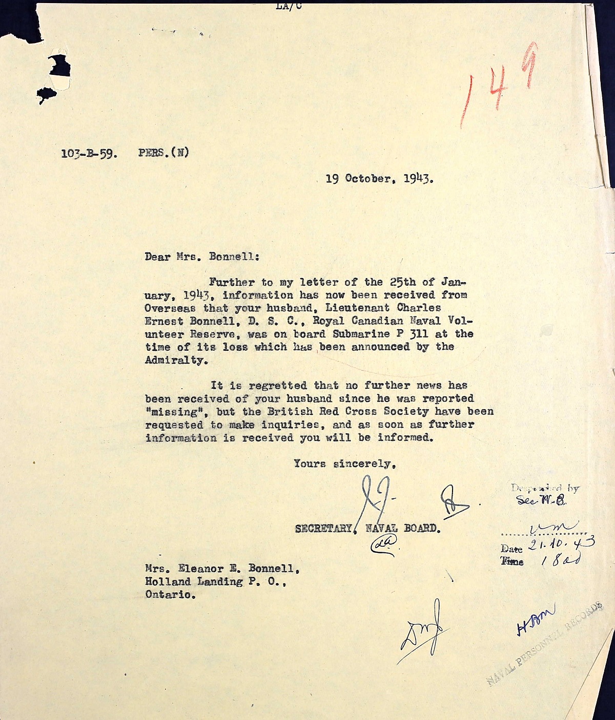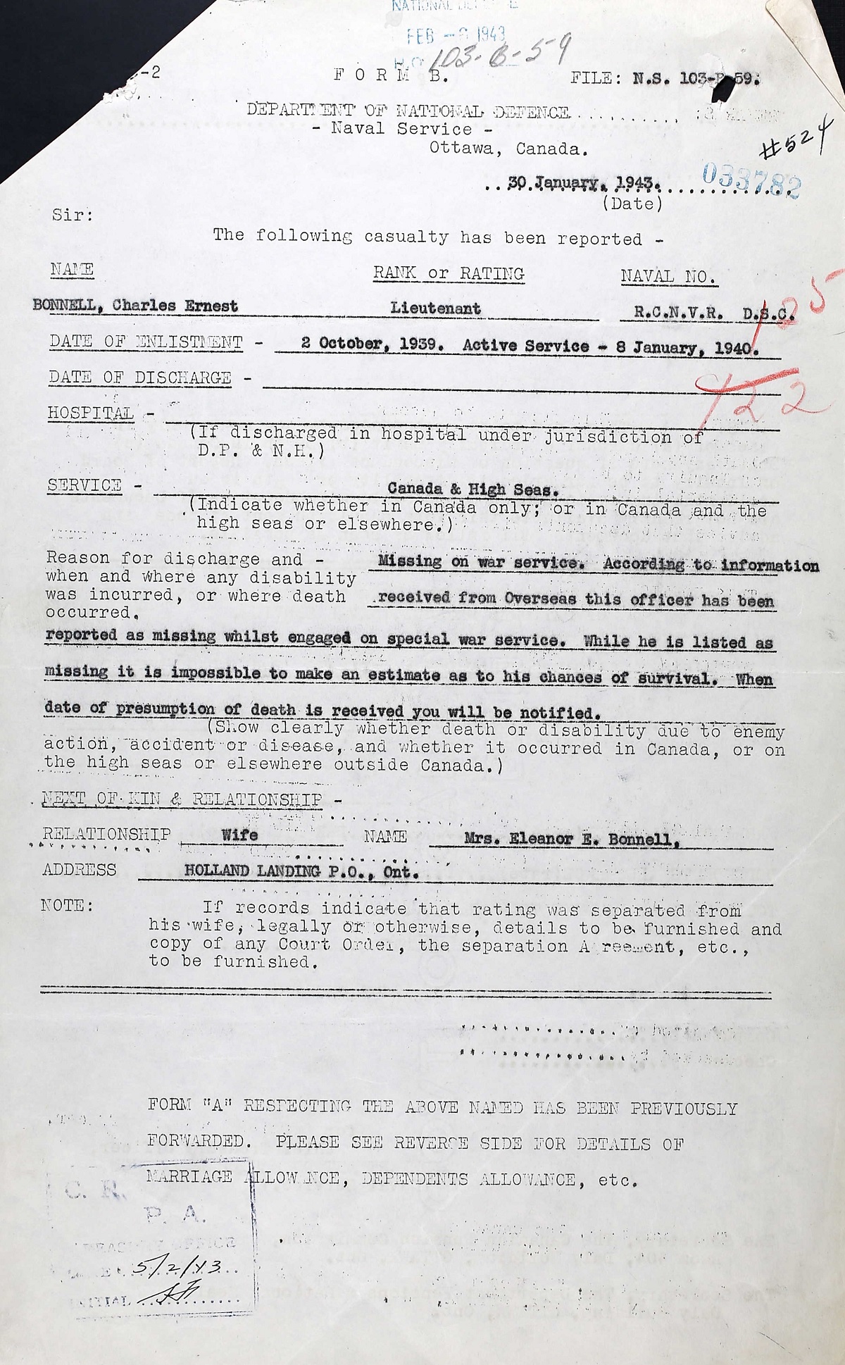 BONNELL, Charles Ernest, Lieutenant, RCN - MPK 08 Jan 1943, HMS/M P311 - Son of Walter Herbert Muirhead Bonnell and Ola Barrett White; husband of Eleanor Bonnell; father of Barbara Bonnell (age 13) of Holland Landing.