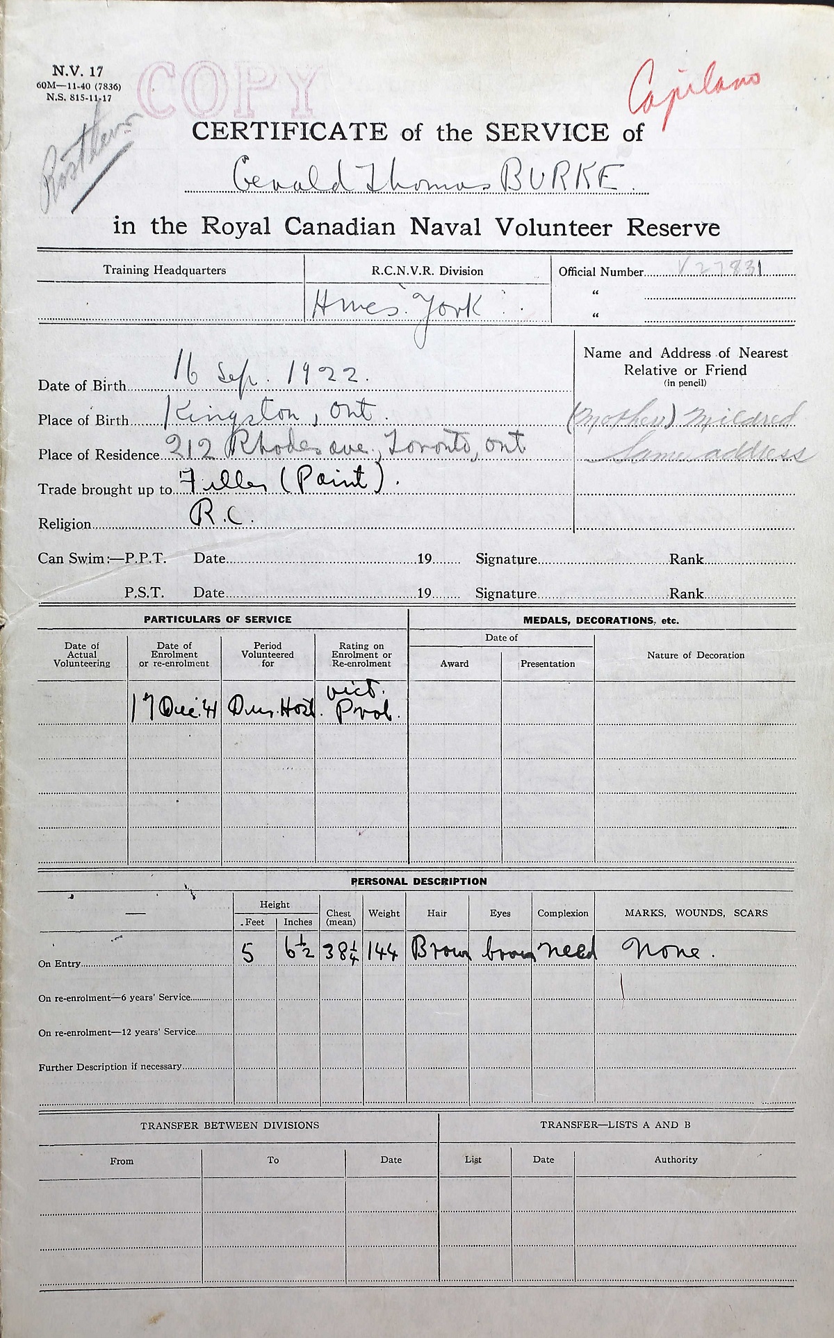 BURKE, Gerald Thomas, LSA, V27831, RCNVR died - 08 Sep 1945, HMCS CAPILANO - Son of Gordon T. Burke and Mildred Burke, of Toronto, ON.