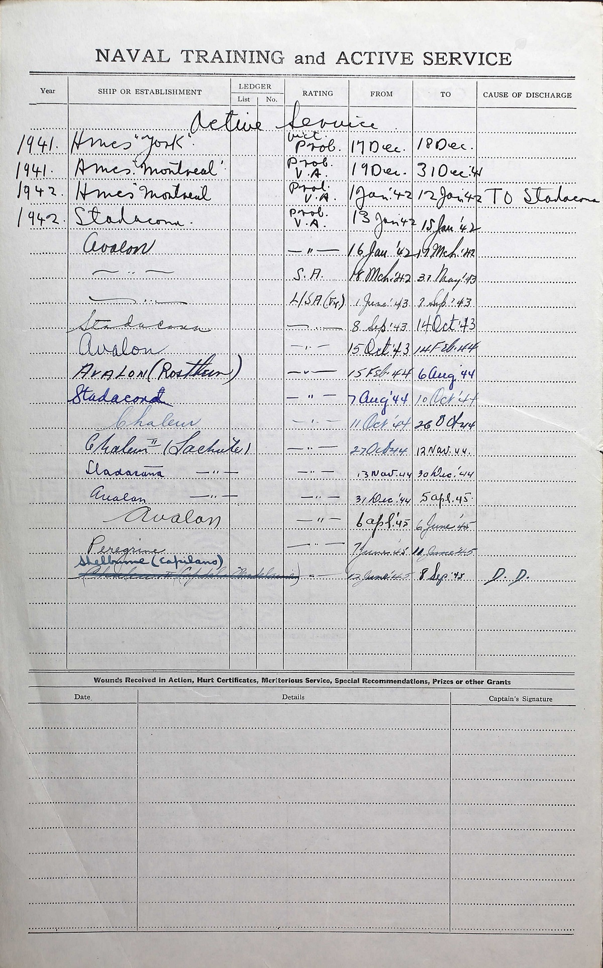 Ships served in: HMCS YORK - Enlisted / Commenced Active Service 17 Dec 1941 HMCS MONTREAL - Served in MONTREAL 19 Dec 1941 - 12 Jan 1942 as a Prob Victualling Assistant, RCNVR HMCS ROSTHERN - Served in ROSTHERN 15 Feb 1944 - 06 Aug 1944 as a L/SA, RCNVR HMCS CHALEUR - Served in CHALEUR 11 Oct 1944 - 26 Oct 1944 as a L/SA, RCNVR HMCS LACHUTE - Served in LACHUTE 27 Oct 1944 - 05 Apr 1945 as a L/LS, RCNVR HMCS CAPILANO - Drafted to CAPILANO 12 Jun 1945 as a L/SA, RCNVR