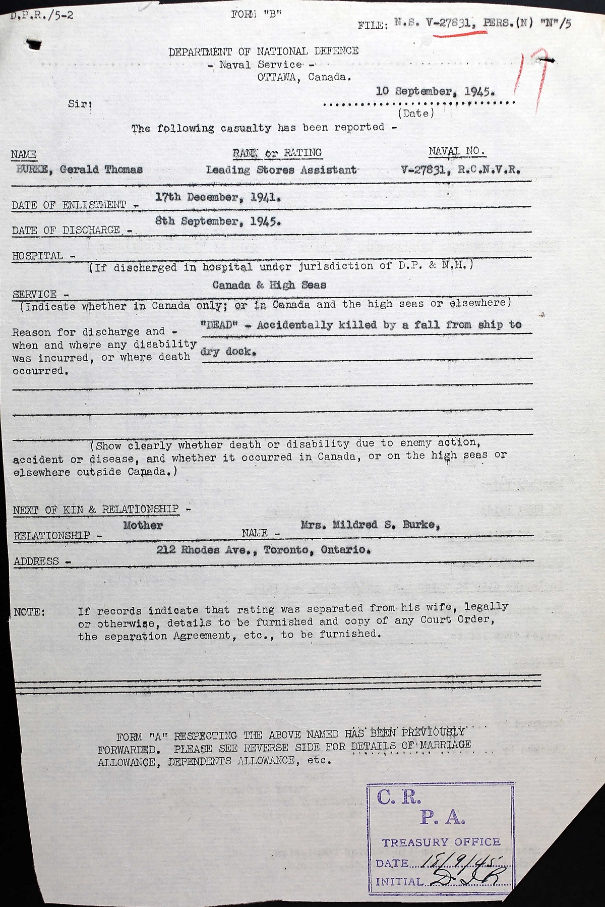 (GB01-GB02) Certificate of Service - pages 1 and 2 (GB03) Report of Death (GB04) Letter from the CO of HMCS CAPILANO to LSA Burke's mother (GB05) Article on the death of LSA Burke - Toronto Star Sep 1945