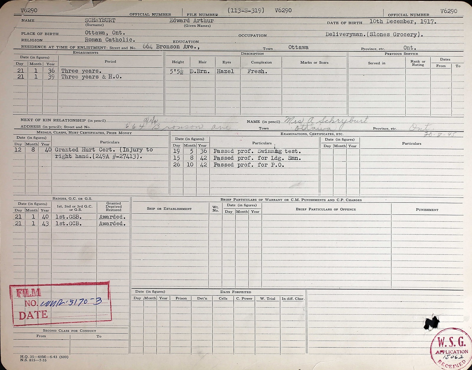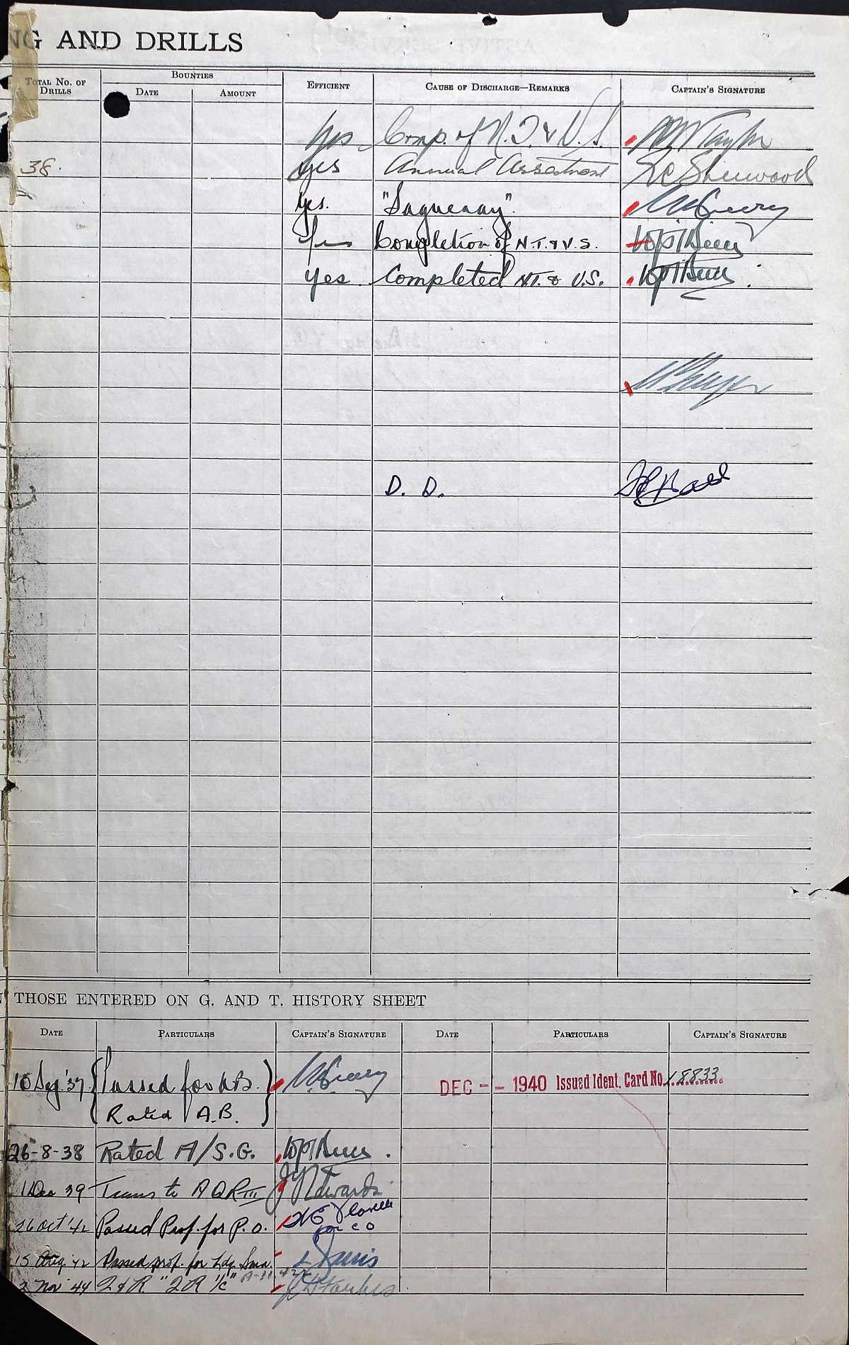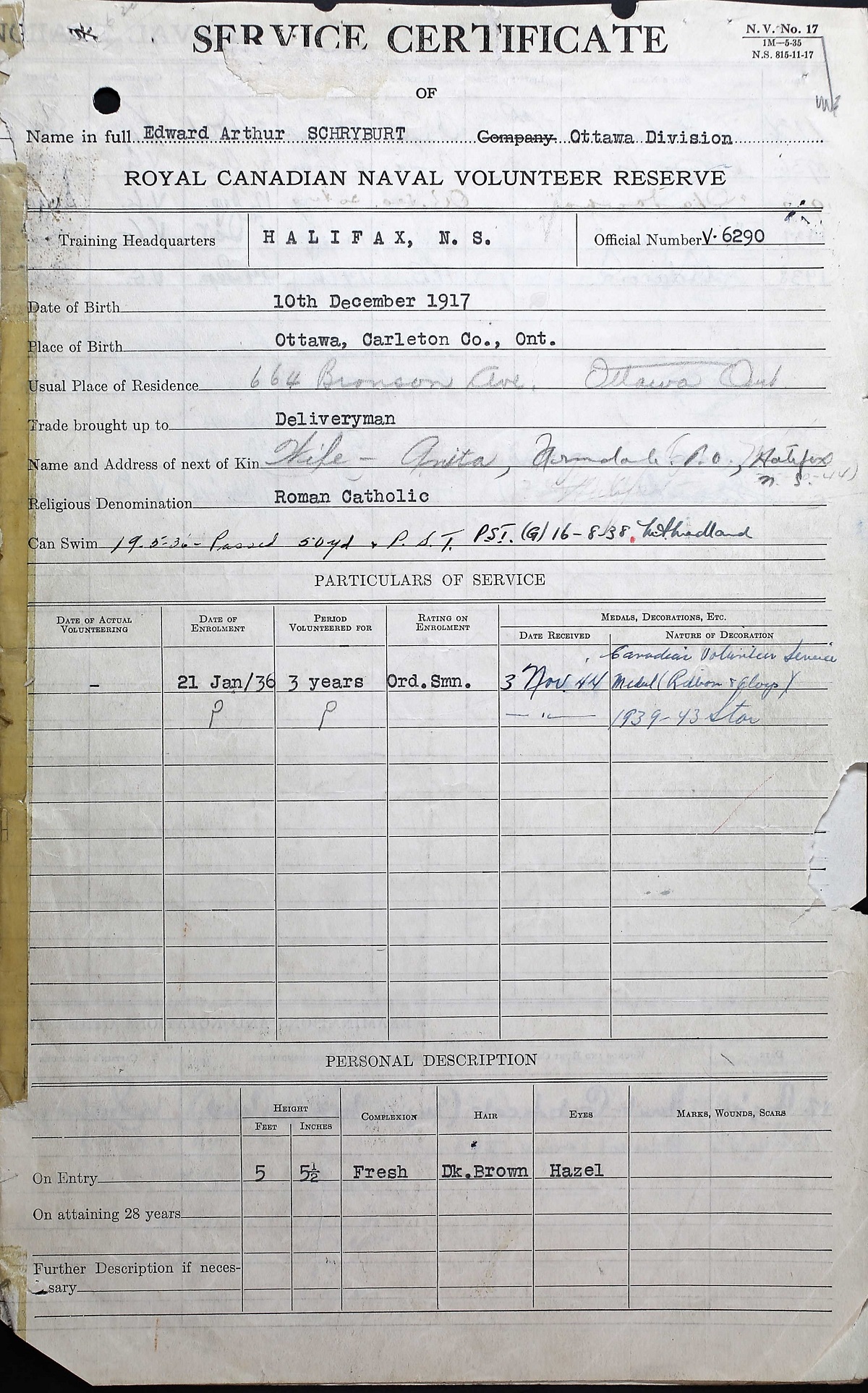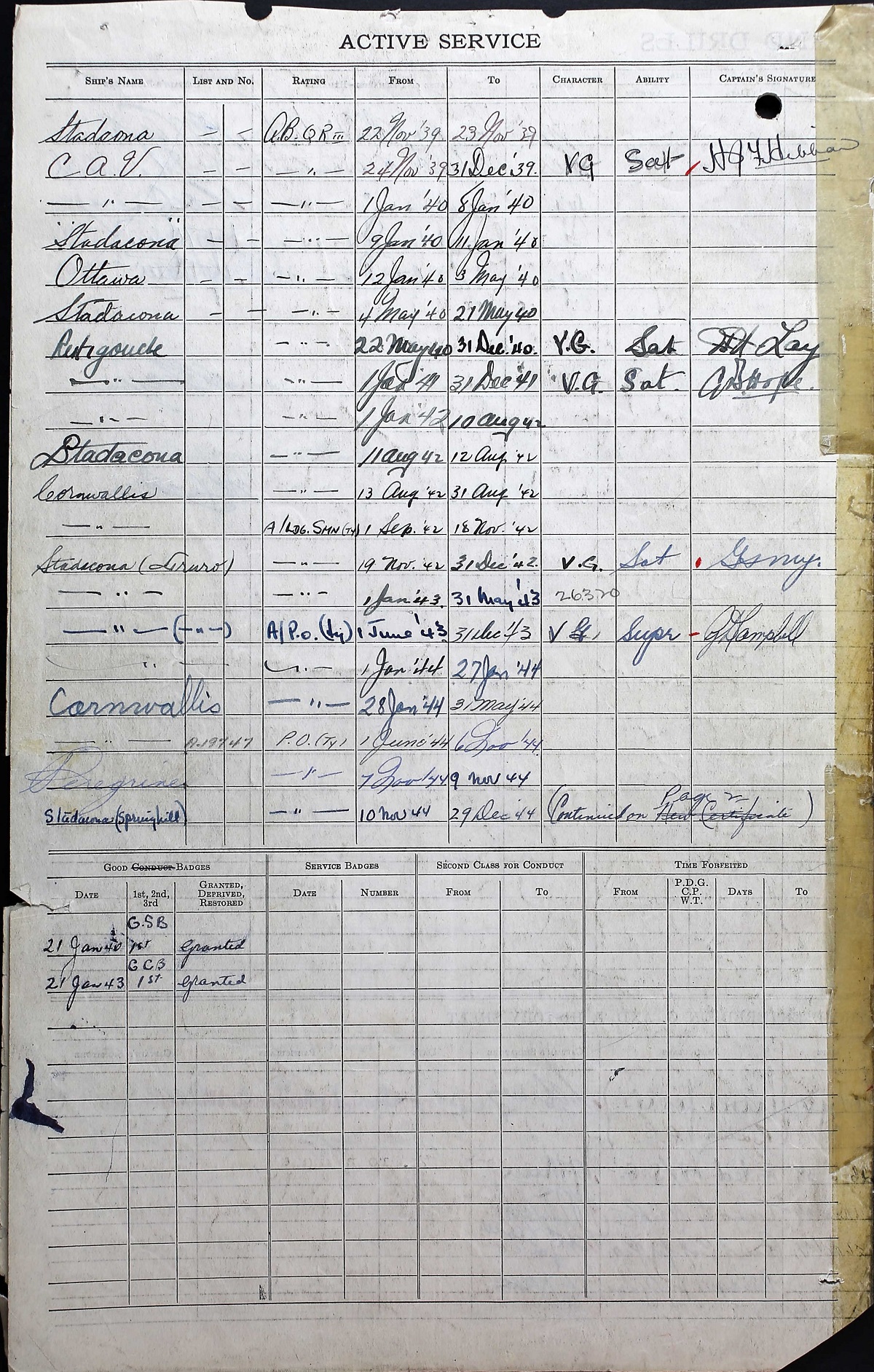 Ships served in: HMCS SAGUENAY - Served in SAGUENAY 13 Sep 1937 - 08 Oct 1937 for training as an OS, RCNVR OTTAWA DIVISION RCNVR - Commenced Active Service 22 Nov 1939 HMCS OTTAWA - Served in OTTAWA 12 Jan 1940 - 03 May 1940 as an AB, RCNVR HMCS RESTIGOUCHE - Served in RESTIGOUCHE 22 May 1940 - 11 Aug 1942 as an AB, RCNVR HMCS TRURO - Served in Truro 17 Nov 1942 - 18 Jan 1944 as an A/ LS and a/PO, RCNVR. Rated A/PO 01 Jun 1943 HMCS SPRINGHILL - Served in SPRINGHILL 10 Nov 1944 - 29 Dec 1944 as a PO, RCNVR HMCS COATICOOK - Drafted to COATICOOK 07 Jan 1945 as a PO, RCNVR