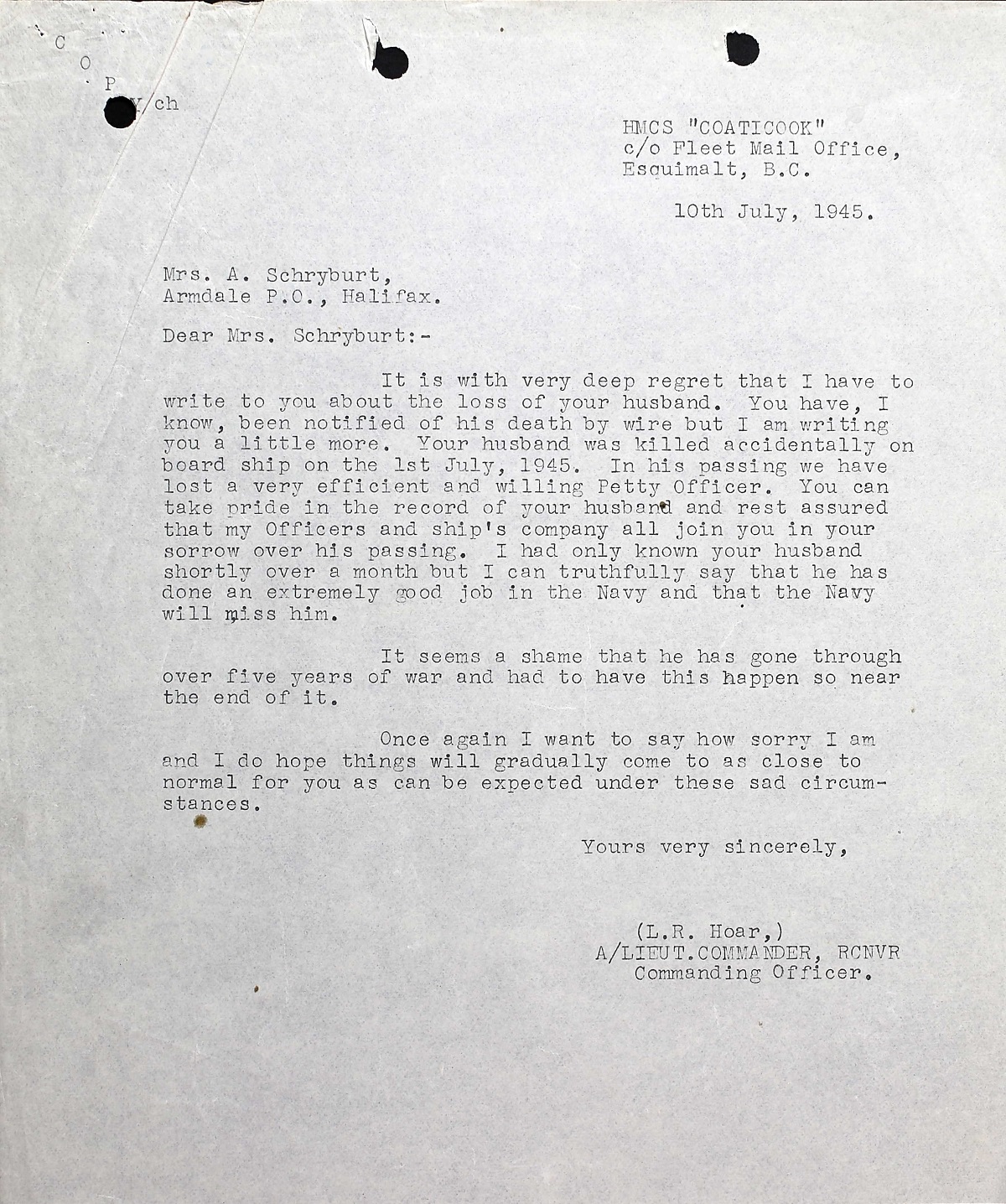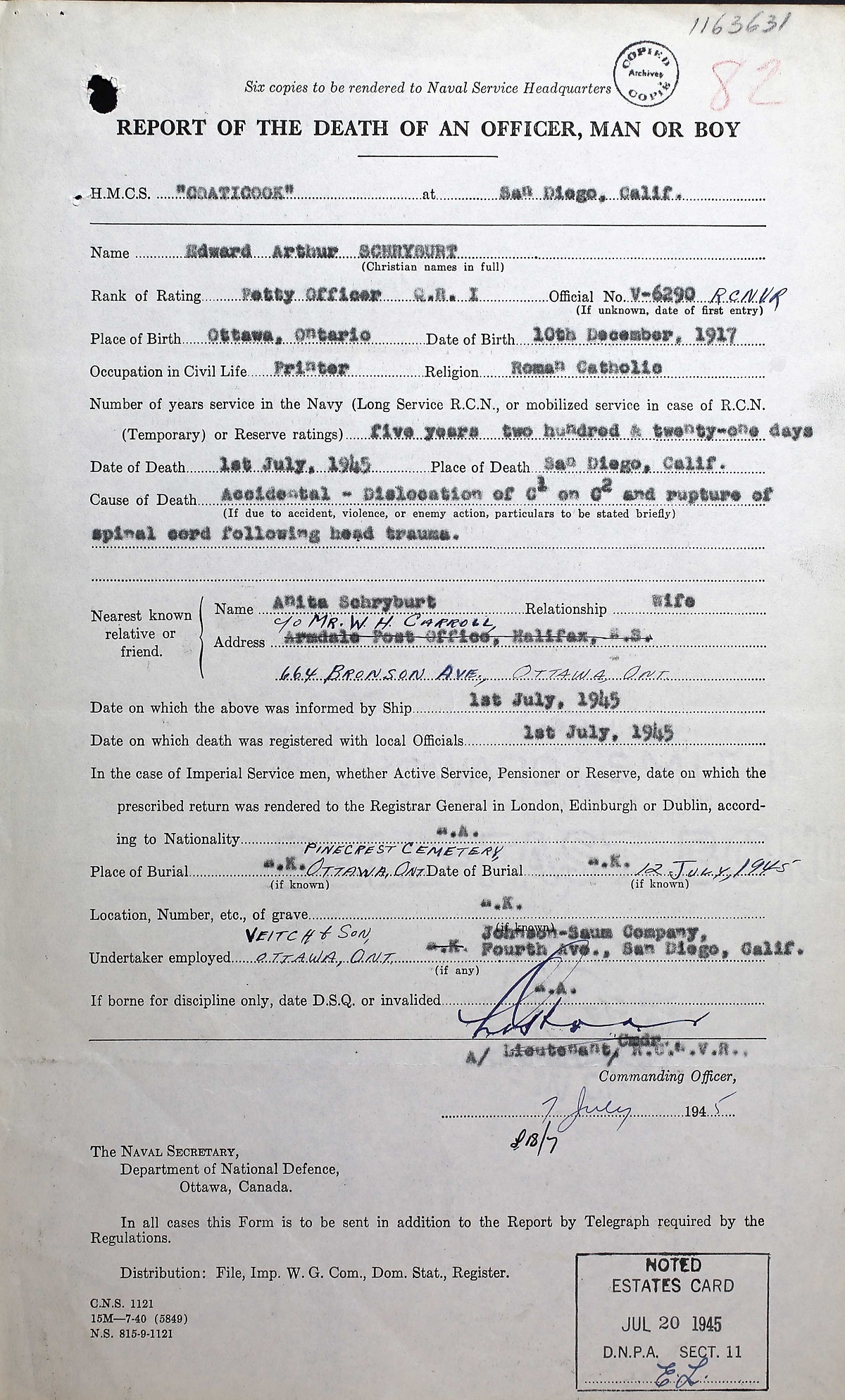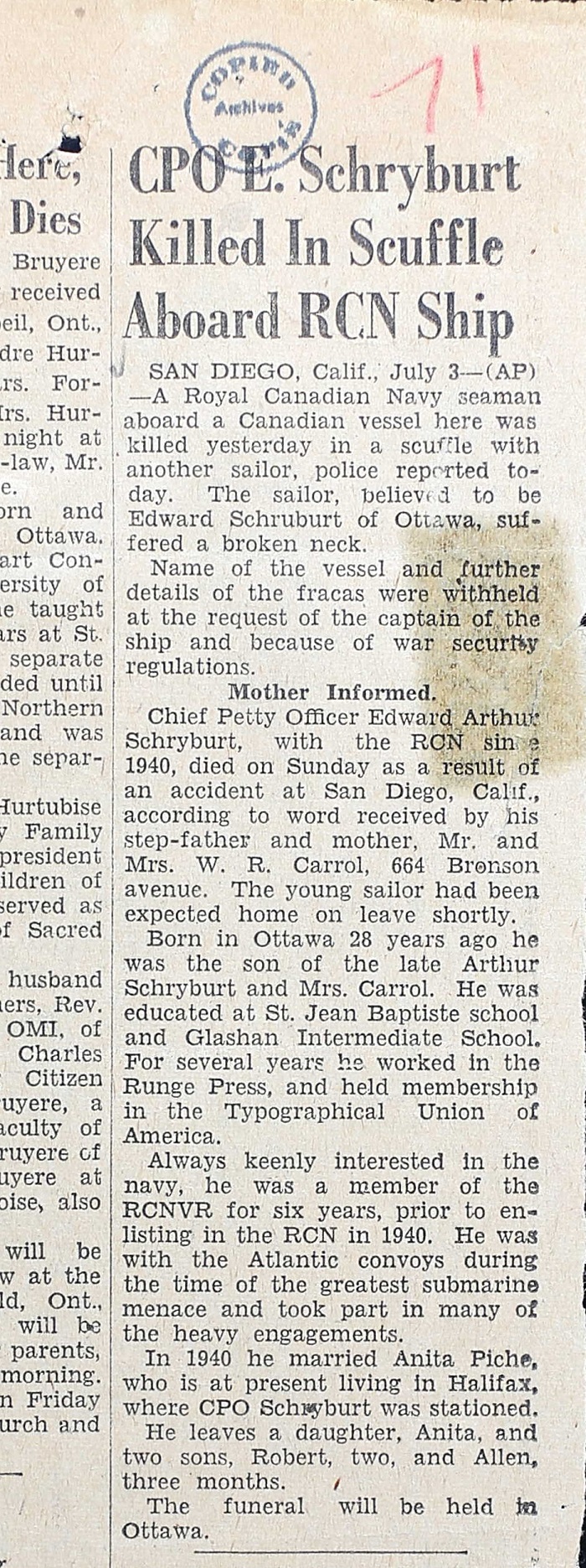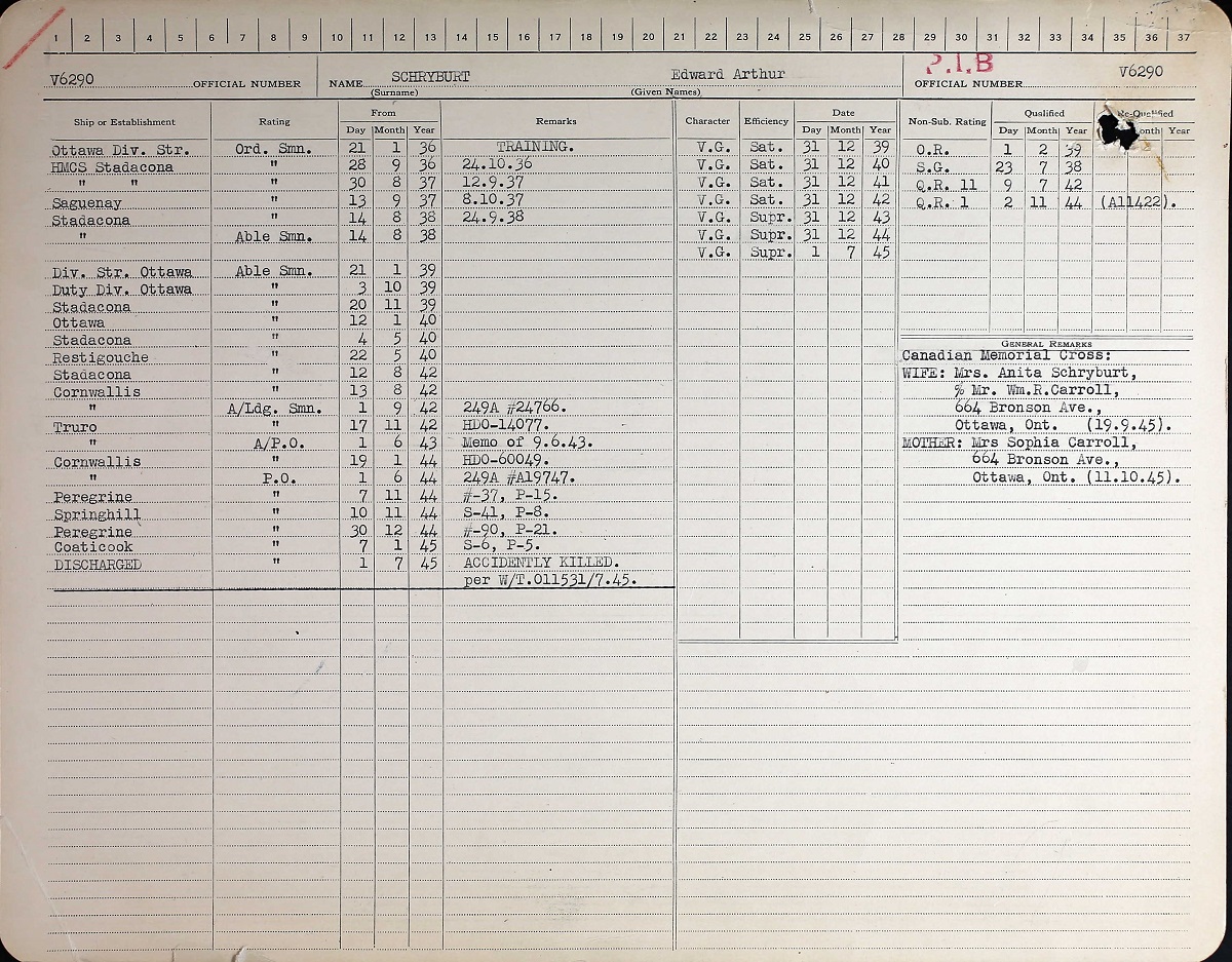SCHRYBURT, Edward Arthur, PO, V6290, RCNVR, died - 01 Jul 1945, HMCS COATICOOK - Son of W.R. Carroll; husband of Anita Schryburt, all of Ottawa, ON.