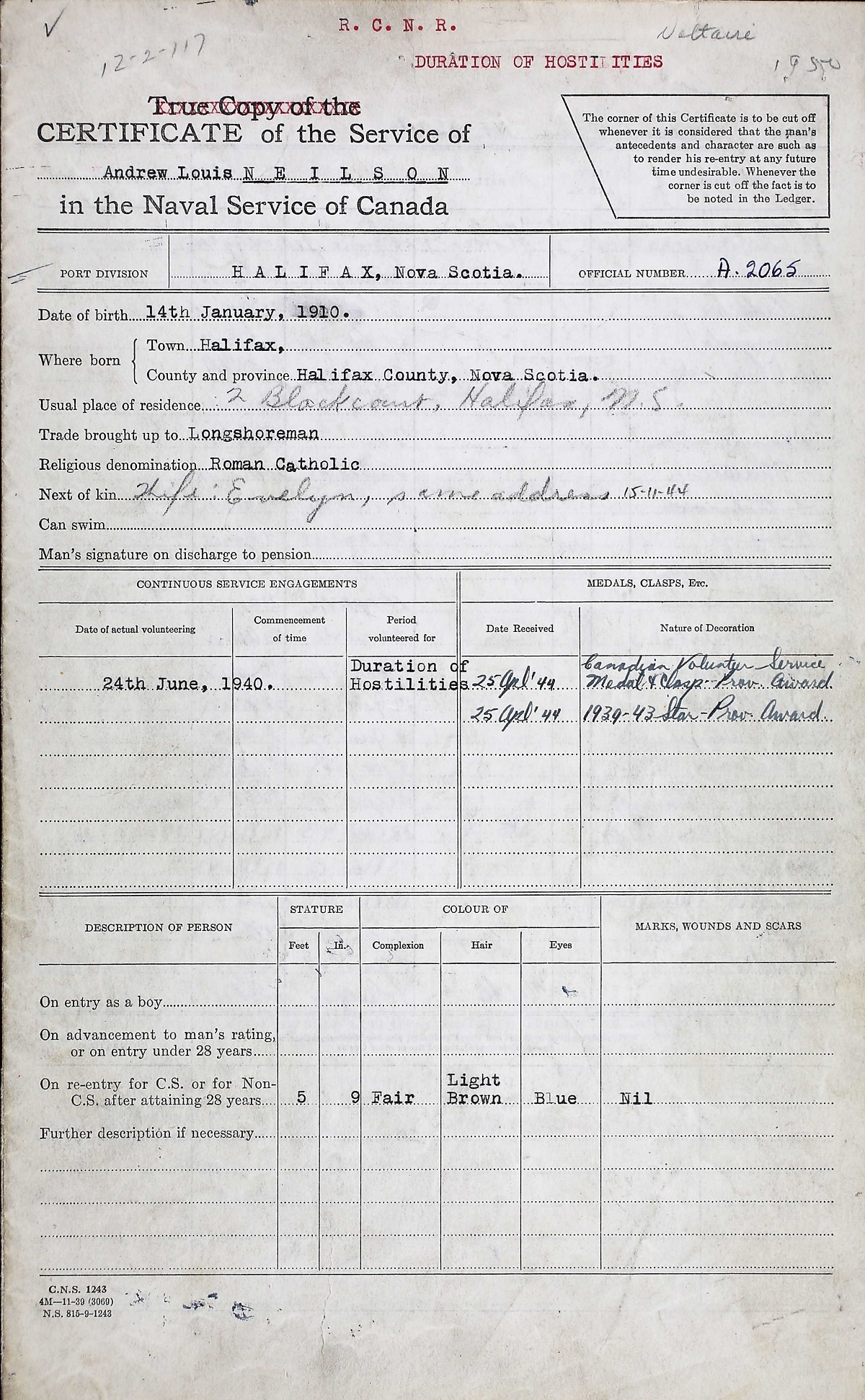 NEILSON, Andrew Louis, L/Sto, A2065, RCNR, died - 26 Feb 1945, HMCS LASALLE - Son of Lawrence and Elizabeth Neilson; husband of Evelyn Marie Neilson, all of Halifax, NS.
