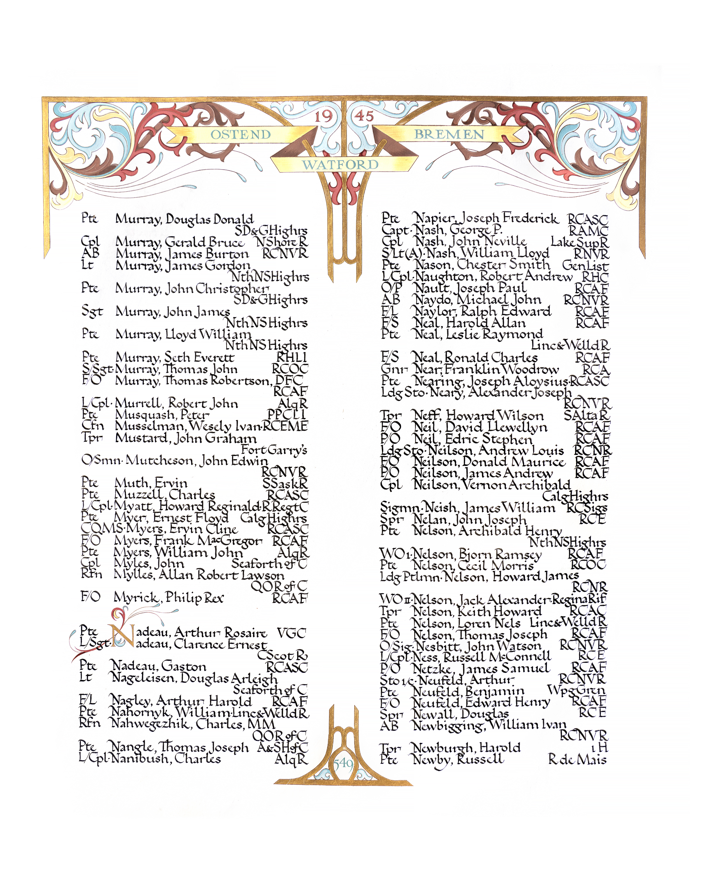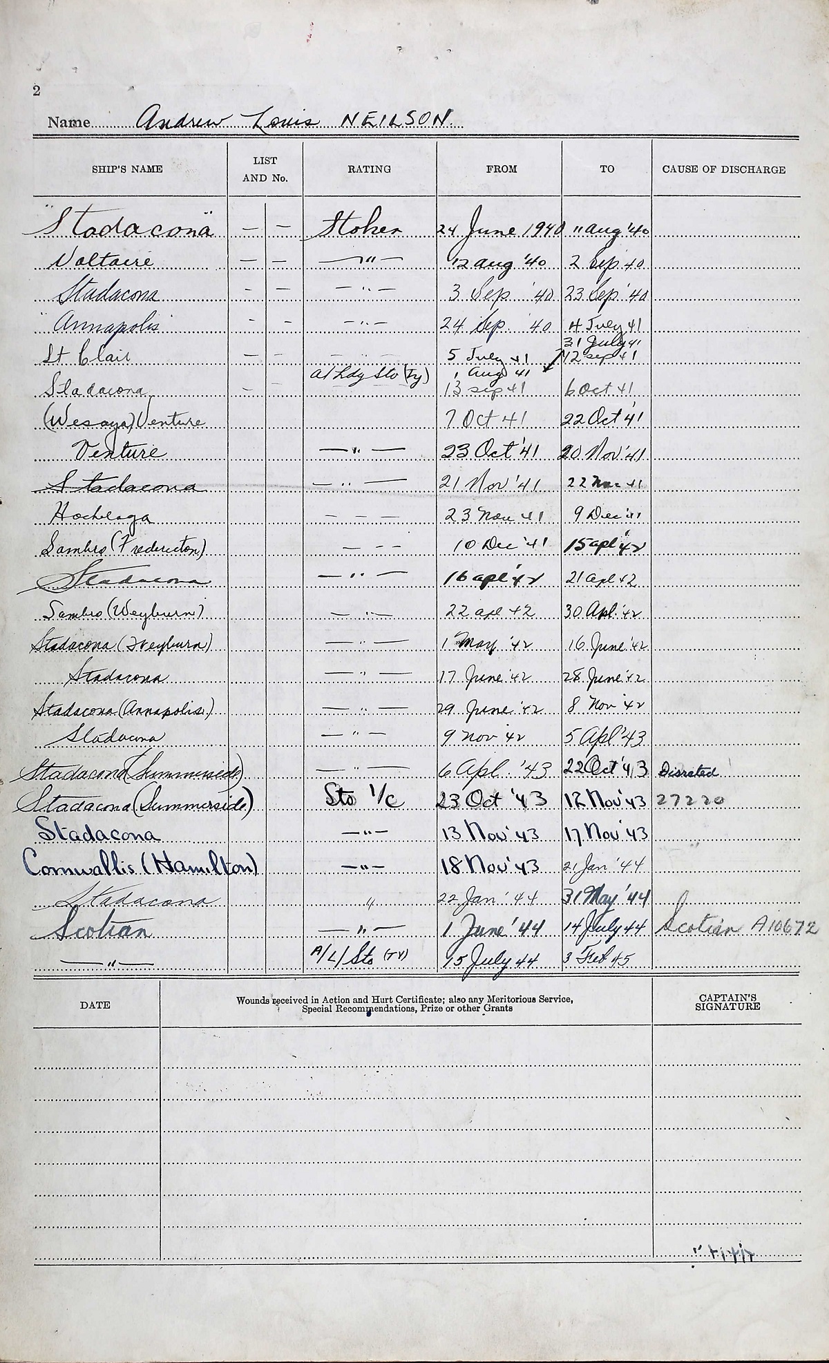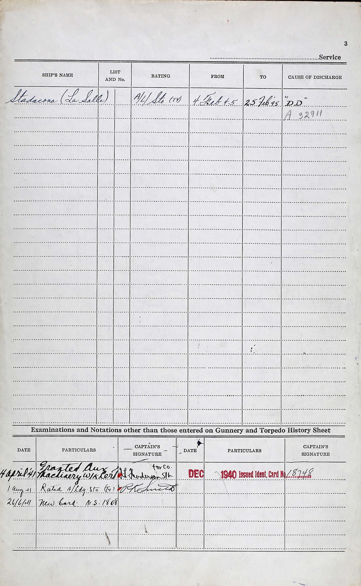 Ships served in: HMCS STADACONA - Enlisted 24 Jun 1940 as a Sto 1c, RCNR HMS VOLTAIRE - Served in VOLTAIRE as a Sto 1c, RCNR 12 Aug 1940 - 02 Sep 1940 HMCS ANNAPOLIS - Served in ANNAPOLIS as a Sto 1c, RCNR 24 Sep 1940 - 04 Jul 1941 HMCS ST CLAIR - Served in ST CLAIR 05 Jul 1941 - 06 Oct 1941 as a Sto 1c and A/ L/ Sto, RCNR Rated A/L.Sto 01 Aug 1941. HMCS WASAGA - Served in WASAGA 07 Oct 1941 an an A/L/Sto, RCNR HMCS FREDERICTON - Served in FREDERICTON - 10 Dec 1941 - 15 Apr 1941 as a L/Sto, RCNR HMCS WEYBURN - Served in WEYBURN 22 Apr 1942 - 16 Jun1942 as a L/Sto, RCNR HMCS ANNAPOLIS - Served in ANNAPOLIS 29 Jun 1942 - 08 Nov 1942 as a L/Sto, RCNR HMCS SUMMERSIDE - Served in SUMMERSIDE 06 Apr 1942 - 12 Nov 1943 as a L/Sto and Sto 1c, RCNR. Disrated 23 Oct 1943 HMCS HAMILTON - Served in HAMILTON - 18 Nov 1943 - 21 Jan 1944 as a Sto 1c, RCNR HMCS SCOTIAN - Served in SCOTIAN 01 Jun 1944 - 03 Feb 1945 as a Sto 1c, RCNVR and A/L/Sto, RCNR. Rated A/L/Sto 15 Jul 1944 HMCS LASALLE - Drafted to LASALLE 04 Feb 1945 as an A/L/Sto, RCNR
