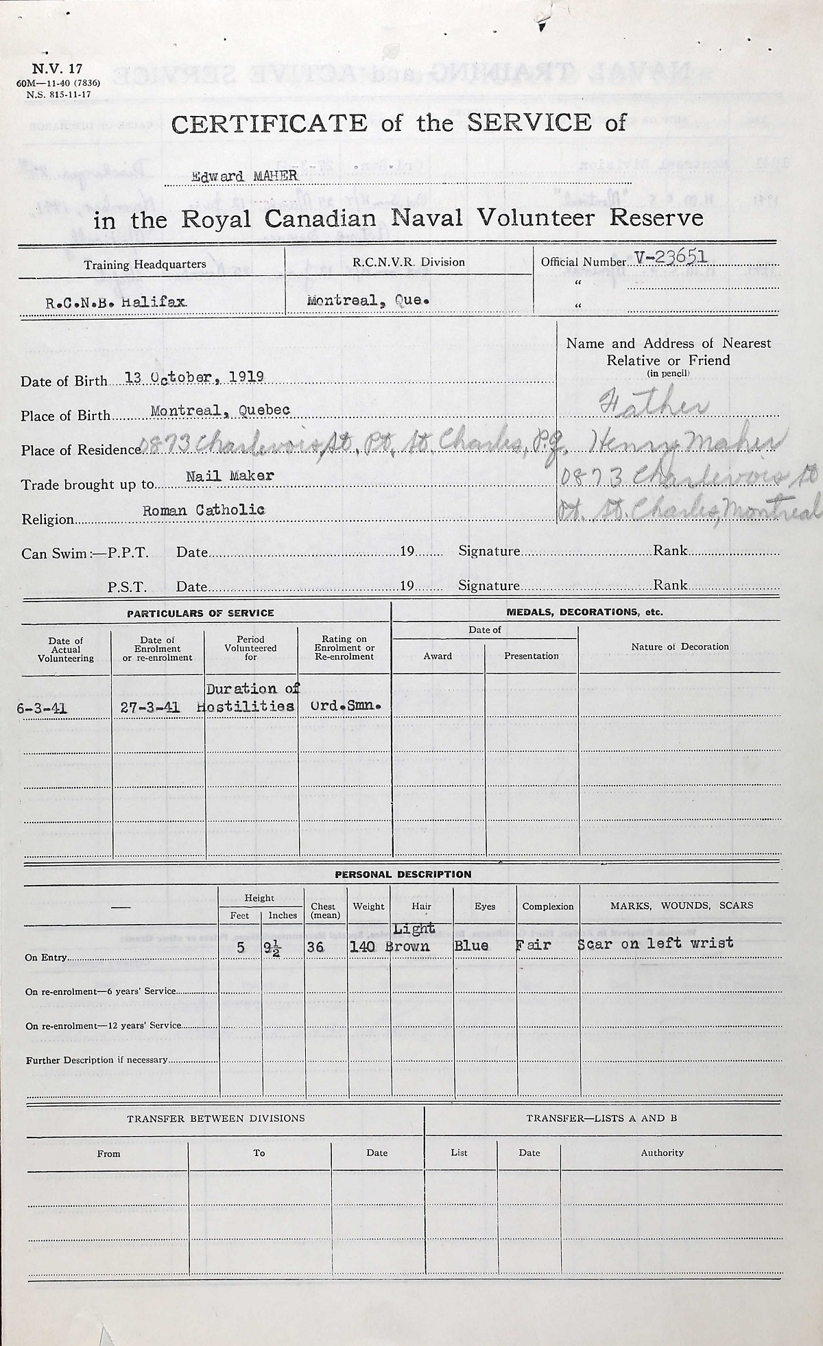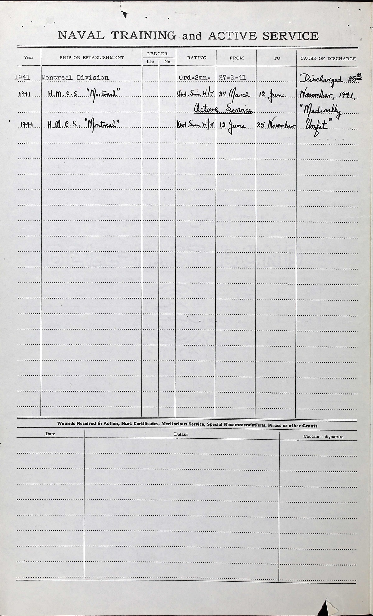 Ships served in: HMCS MONTREAL (MONTREAL DIVISION RCNVR) - Enlisted 27 Mar 1941. Commenced Active Service 12 Jun 1941.