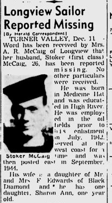 MCCAIG, Allan Robert, Sto 1c, V36923, RCNVR, died - 01 Dec 1944, HMCS NEW LISKEARD - Son of Mr. and Mrs. Alex McCaig, of High River, AB; husband of Lily McCaig, of Longview, AB.