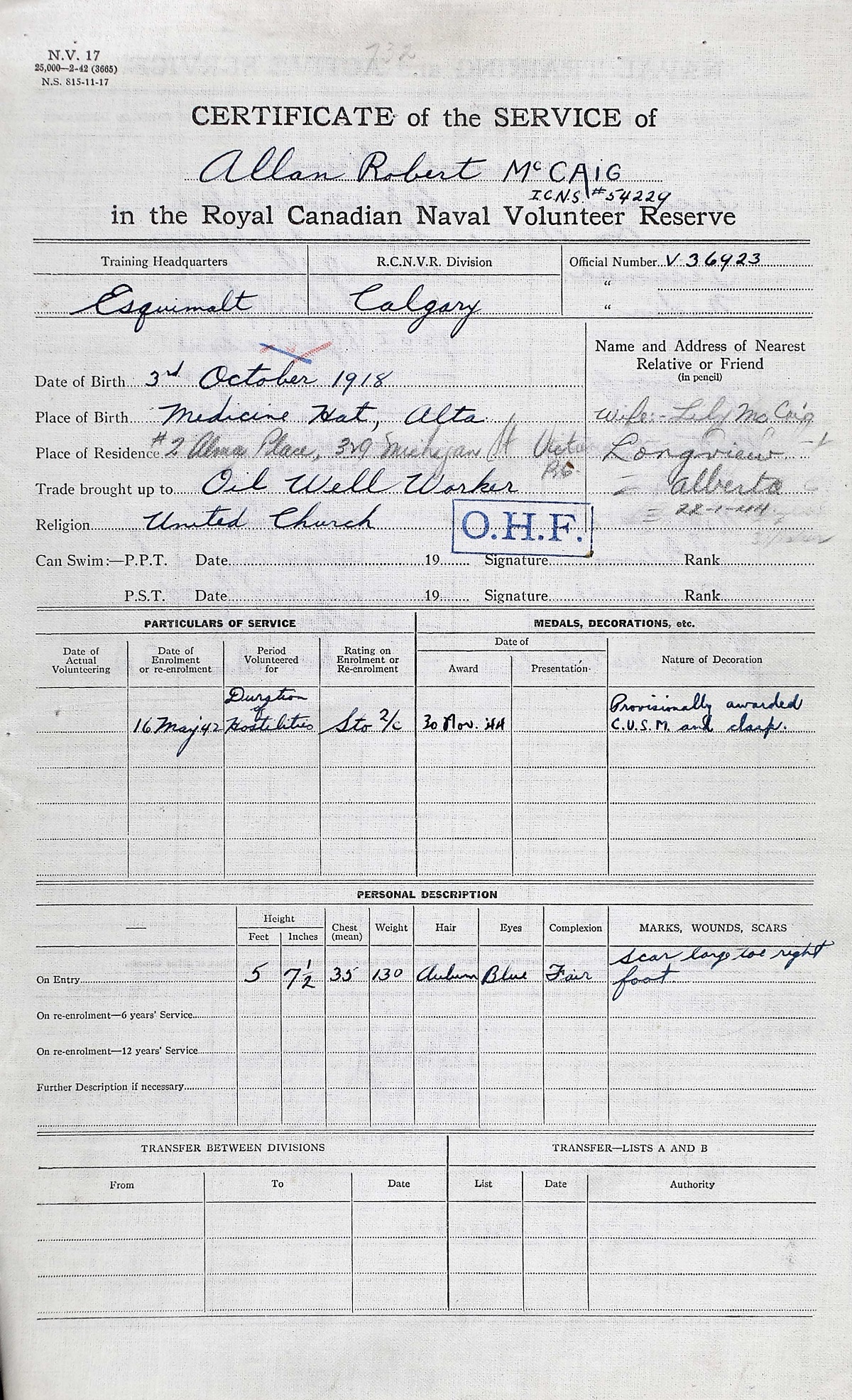 Ships served in: HMCS TECUMSEH - Enlisted 16 May 1942 as a Sto 2c. Commenced Active Service 08 Jul 1942 HMCS COURTNEY - Served in COURTNEY 05 Nov 1942 - 21 Mar 1944 as a Sto 1c. HMCS NEW LISKEARD - Drafted to NEW LISKEARD 22 Nov 1944 as a Sto 1c.