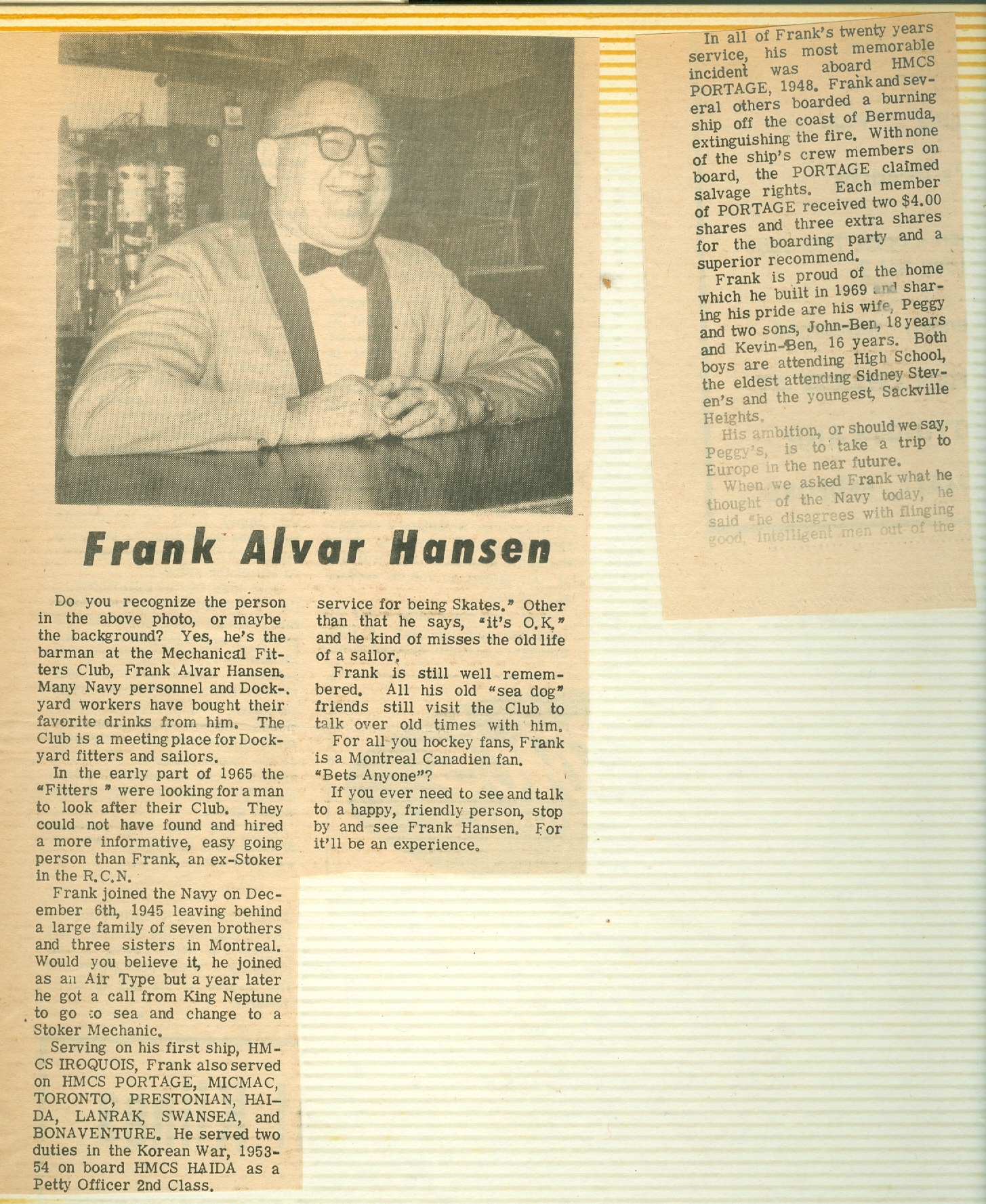 HANSEN, Frank Alver - age 86, of Middle Sackville, passed away on August 10, 2013, in Camp Hill Veterans' Memorial Building, QEII. Born in Montreal, Que., he was a son of the late Otnar and Cecelia (Donnelly) Hansen. Frank served in the Royal Canadian Navy from December 1945 to December 1965, including two terms in Korea onboard HMCS HAIDA. After retirement from the Navy, he worked for 18 years at the Chiefs and PO's Mess at Windsor Park until retiring in 1992. He was a lifetime member of the Chief 's and PO's Association. Frank is survived by his wife of 50 years, Margaret (Cook); sons, John (Deborah) Benn, Middle Sackville; Kevin Hansen, Perotte; sister, Rita Fisher, British Columbia; brother, James (Pat), Ontario; grandchildren, Andrew, Scott (Amanda), Holly (Clinton) Fallon; great-grandchildren, Madison, Myles, Tiana, Haley, Adrian; many nieces and nephews. Frank was predeceased by brothers, Francis, Gerald, Peter, Thomas, Leo and Leonard; sisters, Kathleen Hanson and Martha Raymond. Cremation has taken place. A memorial service will be held on Thursday, August 15th, at 2 p.m., in Atlantic Funeral Home, 125 Sackville Dr. Interment at sea to take place at a later date. Memorial donations may be made to a charity of choice.