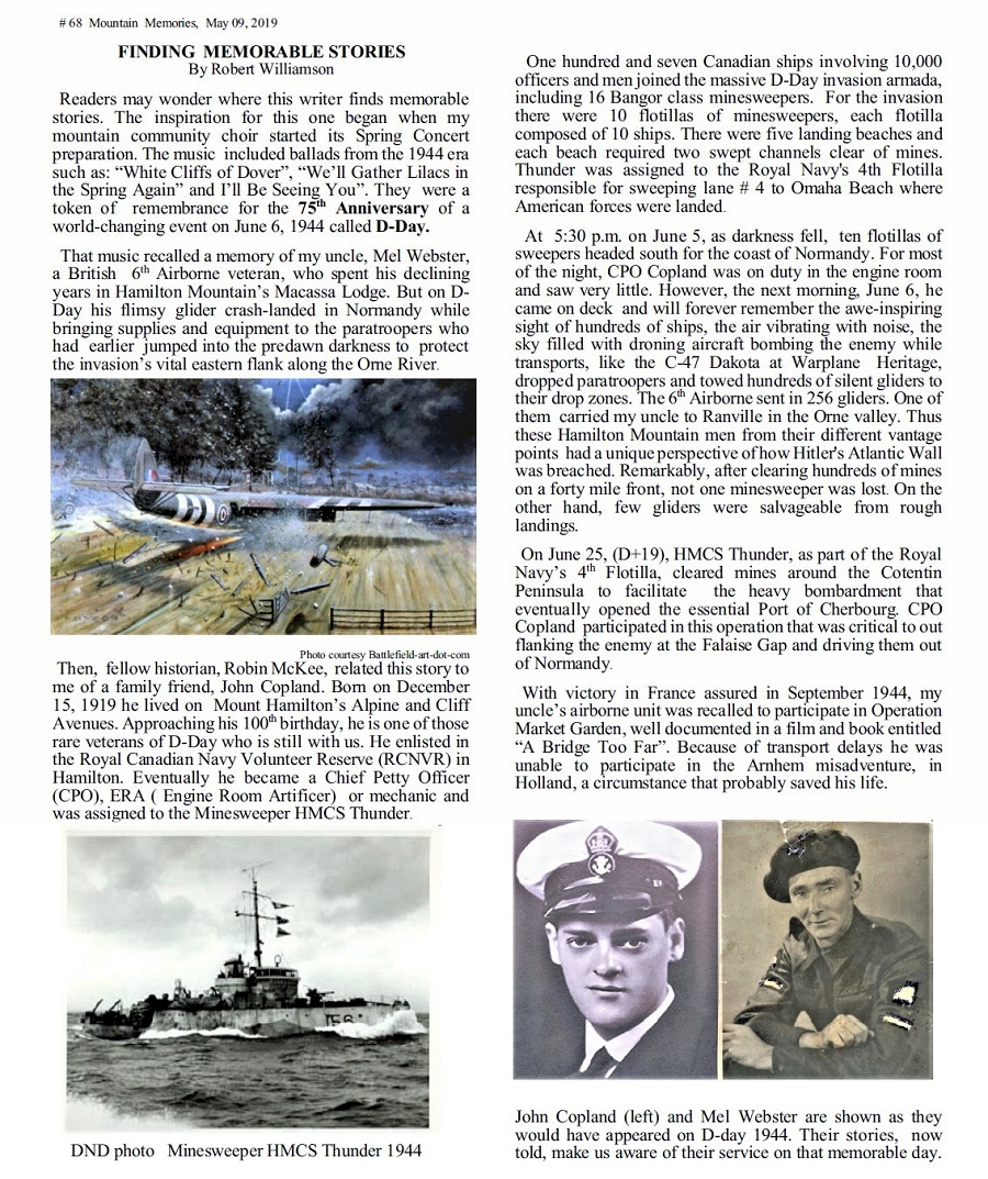 COPLAND, John Alexander - RCNVR 1941-45 Retiree - Frost Steel & Wire (48 yrs.) Past Councillor, Stoney Creek (32 yrs.) A very kind, considerate, strong but gentle man, has left this world. John Copland passed away peacefully at Joseph Brant Hospital, Burlington, Ontario, on Thursday, August 15, 2019 in his 100th year. Husband of the late Mary Kodman (d. 1982). Loving partner of Joan Bannerman for 35 years. Most cherished father of Arlene Copland (St. Catharines) and step-father of Lorraine Bannerman (Robin McKee) and Gregg Bannerman (Shirl Ward). Predeceased by his father, A. Stuart Copland (d. 1950), and mother, Beatrice (nee Alexander) (d. 1987). Loving brother of Alice (d. 1991), Frances Batoff (Perth, ON), Audrey Whittle (Hamilton, ON), and Ila (d. 2014) and uncle to several nieces and nephews. Well respected, former Councillor of Stoney Creek, Retiree of Frost Steel & Wire (Stelco), and Canadian Navy WWII Veteran (including D Day). Special thanks to the Community Health Care Team, and the staff at Joseph Brant Hospital for their wonderful care. Cremation has taken place. Friends will be received at the Donald V. Brown Funeral Home, 36 Lake Ave. N., Stoney Creek, Ontario on Friday, August 23rd from 5-8 p.m. The Funeral Service will be held in the funeral home chapel on Saturday, August 24th at 3 p.m. Interment at Mountview Gardens at a later date. If desired, in lieu of flowers, donations to The Salvation Army, P.O. Box 933, Hamilton, Ontario L8N 3P9 and/or The Stoney Creek Community Food Bank, 605 Hamilton Regional Rd. 8, Hamilton, ON L8G 5G2 would be very much appreciated. (The Hamilton Spectator 15 Aug 2019)