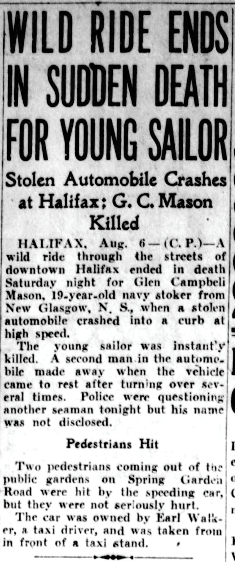 Stoker 1st Class Glenn Campbell Mason was a fire truck driver before he enlisted into the R.C.N.V.R. on March 24, 1943. He was killed in a car accident in Halifax, Nova Scotia. Glenn was an occupant of a car that was speeding and struck a curb on Spring Garden Road, Halifax and overturned several times. Stoker 1st Class Mason was taken to the hospital but death had occurred before arrival.
