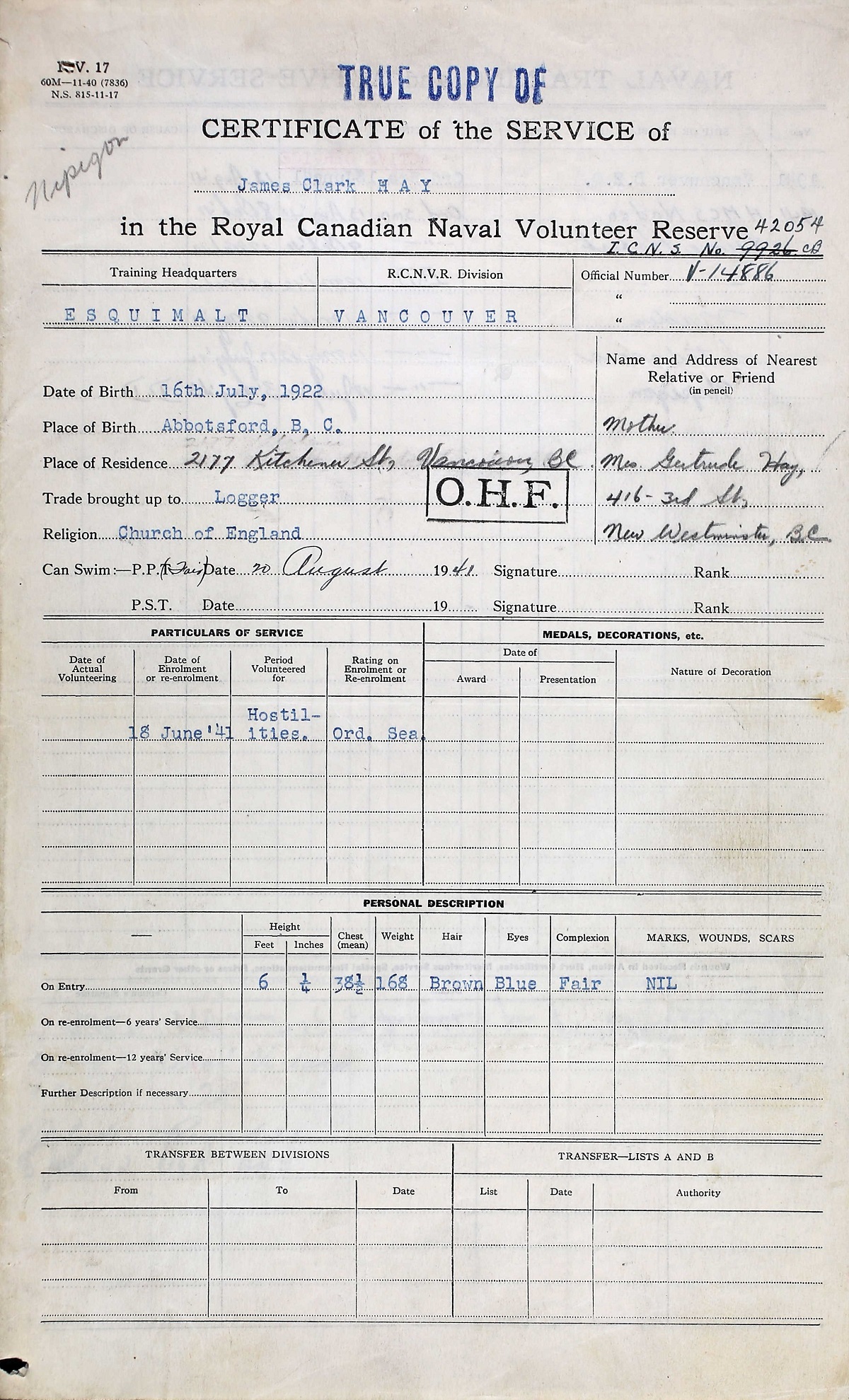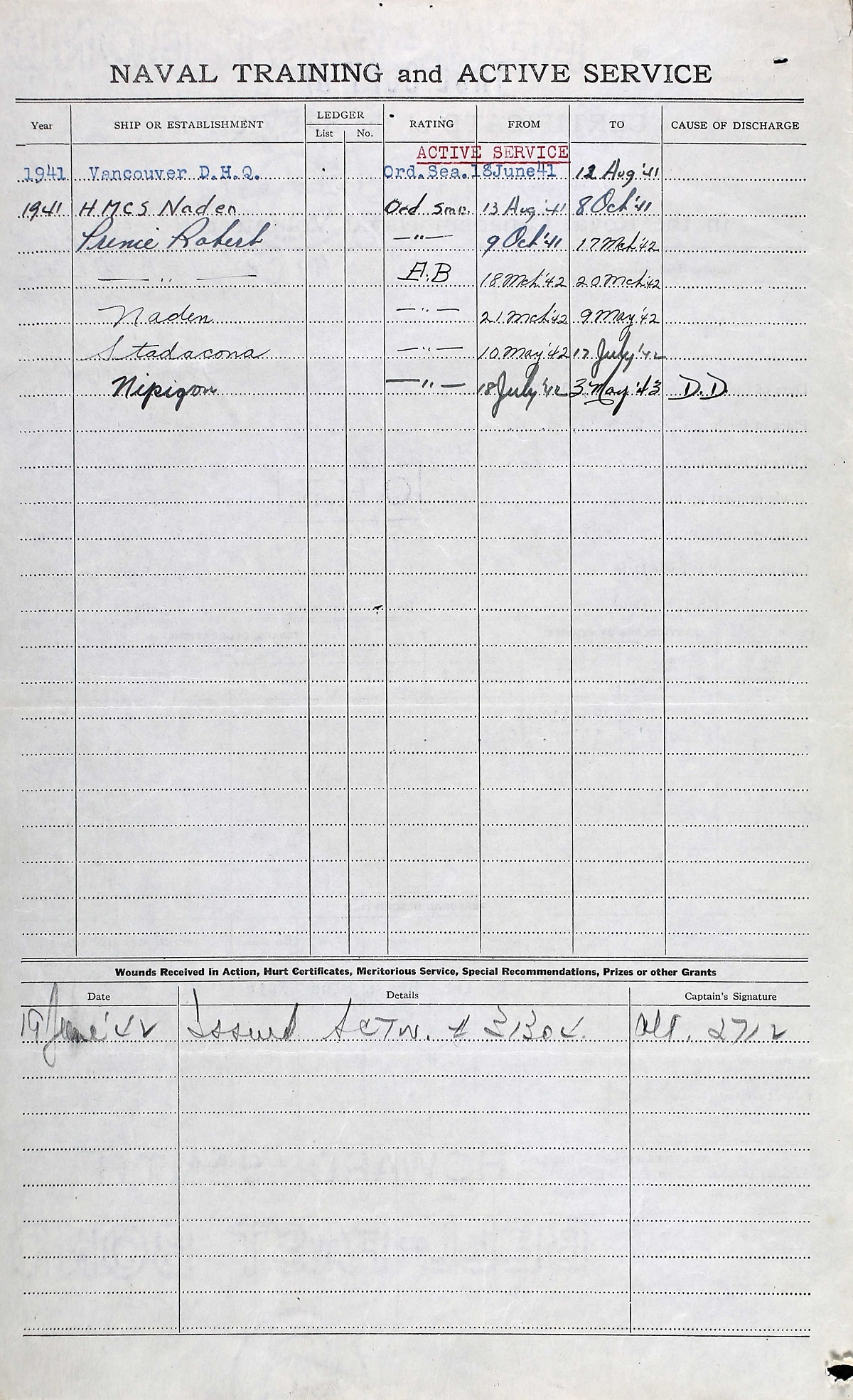Ships served in: VANCOUVER DIVISION RCNVR - Commenced Active Service 18 Jun 1941 HMCS PRINCE ROBERT - Served in PRINCE ROBERT as an OS and AB, RCNVR. Rated AB 18 Mar 1942 HMCS NIPIGON - Drafted to NIPIGON 18 Jul 1942 as an AB, RCNVR