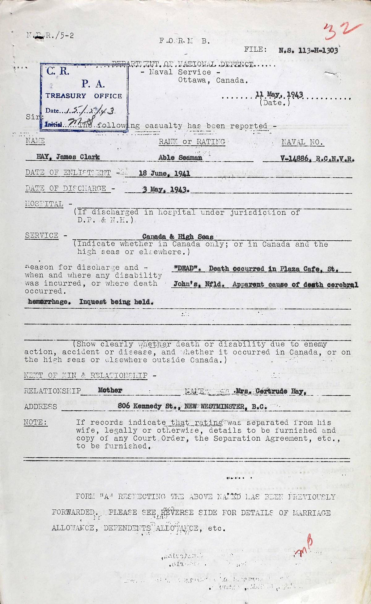 Able Seaman James Clark Hay died at the Plaza Café, St. John's, Newfoundland of an apparent cerebral hemorrhage. He is buried in the Anglican Cemetery, St. John's, Newfoundland.