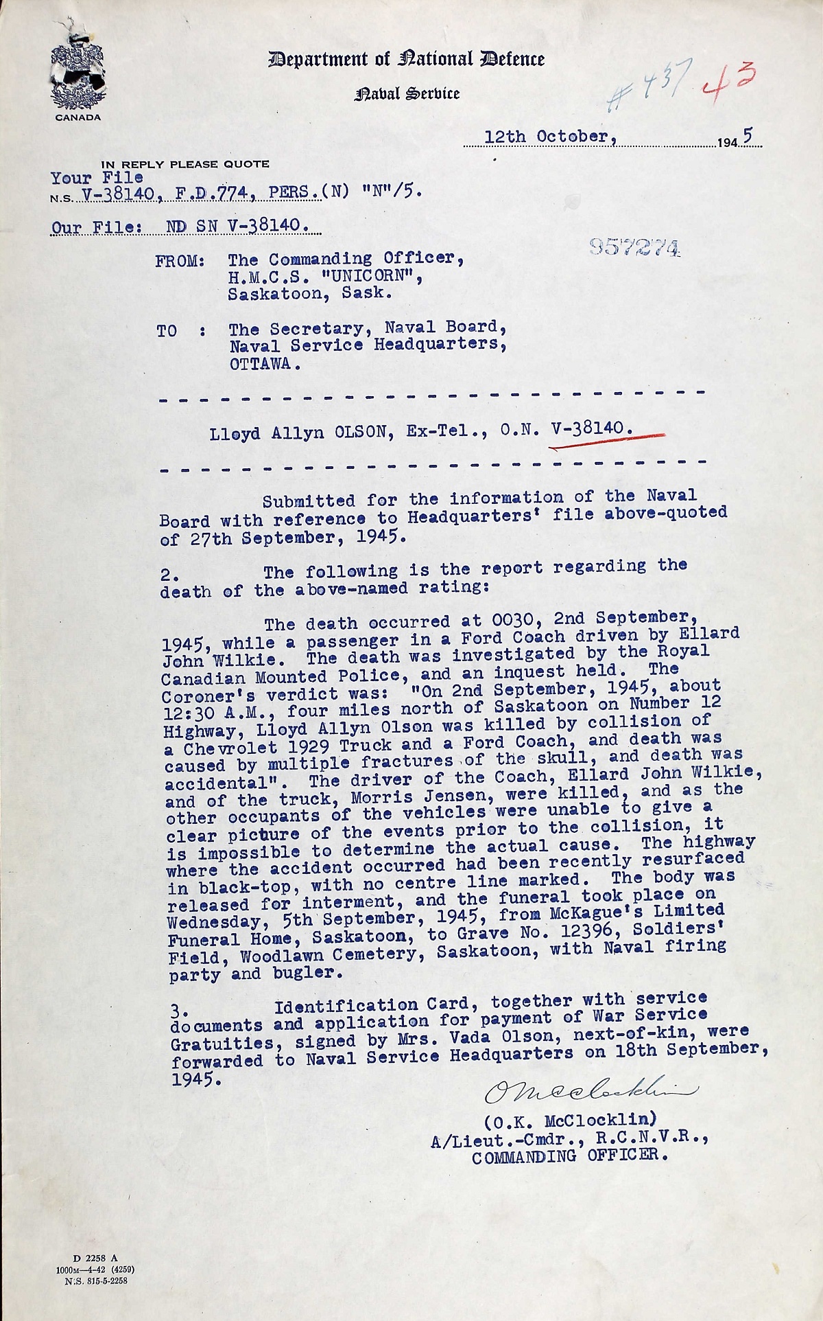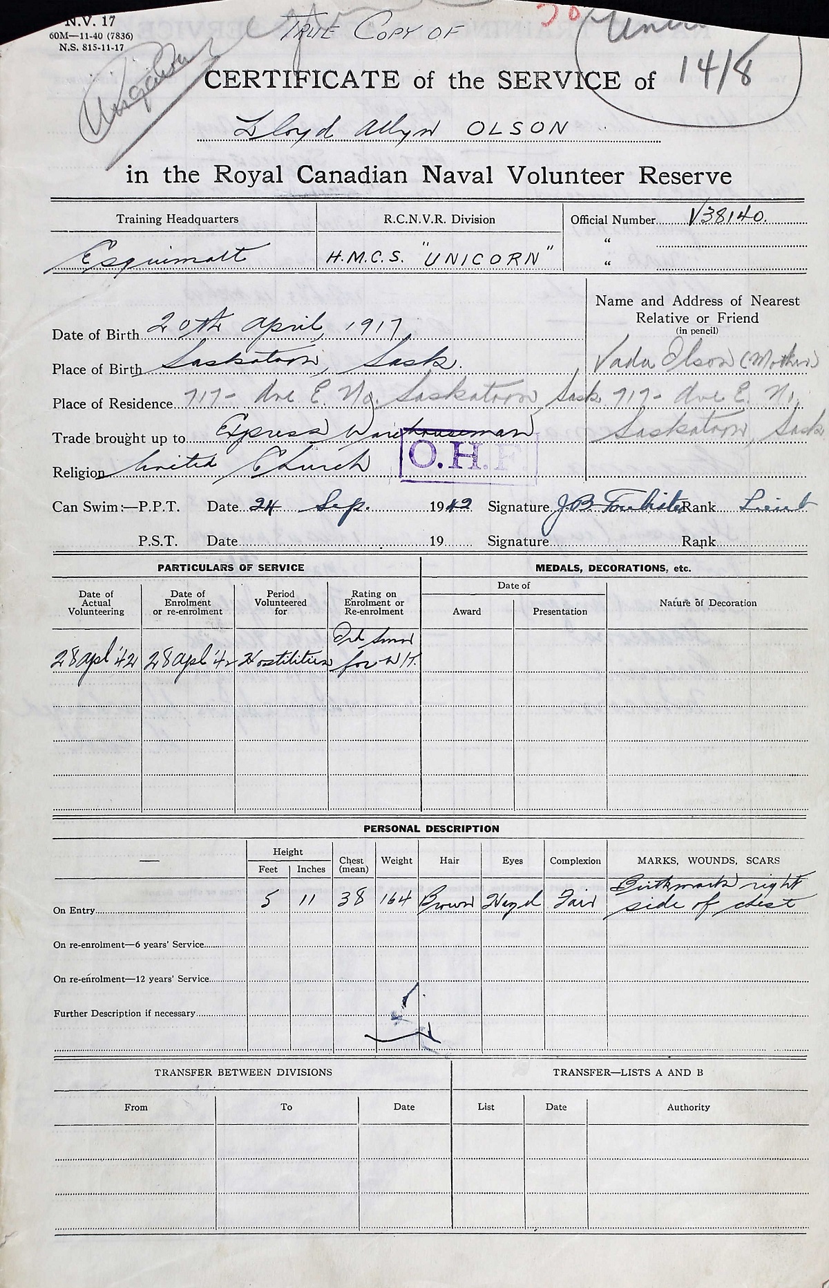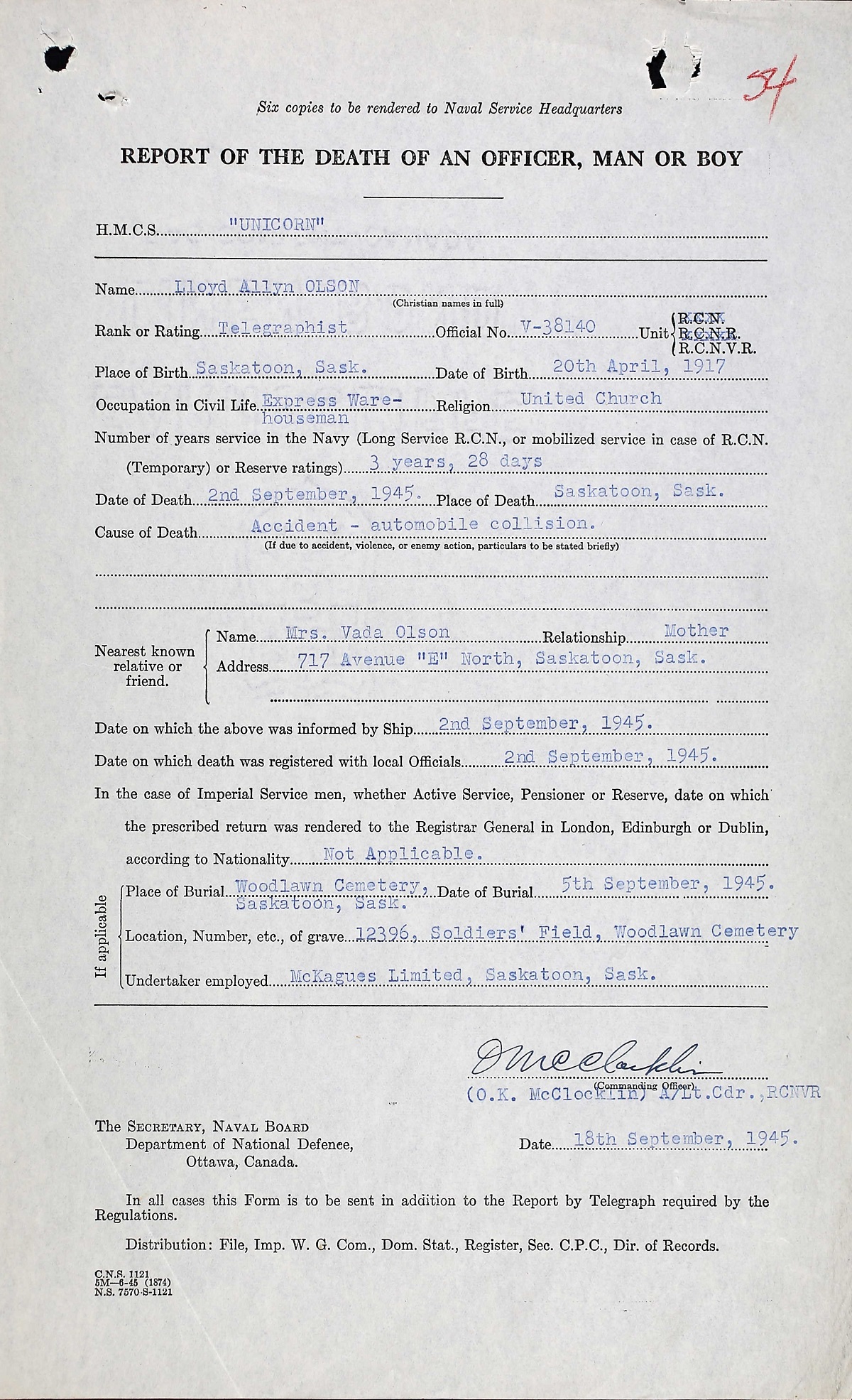 Telegraphist Lloyd Olson of Saskatoon was working as a warehouseman for CP Express when he enlisted on April 28, 1942 at Saskatoon, SK. He was killed in a two vehicle collision just north of Saskatoon while home on leave, two others were also killed. Tel Olson is buried in the Woodlawn Cemetery, Saskatoon, SK.