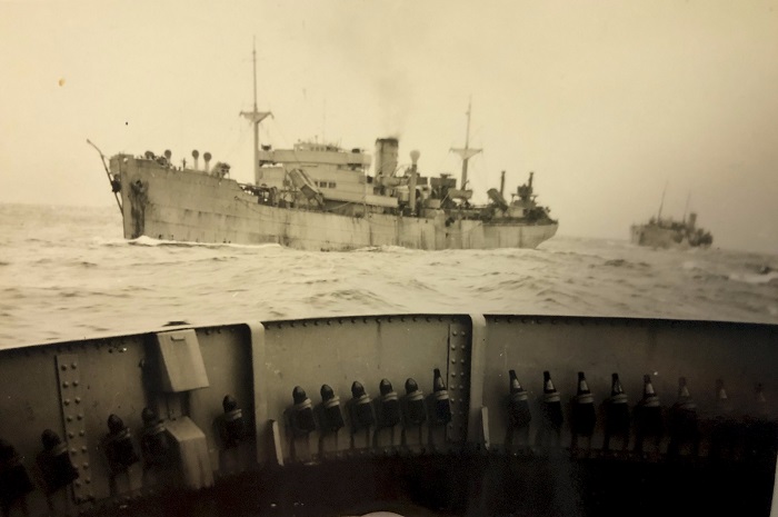 Merchant ships in convoy seen from the after gun-tub of HMCS LAUZON K671