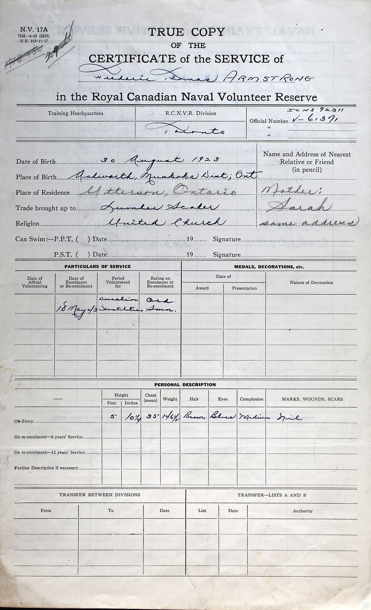 AB Frederick Armstrong's brother, Gordon William Armstrong, V49241, RCNVR was serving in HMCS RESTIGOUCHE when Ab Frederick Armstrong was killed in action.