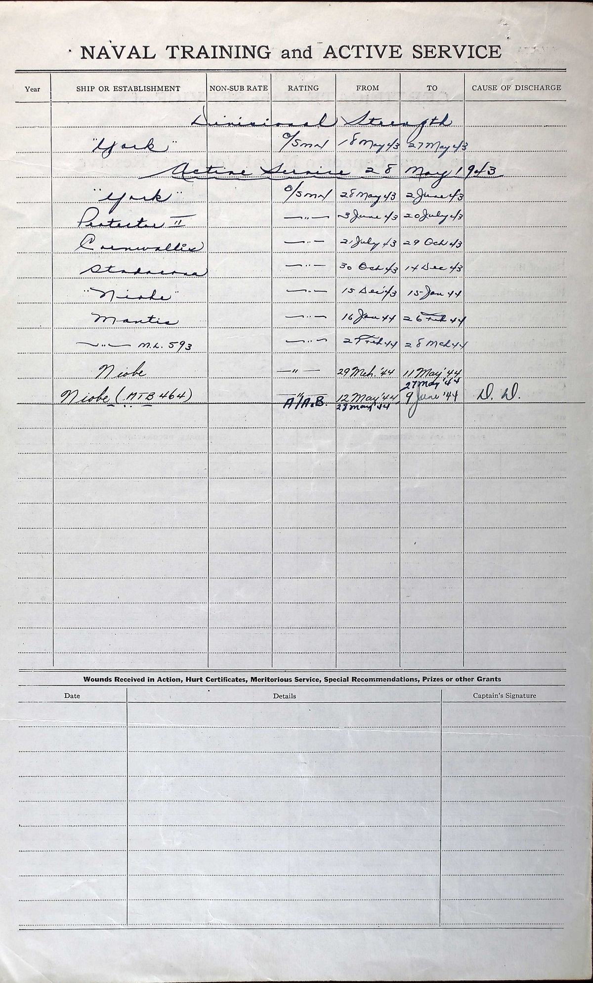 Ships served in: HMCS YORK - Enlisted 18 May 1943. Commenced Active Service 28 May 1943 HM ML Q593 (Royal Navy Motor Launch) - Served in ML 593 27 Feb 1944 - 28 Mar 1944 as an OS, RCNVR MTB-464 - Drafted to MTB-464 12 May 1944 as an OS, RCNVR. Rated A/AB 28 May 1944