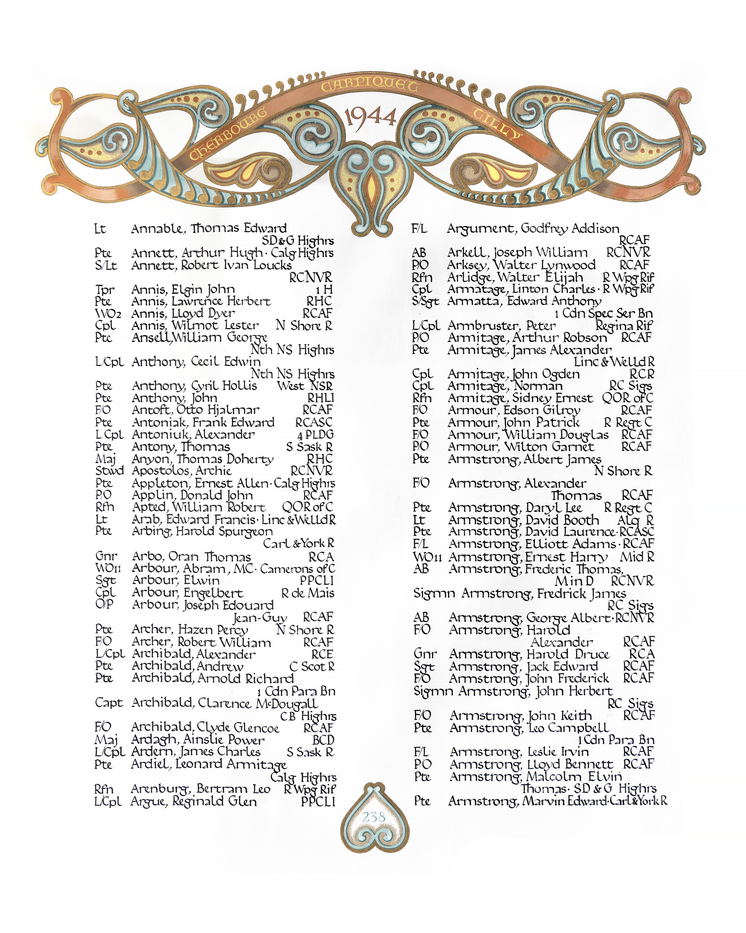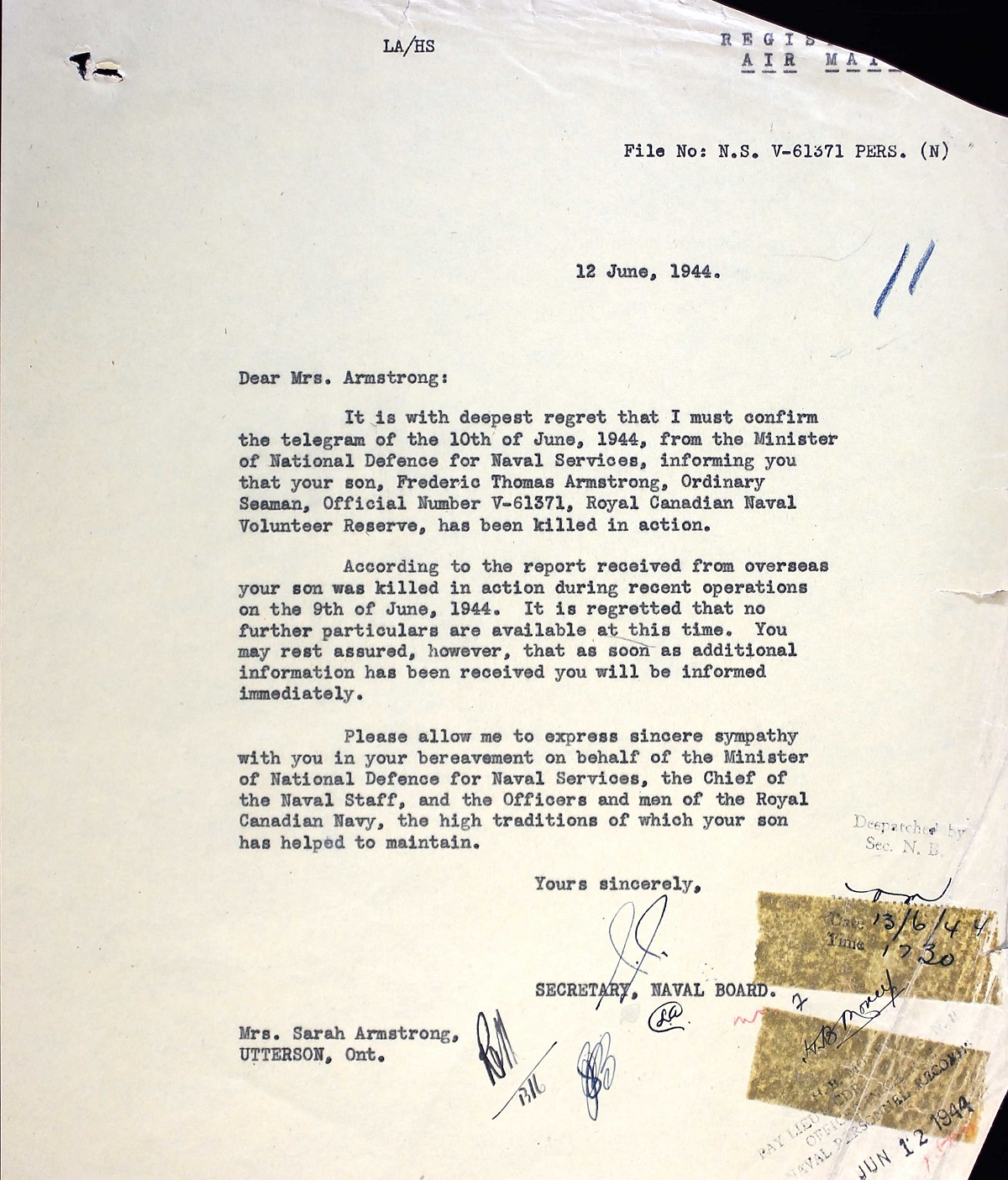 Citation of Mentioned in Despatches: ARMSTRONG, Frederick Thomas, Acting Able Seaman, V51371, Posthumous Mention in Despatches, RCNVR - Awarded as per Canada Gazette 20 January 1945 and London Gazette of 29 August 1944. "For gallantry, skill, determination and undaunted devotion to duty during the initial landings of Allied Forces on the coast of Normandy."