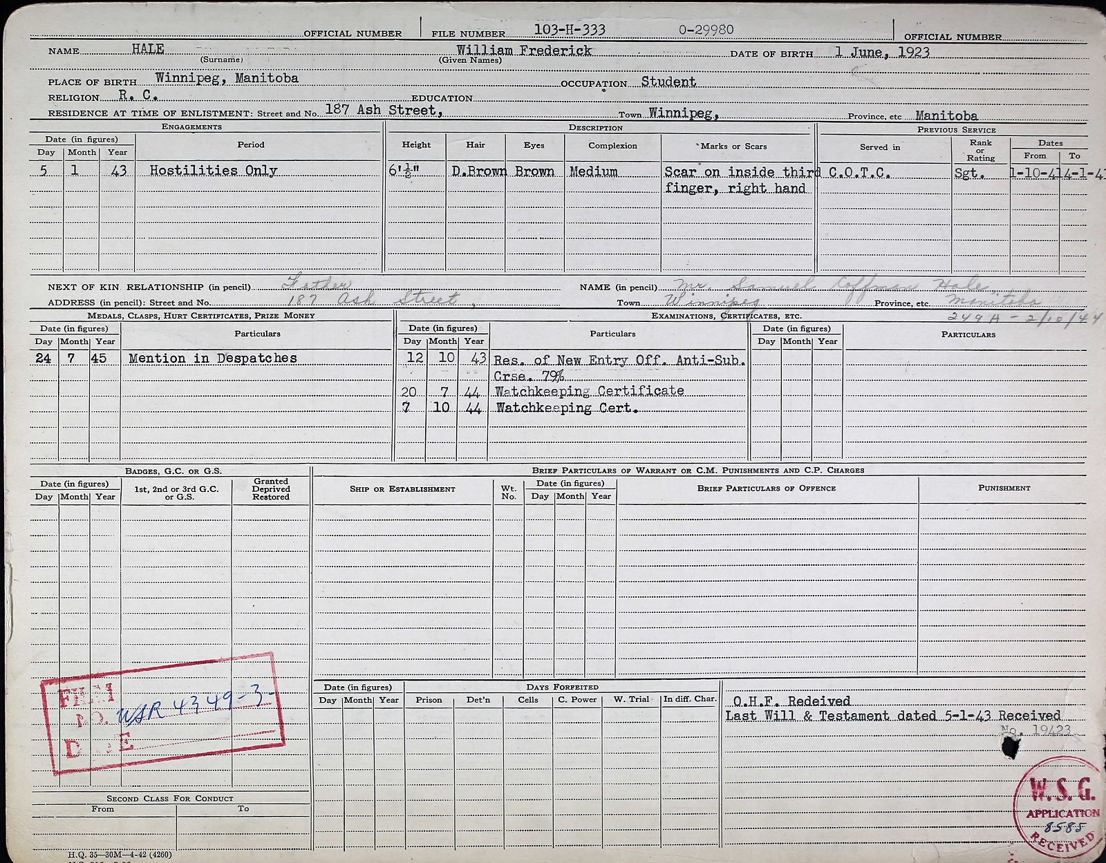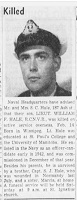 (WH01-WH02) Record of Service (WH03) Report of Death (WH04) Article from the Winnipeg Evening Tribune on the death of Lt William Hale