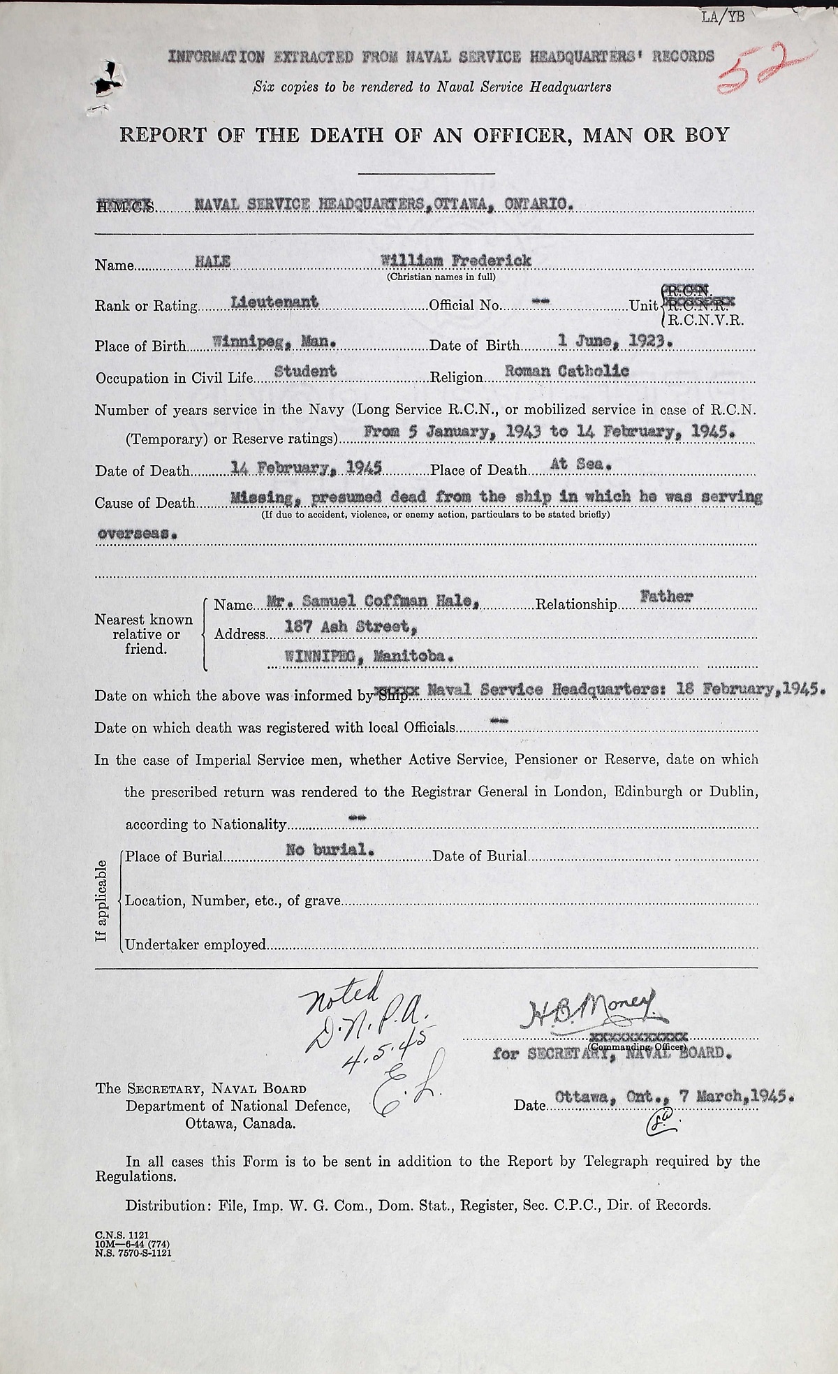 HALE, William Frederick Lt, RCNVR, MPK - 14 Feb 1945, MTB-466 - Son of Samuel Coffman and Helen Annie Hale, of Winnipeg, MB.