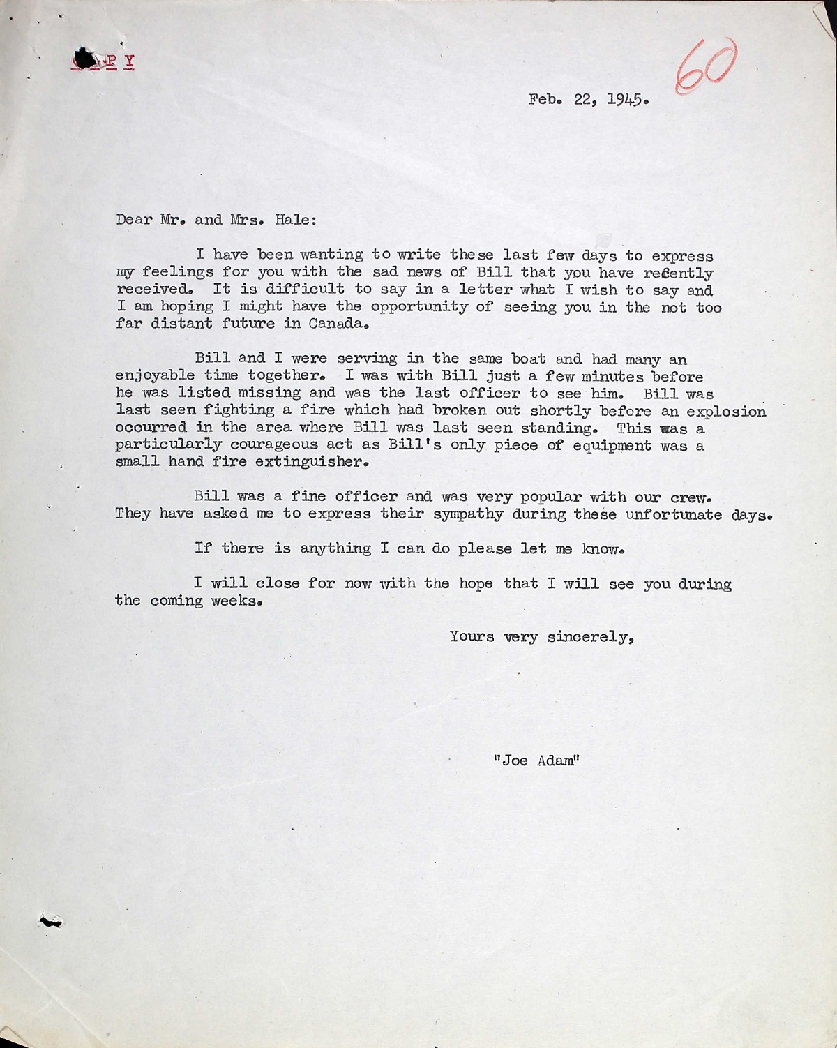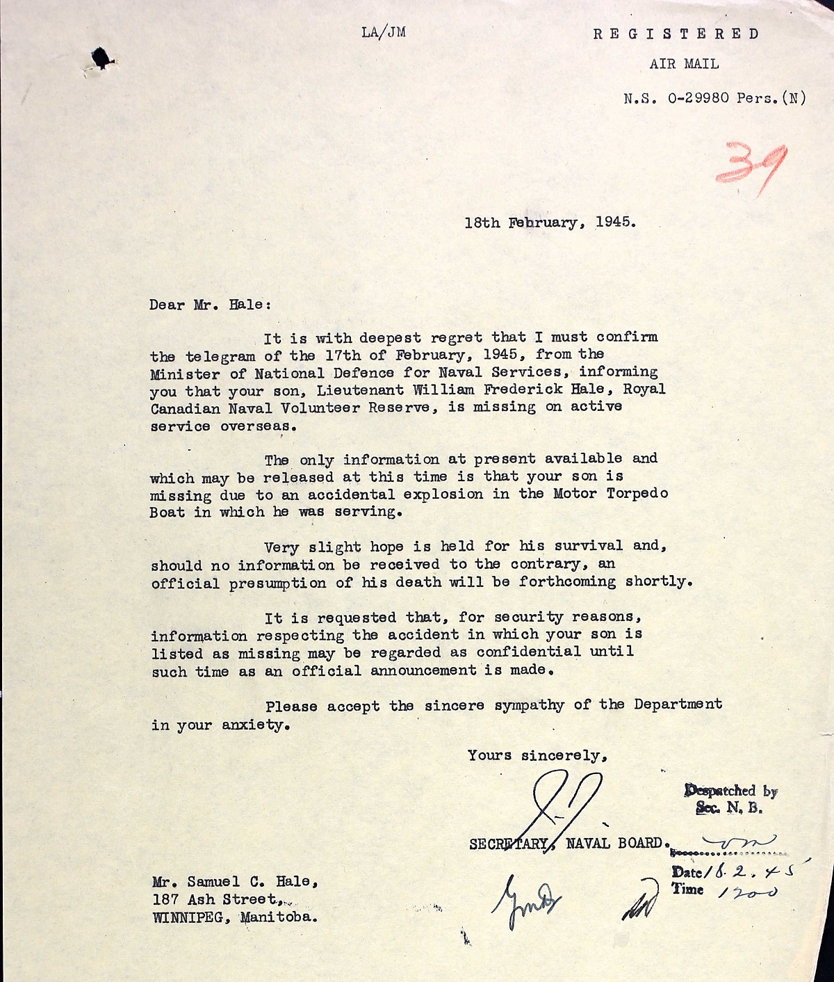 Lieutenant William Hale was killed in an accidental explosion on a motor torpedo boat in Belgium, his body was not recovered. During the afternoon of 14 February 1945, several flotillas including he 29th Canadian were tied up at Ostend Harbour. Highly volatile gasoline had been washed into the water and became ignited. A wall of flames engulfed the MTBs and five of the eight boats of the 29th Flotilla were destroyed along with seven British boats. There were 26 Canadians and 35 British sailors killed in the fire.