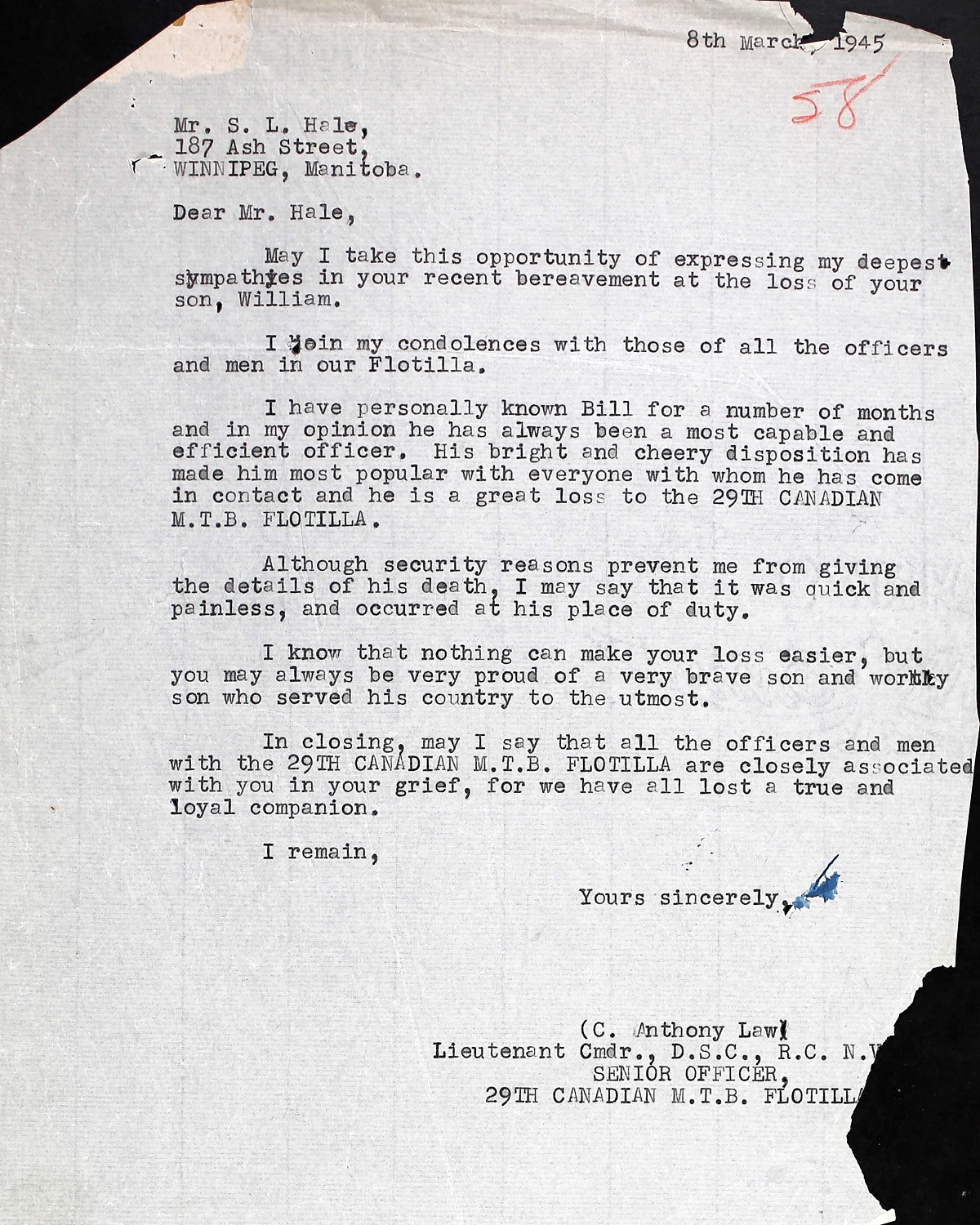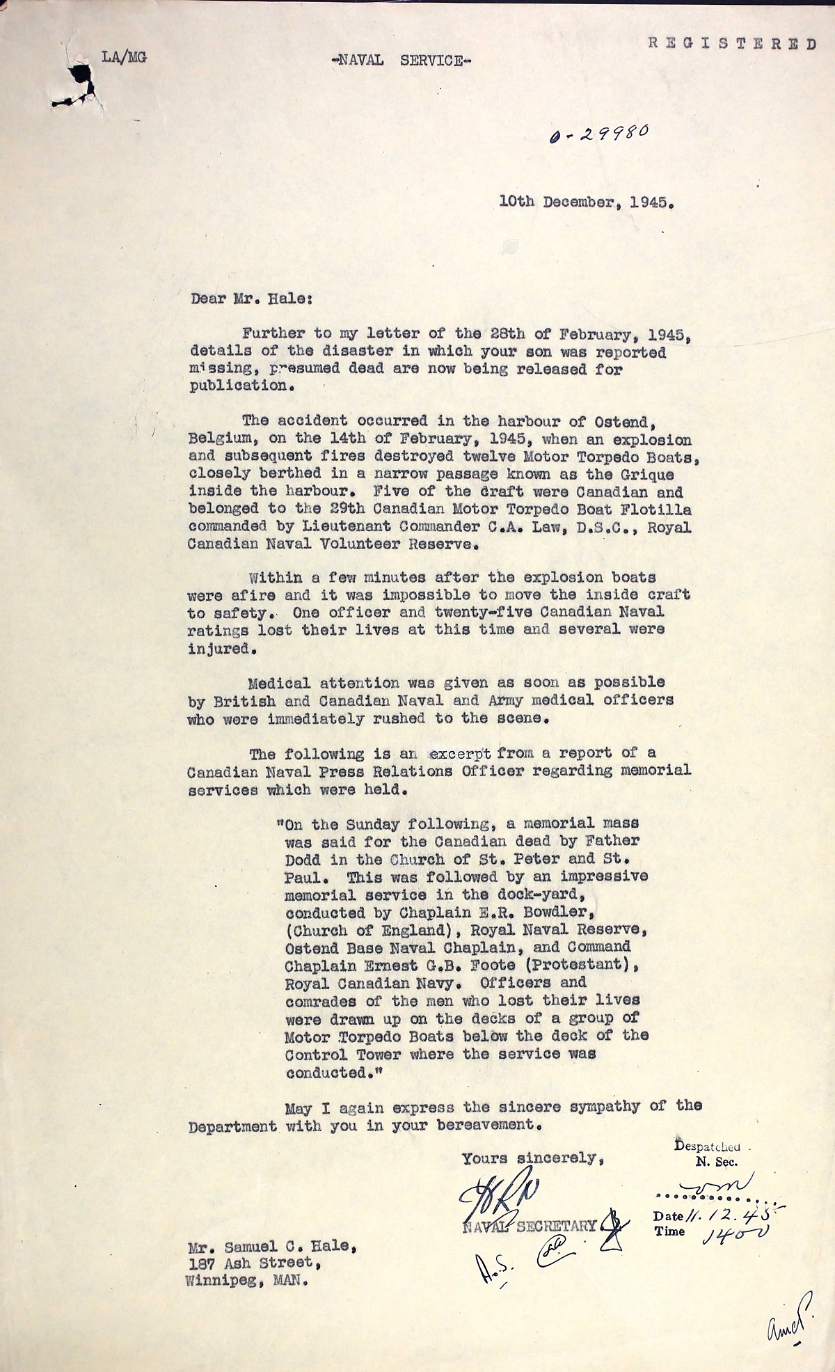 Mentioned in Despatches Citation: HALE, William Frederick, Lieutenant, Mention in Despatches (Posthumous), RCNVR, MTB-466, 29th Canadian MTB Flotilla - Awarded as per Canada Gazette of 15 September 1945 and London Gazette of 24 July 1945. "For good services in a fire at Ostend, 14th February 1945."