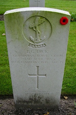 Able Seaman B. G. Dick was killed when a fire in OStend Harbour, Belgium caused an explosion and destruction of a number of MTBs; his body was recovered and is buried at the Adegem Canadian War Cemetery, Belgium.
