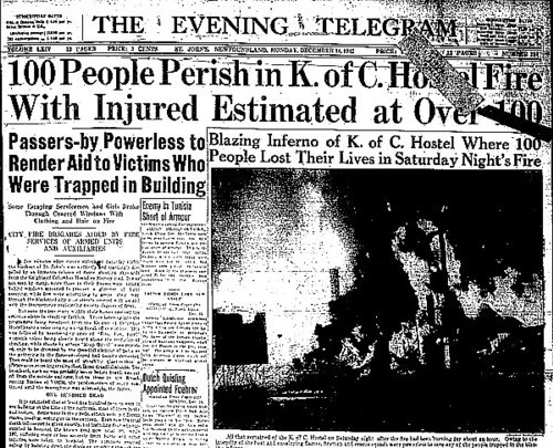 On Saturday, December 12, 1942, many people in St. John's were sitting at home behind their blackout curtains, listening to "Uncle Tim's Barn Dance" on the radio station VOCM. This weekly program was broadcast live from the Knights of Columbus Leave Centre on Harvey Road in St. John's. Just after 11:00 pm, people listening to the broadcast heard the singer on stage break off in the middle of a song, then someone shouted "Fire, fire." Sounds of people panicking could be heard, then smashing glass, then the broadcast went silent.