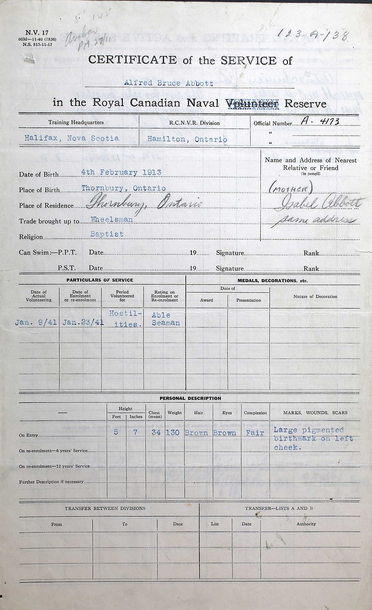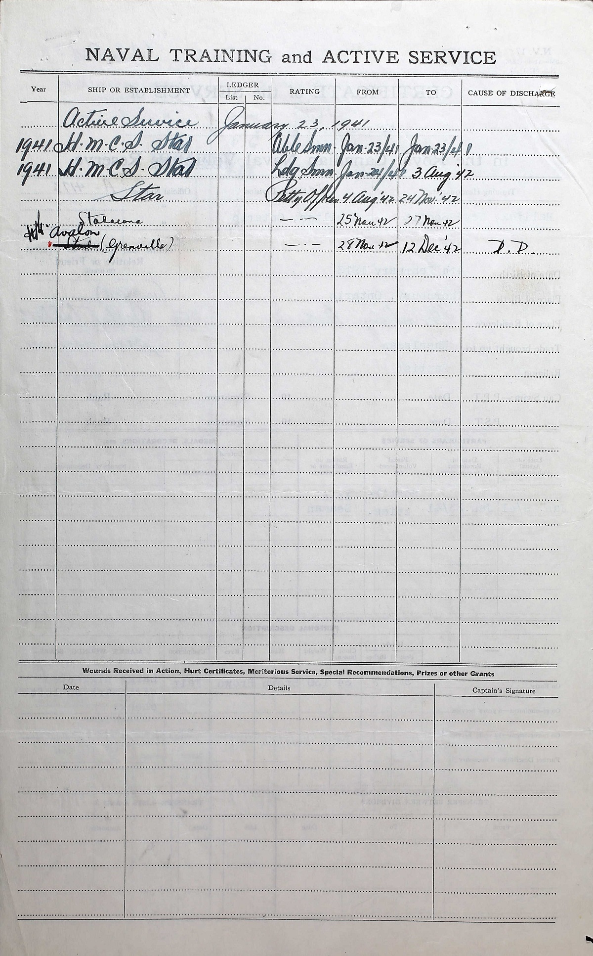 Ships served in: HMCS STAR - Enlisted 23 Jan 1941 as an Able Seaman, RCNR. Commenced Active Service 23 Jan 1941. Rated Leading Seaman 24 Jan 1941. Rated Petty Officer 04 Aug 1942 Tug GRENVILLE - Drafted to GRENVILLE 28 Nov 1942 as a Petty Officer, RCNR