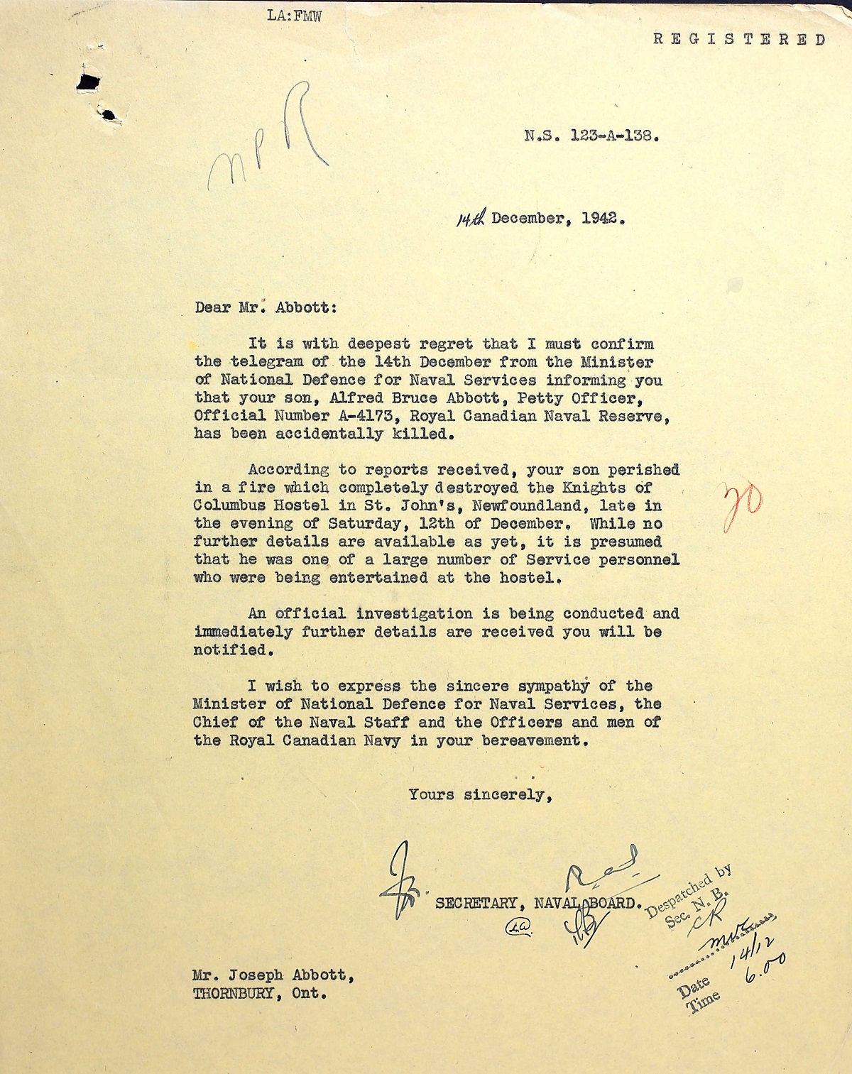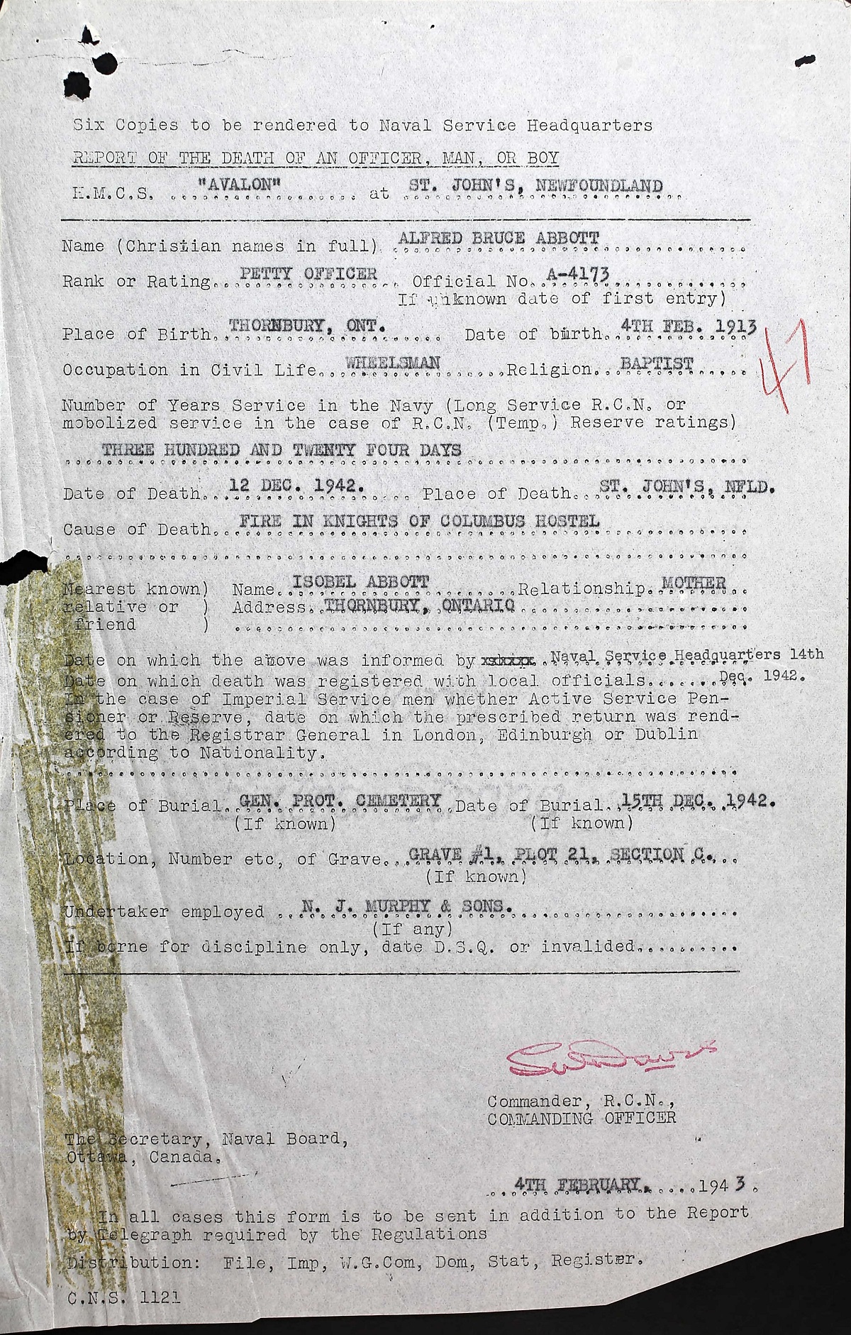 Alfred died on 12 Dec 1942 in the fire at the Knights of Columbus Service Hostel in St. John's, NFLD. He is buried in the Mount Pleasant Cemetery, St. John's, Newfoundland.