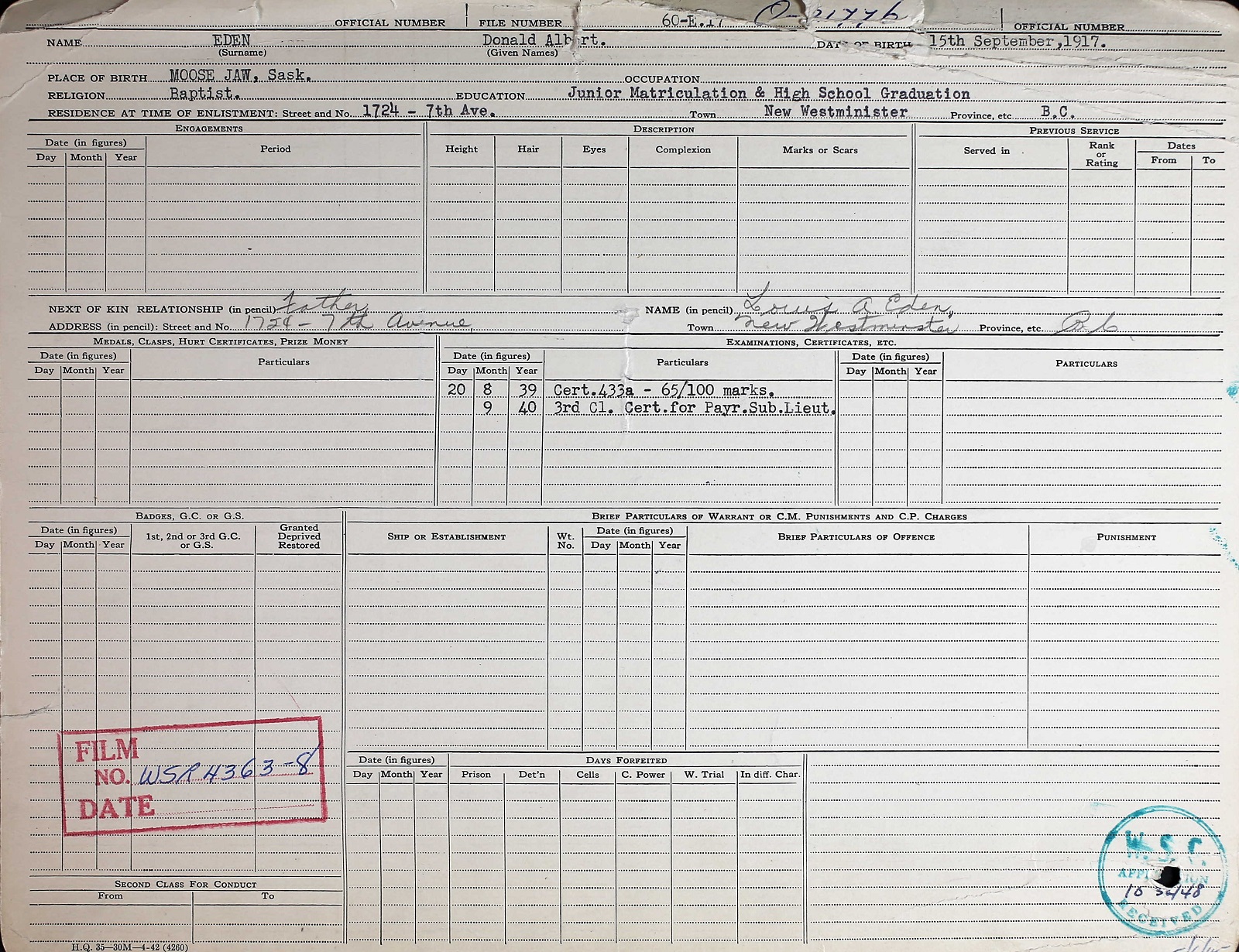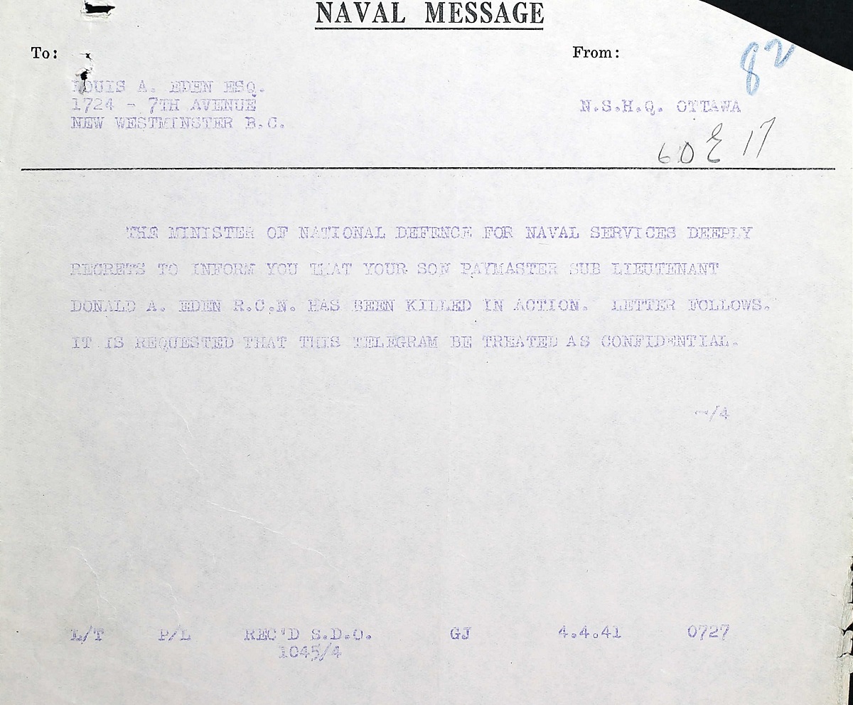 Sub-Lieutenant Donald Albert Eden, age 21 was well known in New Westminster. He was a former carrier for the Vancouver Sun in New Westminster has been killed in action with the Royal Navy, aboard HMS BONAVENTURE according to a casualty list released by Ottawa. Sub-Lieutenant Eden was born in Moose Jaw and is the eldest son of Mr. and Mrs. Louis A. and Helen Eden, 1724 Seventh Avenue, New Westminster and had been with the navy since August 1937. He was educated at New Westminster graduated from Duke of Connaught High School. Donald was born at Moose Jaw, Saskatchewan and was a student when he enlisted on April 19, 1937 at Esquimalt British Columbia. In August 1937 he went to England and received his commission as a sub lieutenant in August 1940. He also served on the H.M.S. Royal Oak, Berwick, and Orion and was with the HMS BONAVENTURE when he was killed. He last saw his parents in 1939 when HMS ORION visited Vancouver. Besides his parents he leaves a brother, Charles.