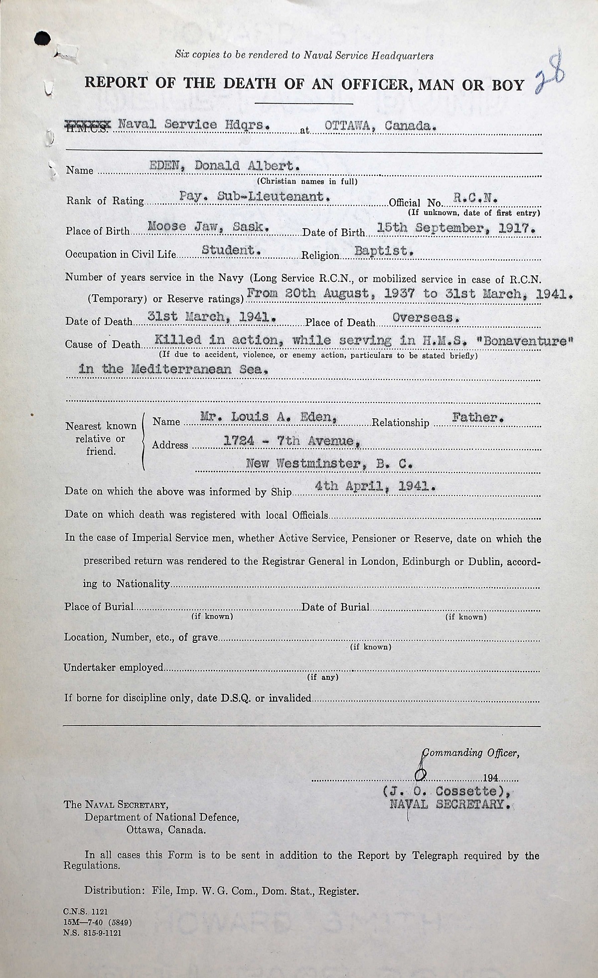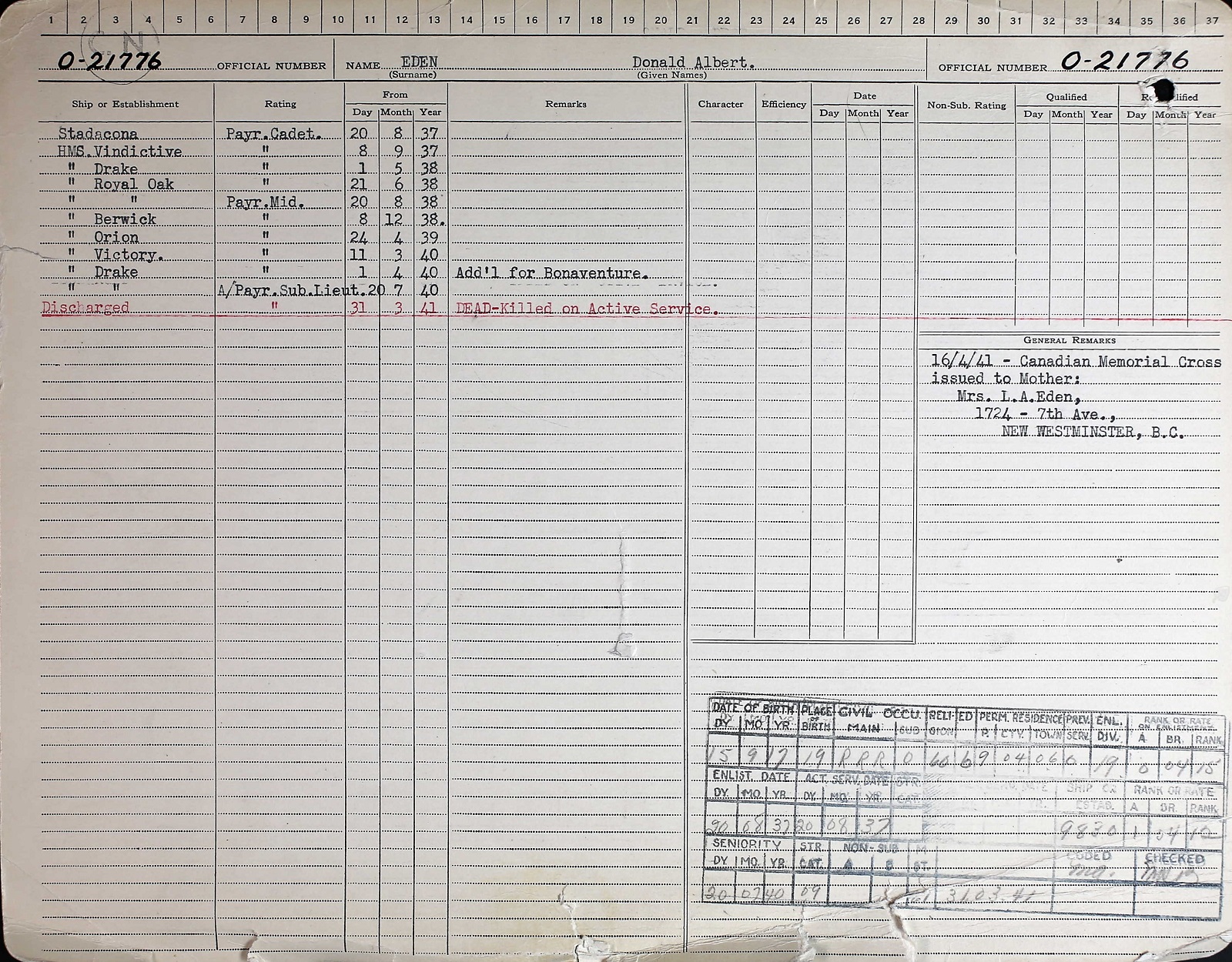 EDEN, Donald Albert, Paym-SLt, O-21776, RCN, MPK - 31 Mar 1941, HMS BONAVENTURE - Son of Louis A. and Helen Eden, of New Westminster, BC.