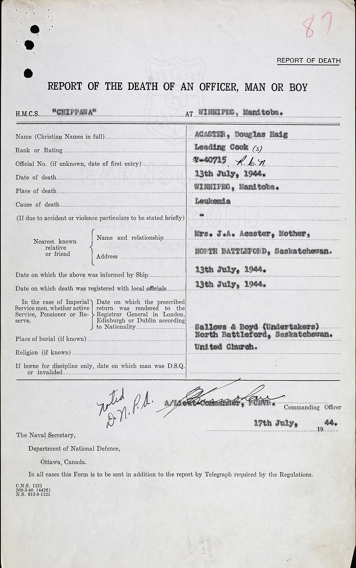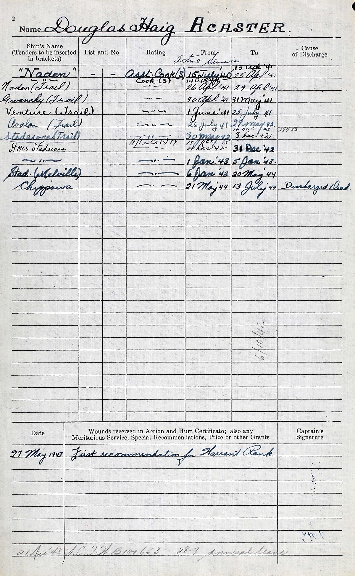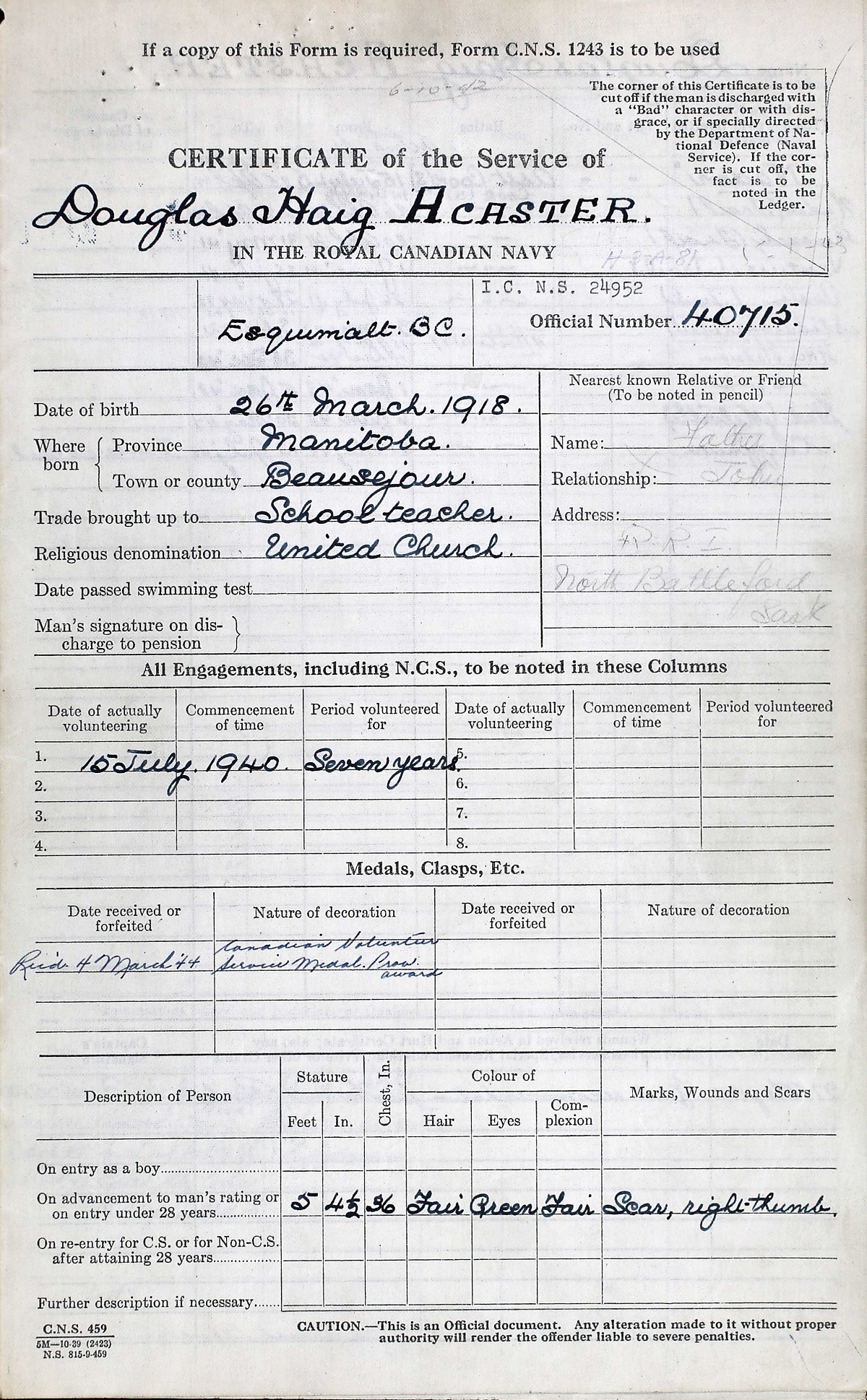 Douglas Acaster was a working as a teacher when he joined the RCN. He served in Canada, in Newfoundland and at sea. He had 1,460 days of service, including 1,084 overseas. He died in Winnipeg General hospital due to leukemia. L/Cook Acaster is buried in the North Battleford Cemetery, North Battleford, SK.