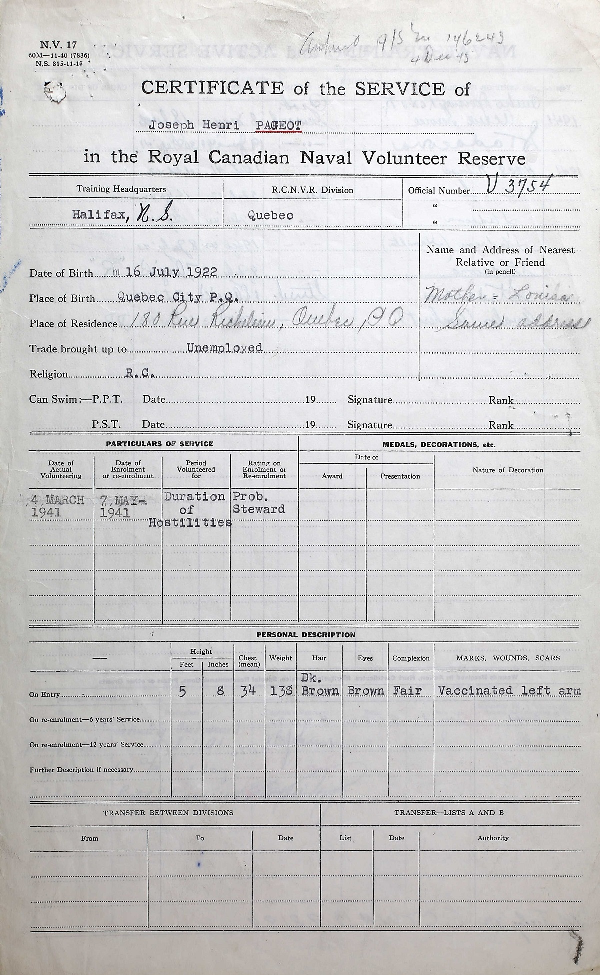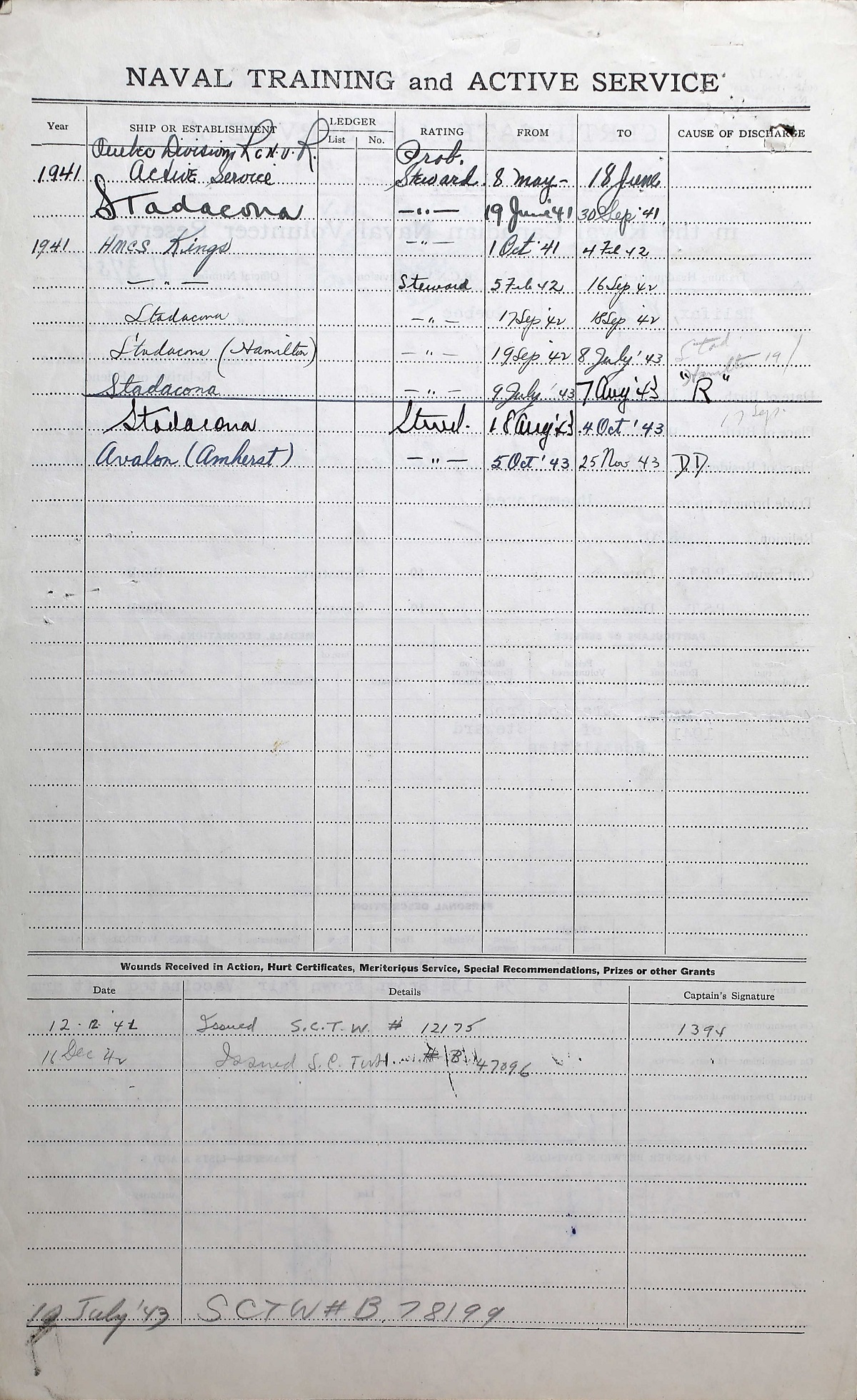 Ships served in: QUEBEC DIVISION RCNVR - Enlisted 07 May 1941 as a Prob. Steward. Commenced Active Service 08 May 1941 HMCS HAMILTON - Served in HAMILTON 19 Sep 1942 - 08 Jul 1943 as a Steward, RCNVR HMCS AMHERST - Drafted to AMHERST 05 Oct 1943